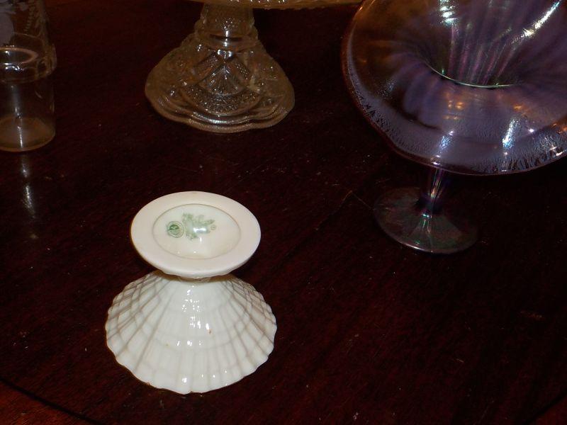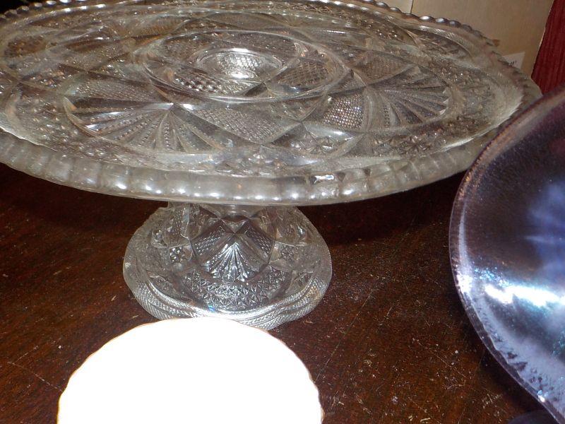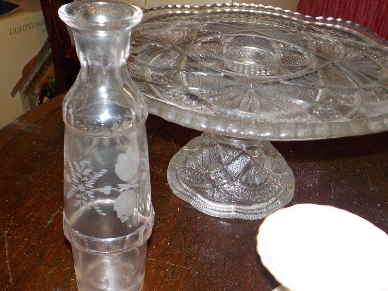 Cake dish 12 in. flower vase 8 in., glass etched, and white glass shell.