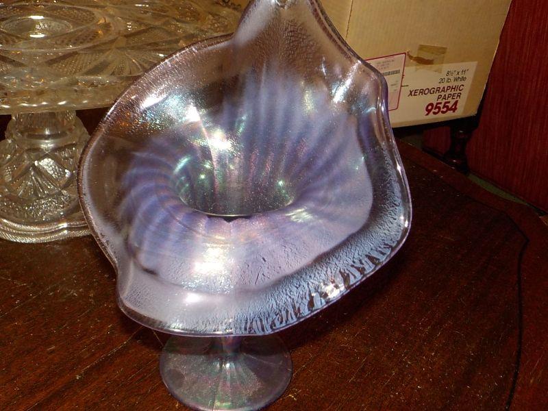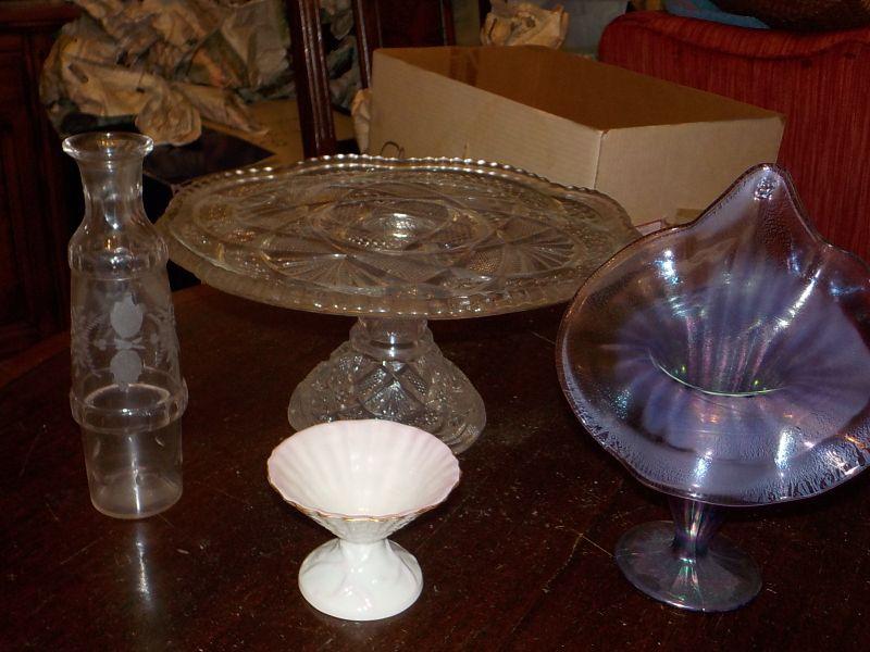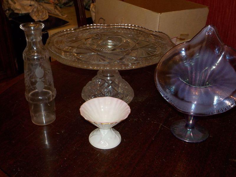 4 - Amazing collector glass ware., cake dish, flower vase, mini decanter, shell dish.