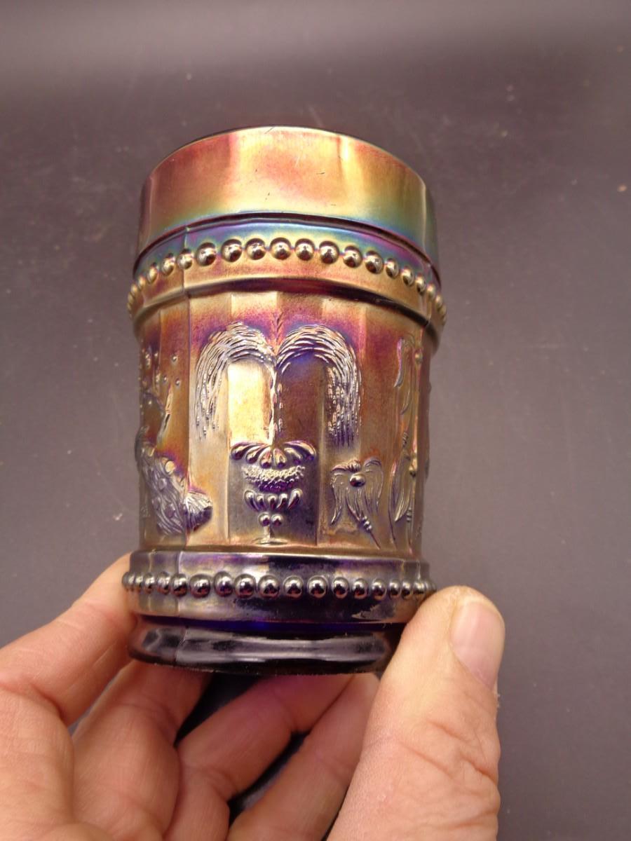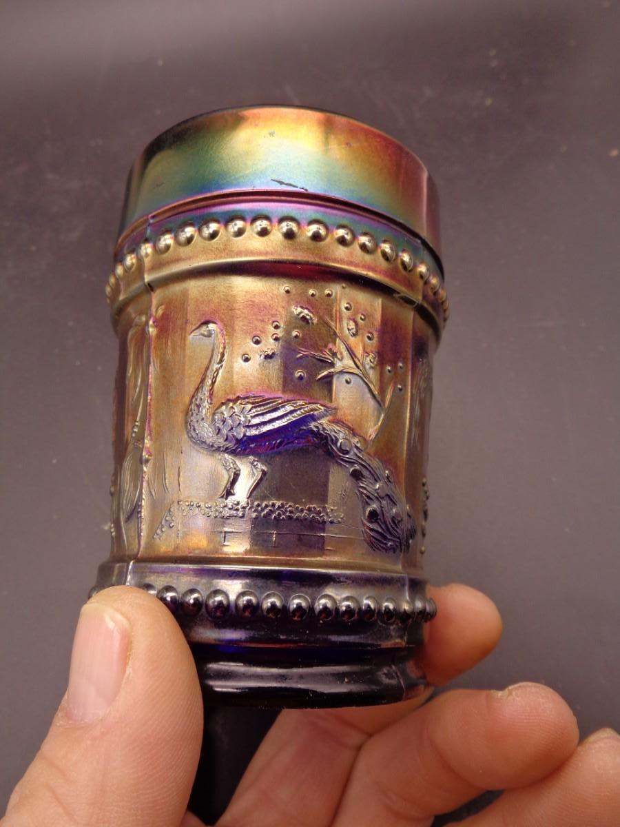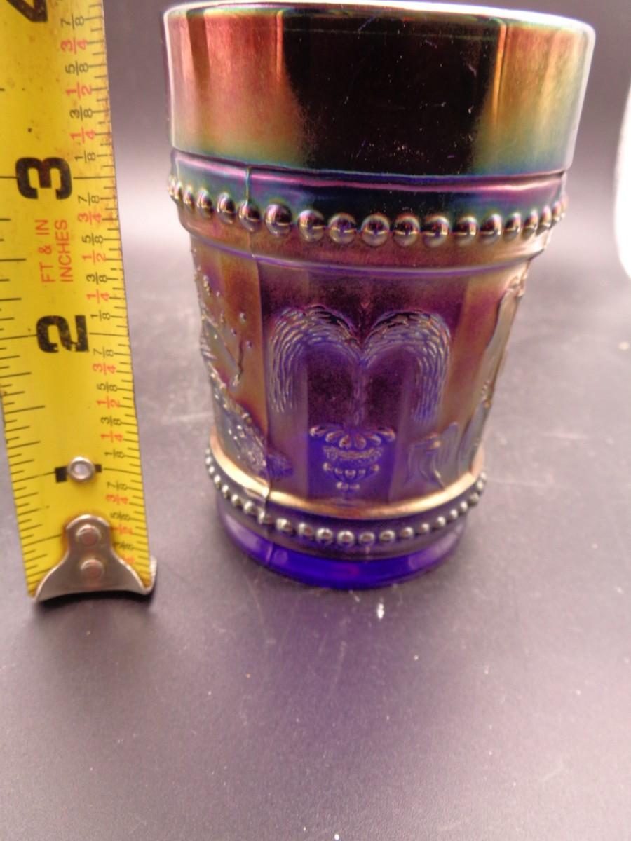 4" Antique Dugan BI Carnival Glass Tumbler "Peacock At The Fountain" #89