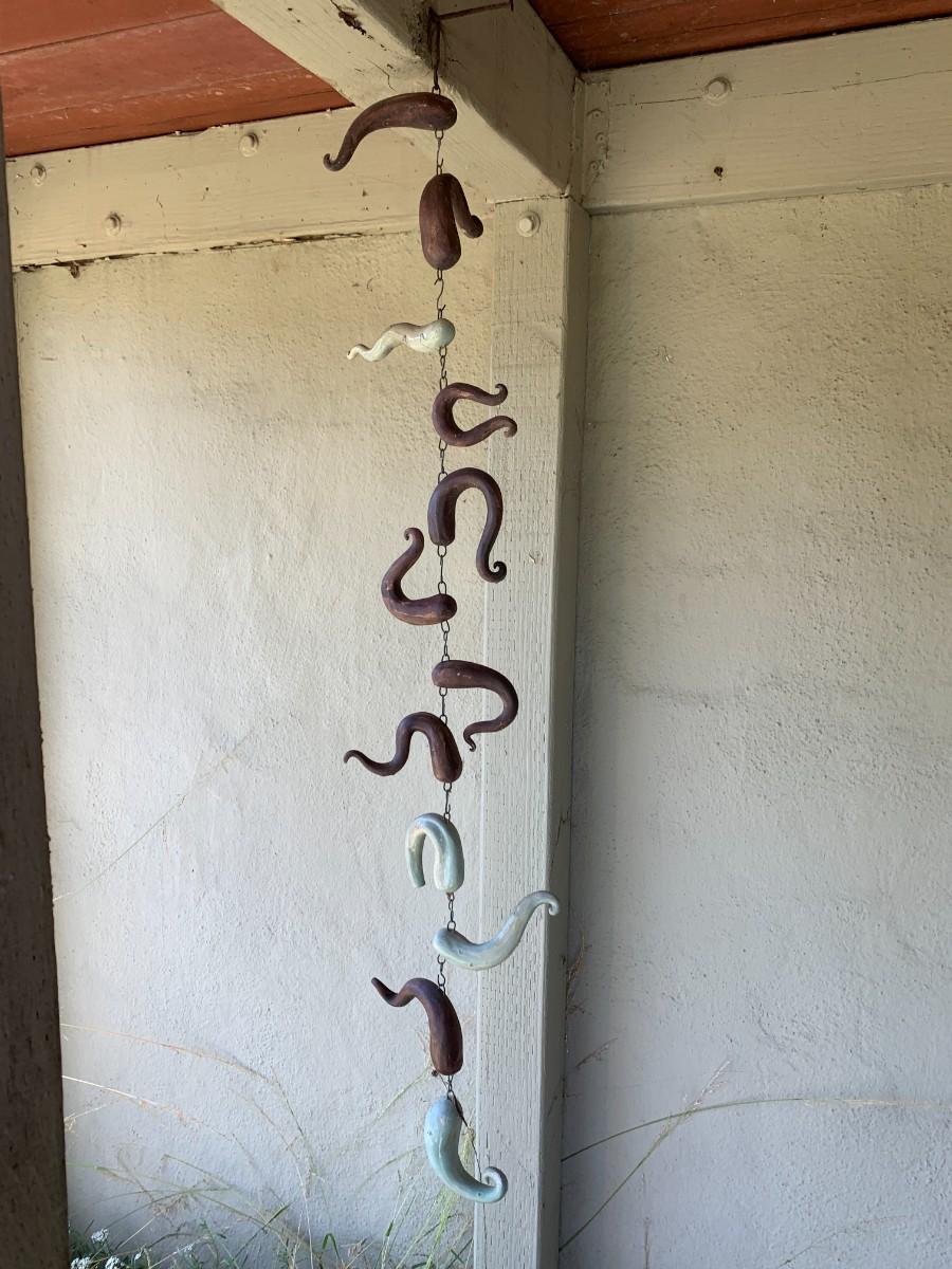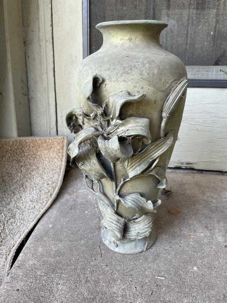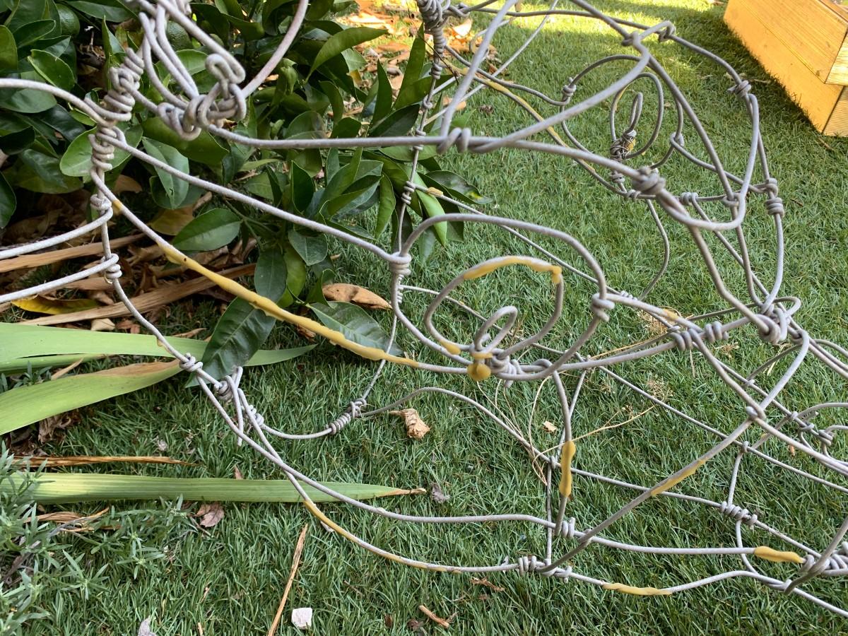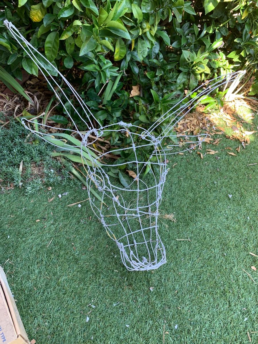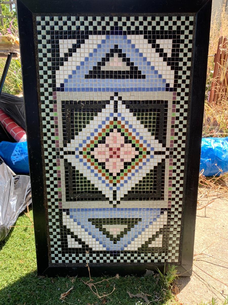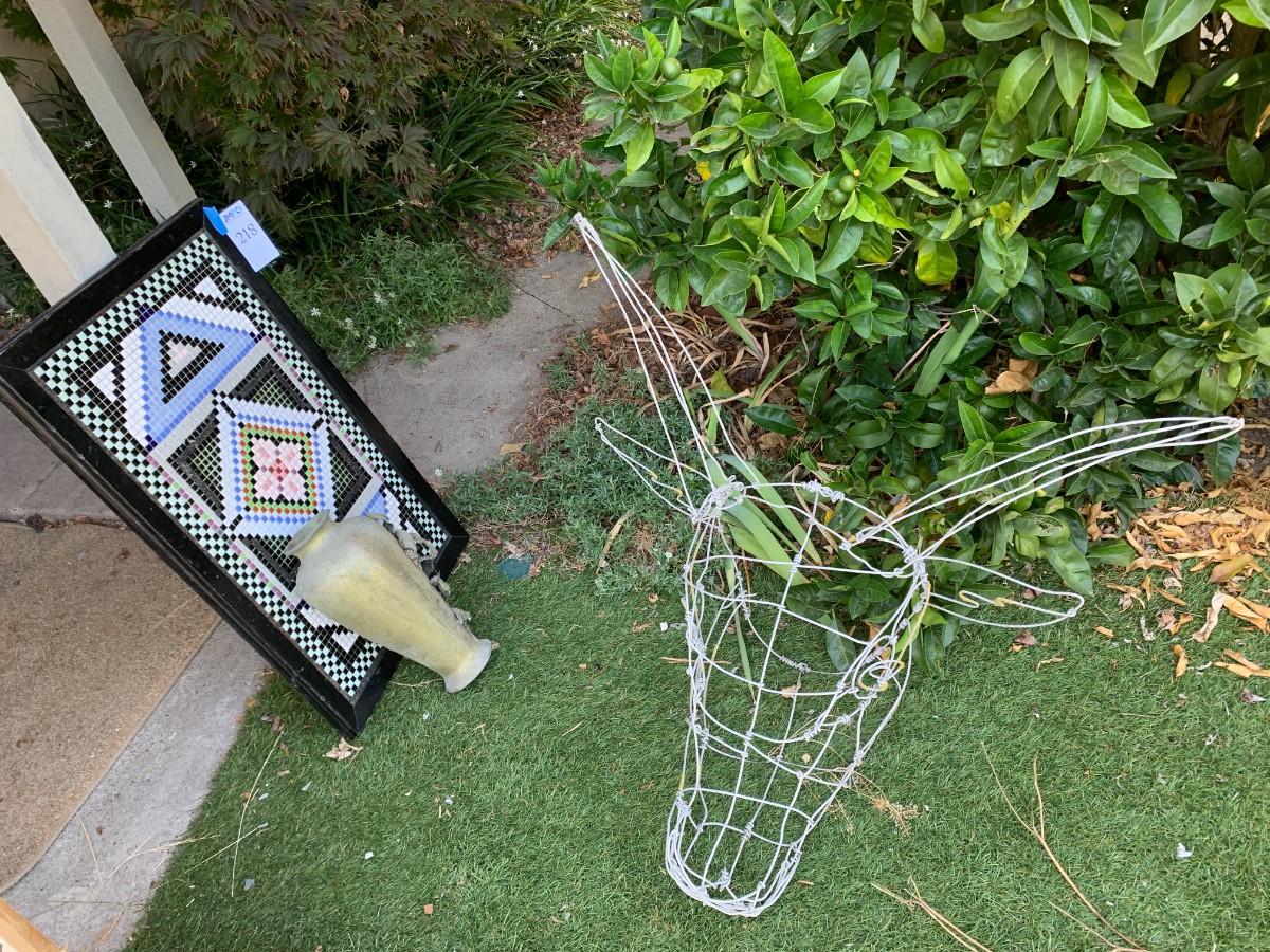 Framed mosaic. Tarnished metal vase- with no bottom! Wire sculpture, head of steer. Also includes ceramic hanging garden art piece.