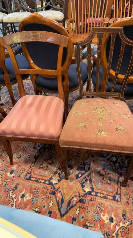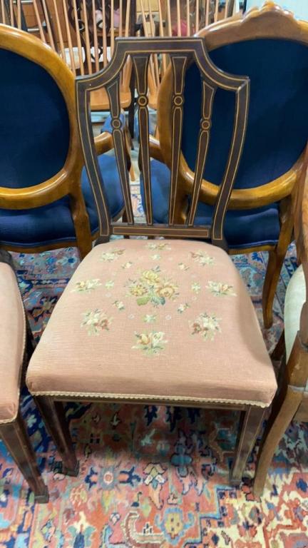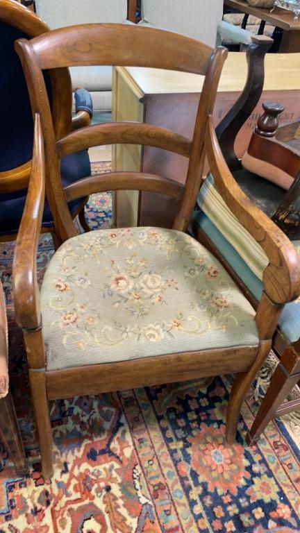 2 inlaid sheraton with needlepoint seats, 1 Fruitwood armchair w needlepoint seat,