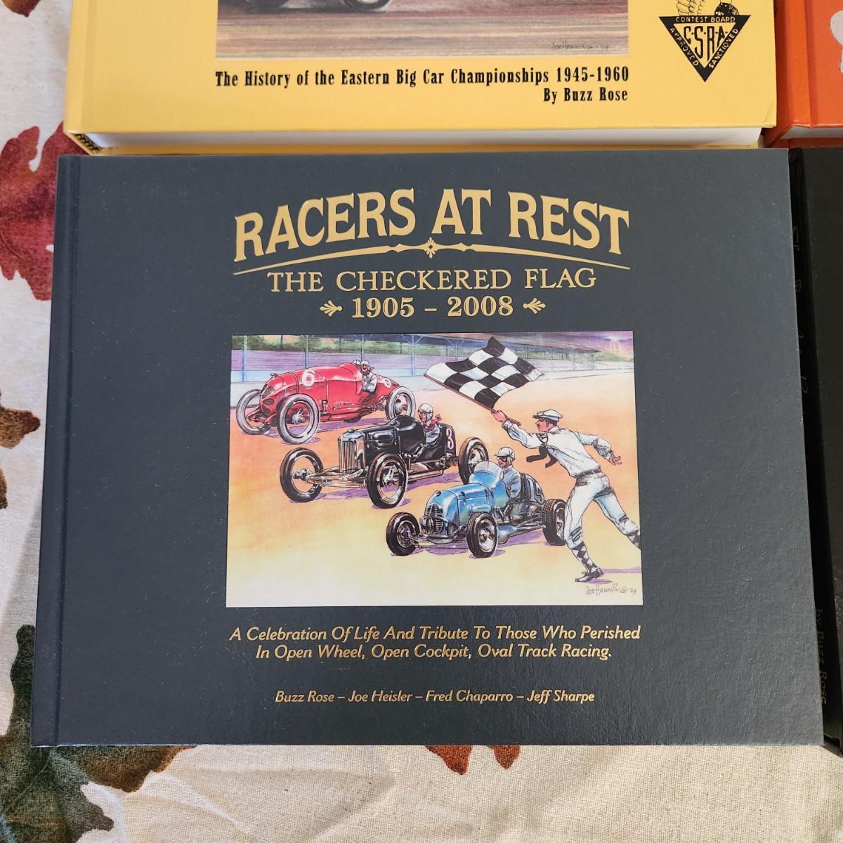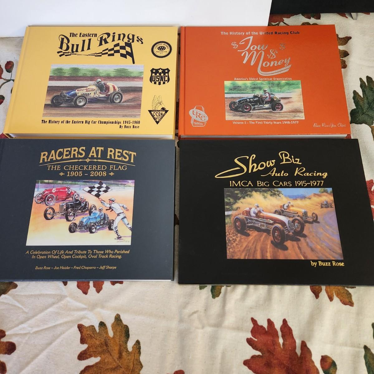4 Auto Racing Hardback Books The Eastern Bull Rings, Tow Money, Show Biz Auto Racing IMCA Big Cars, Racers at Rest The Checkered Flag , Signed Bud Rose