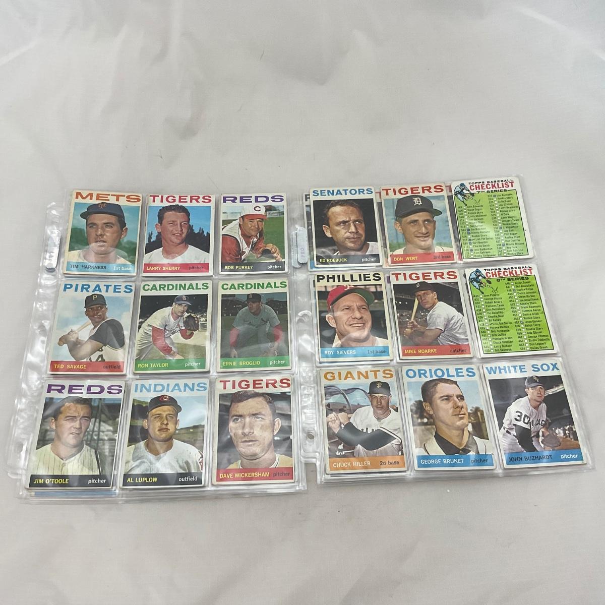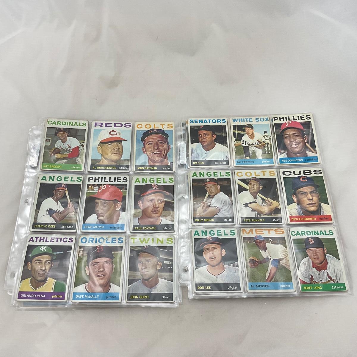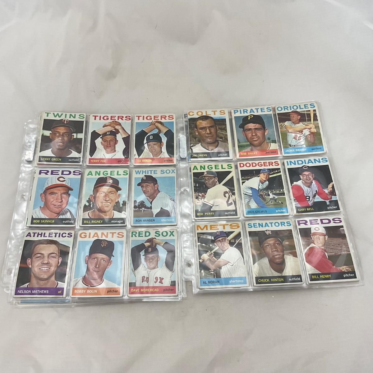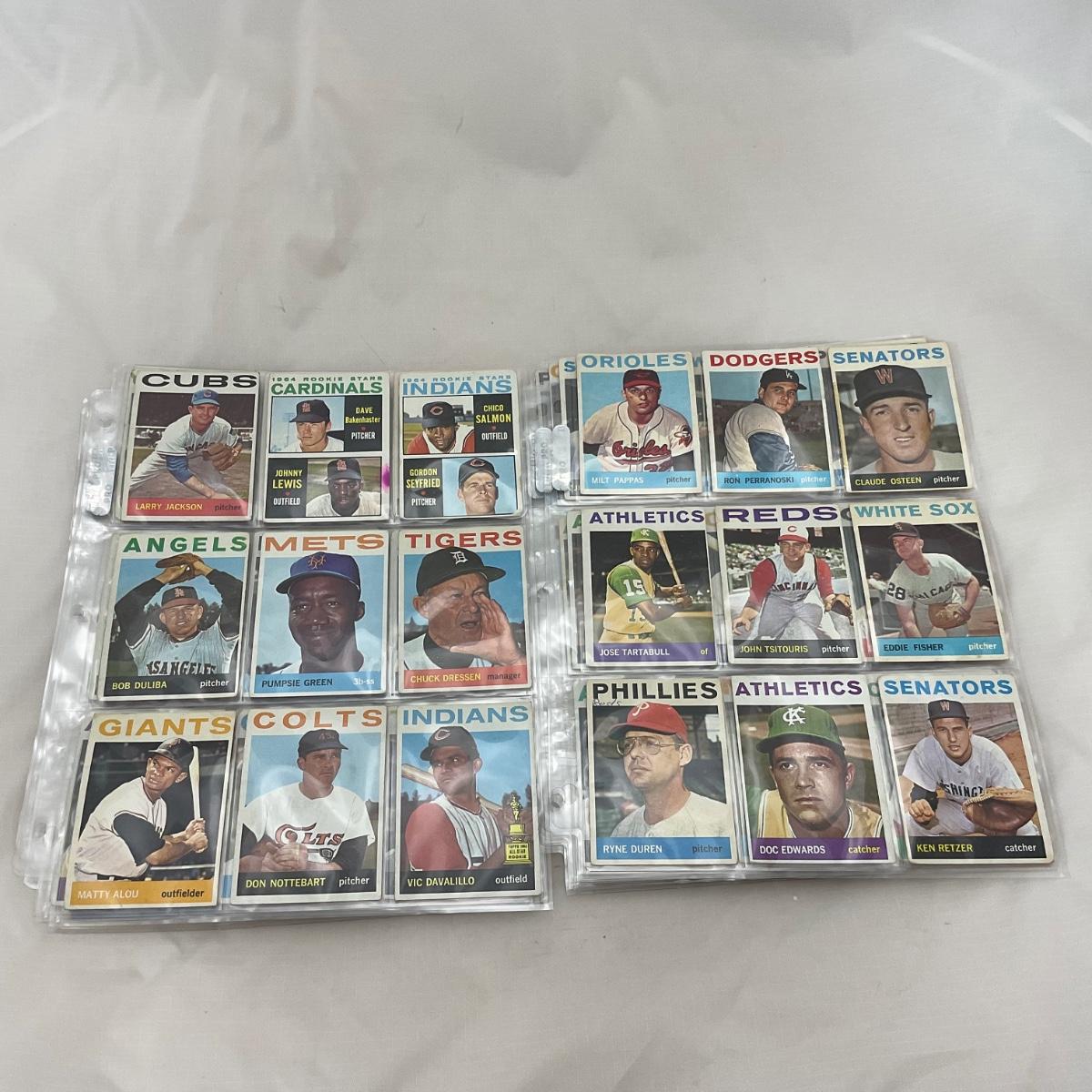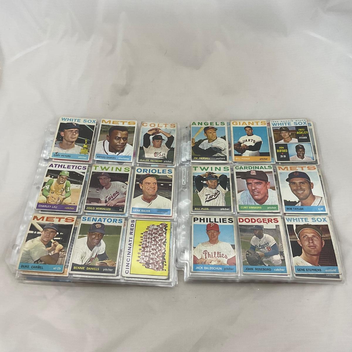 Collection of 1964 TOPPS vintage baseball cards. 14 pages of cards. There does seem to be some imperfections on some of the cards, as pictured. The 14 pages of cards will come with a binder to transport. Please see photos for details and condition. ::: Shipping is available on this lot. If you require shipping you must let us know at the close of the auction. We will coordinate with you after the item has been won. Shipping fees will include insurance up to or exceeding the value of all items being mailed. If you have any questions regarding this lot please contact the auctioneer either via this website, by direct email or by phone. PICK UP TIMES and other important information can be found in the TERMS and DESCRIPTION of the auction. Please take a look for pertinent information. Thanks!