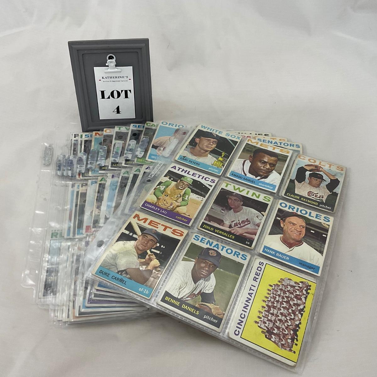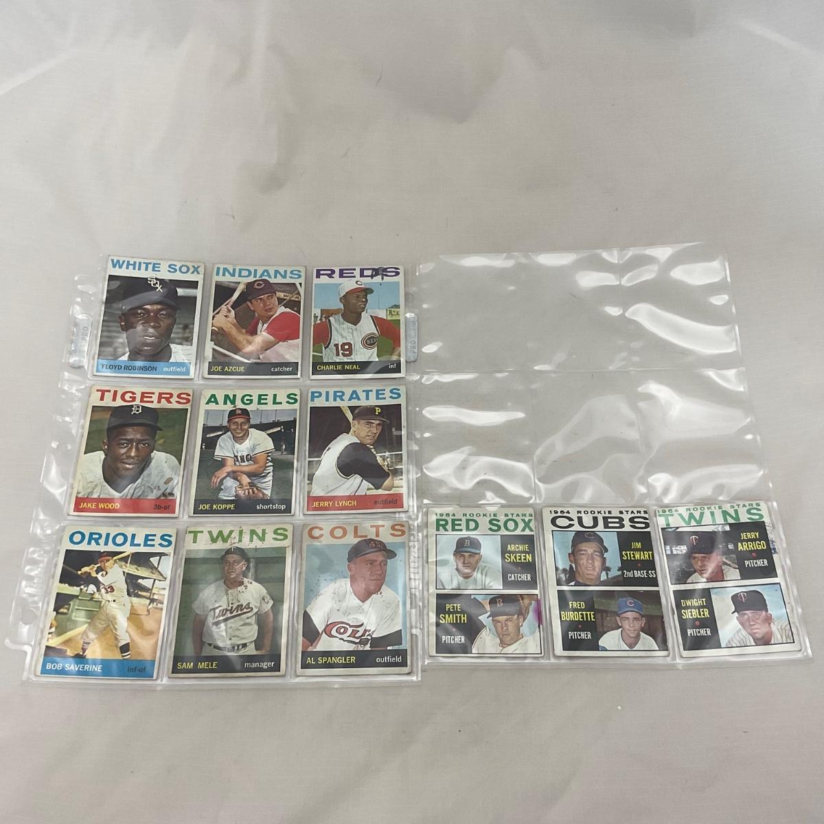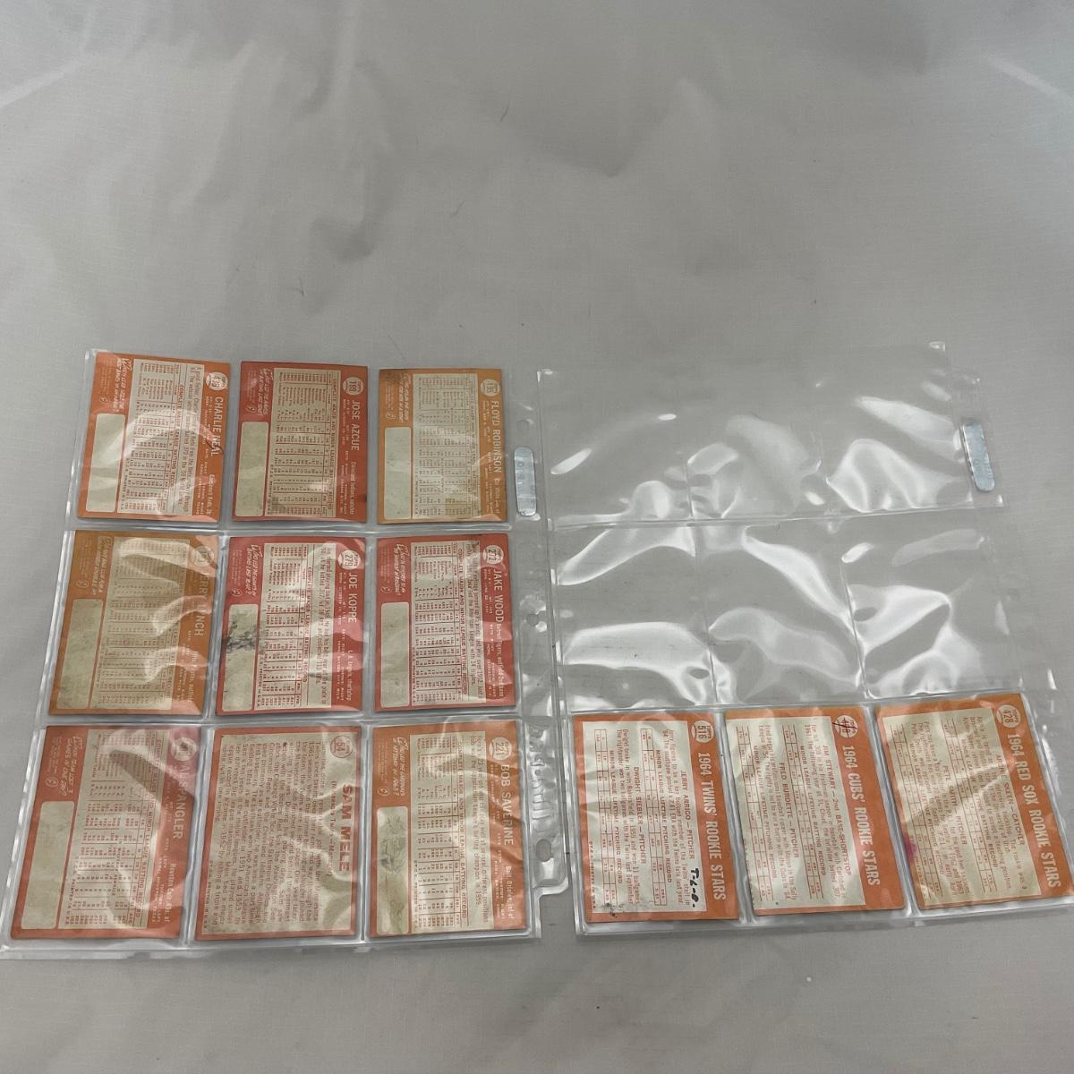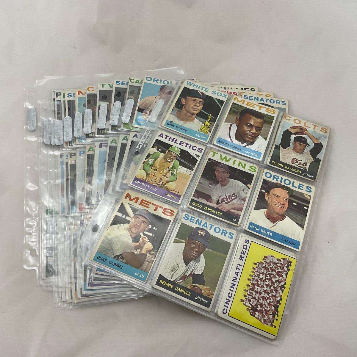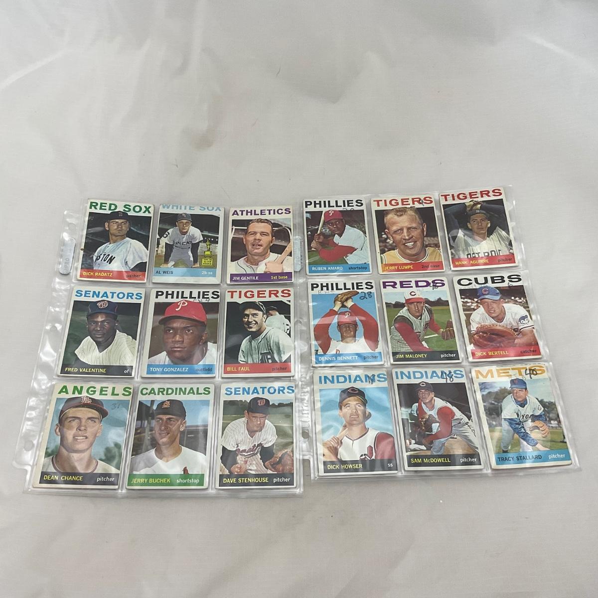 Collection of 1964 TOPPS vintage baseball cards. 14 pages of cards. There does seem to be some imperfections on some of the cards, as pictured. The 14 pages of cards will come with a binder to transport. Please see photos for details and condition. ::: Shipping is available on this lot. If you require shipping you must let us know at the close of the auction. We will coordinate with you after the item has been won. Shipping fees will include insurance up to or exceeding the value of all items being mailed. If you have any questions regarding this lot please contact the auctioneer either via this website, by direct email or by phone. PICK UP TIMES and other important information can be found in the TERMS and DESCRIPTION of the auction. Please take a look for pertinent information. Thanks!