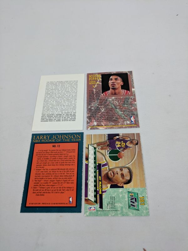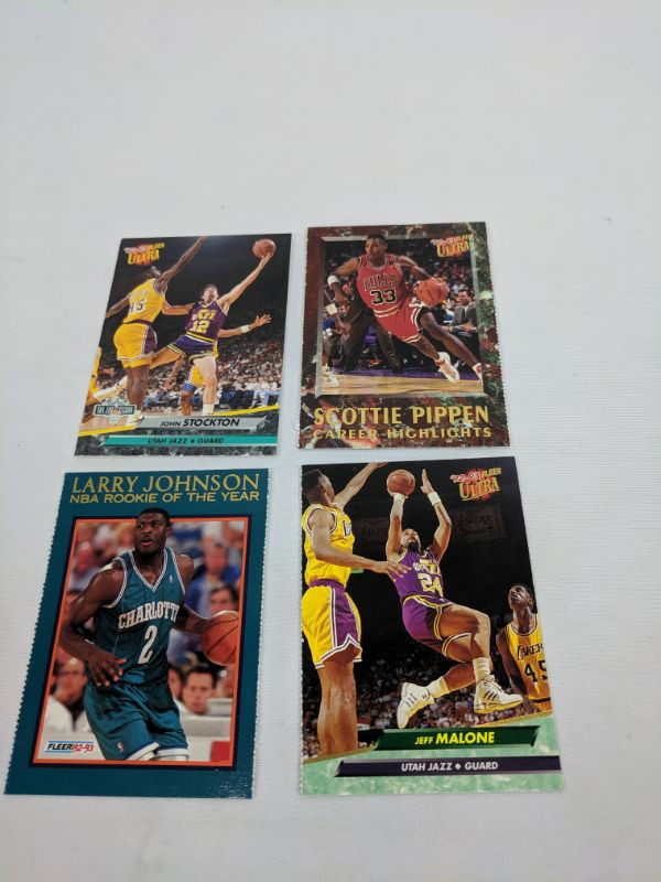 4 Basketball Cards, John Stockton, Scottie Pippen, Larry Johnson, and Jeff Malone