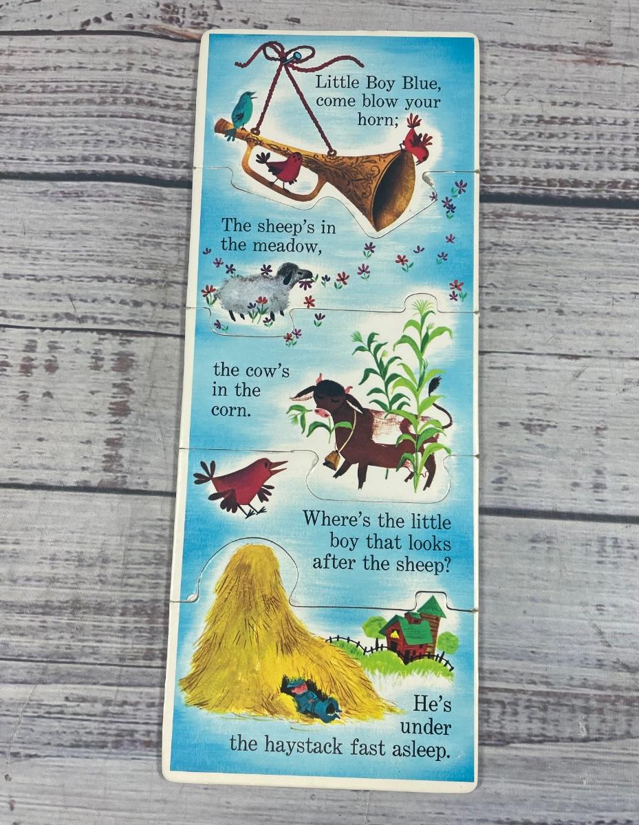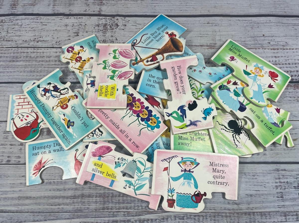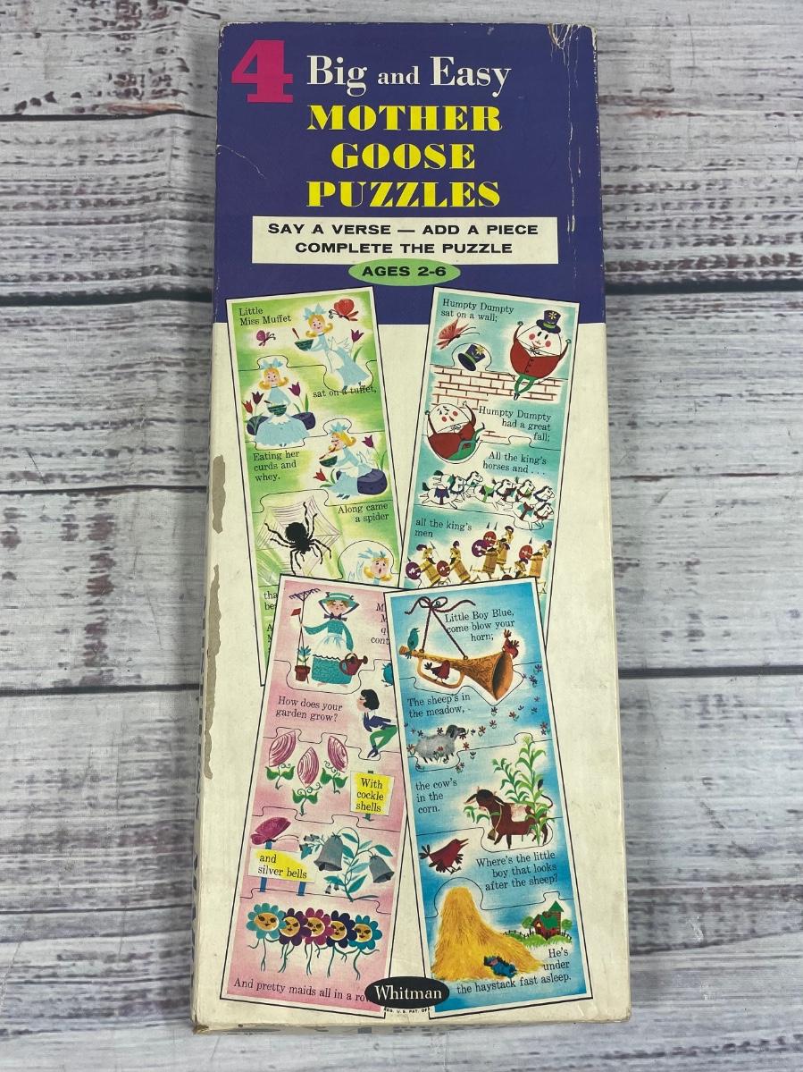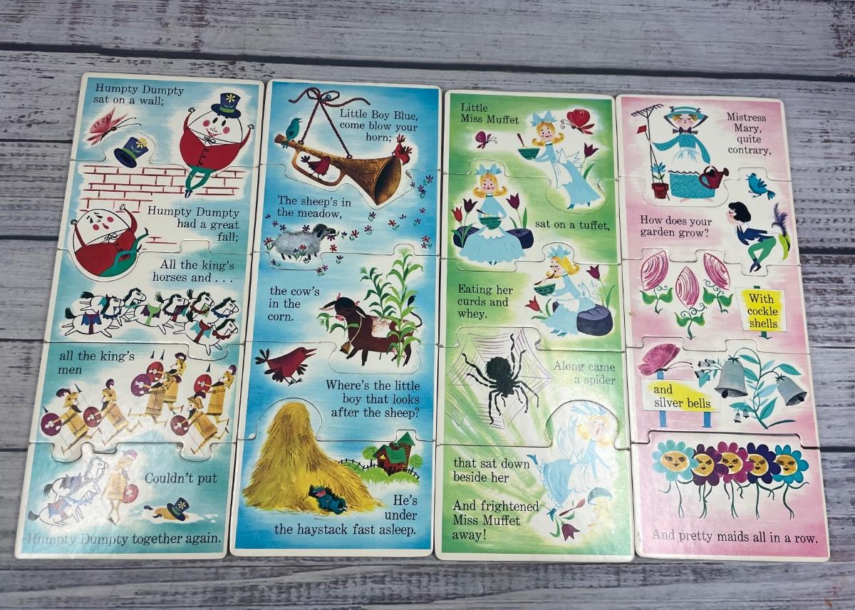 All puzzle pieces are included inside the box. Some of the pieces are roughed up but they are in good condition for the most part. These four puzzles come with five big pieces each. These puzzles include: Little Miss Muffet, Mistress Mary, Little Boy Blue, and Humpty Dumpty.