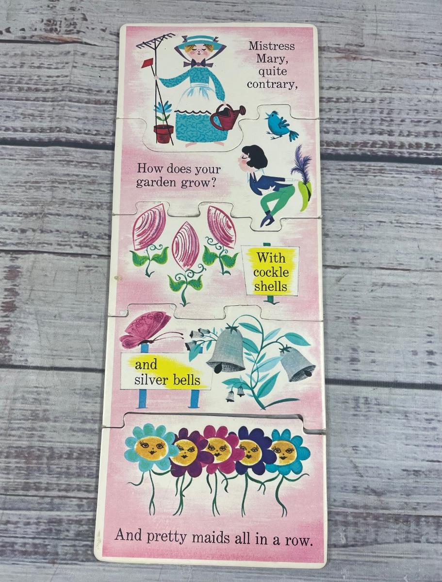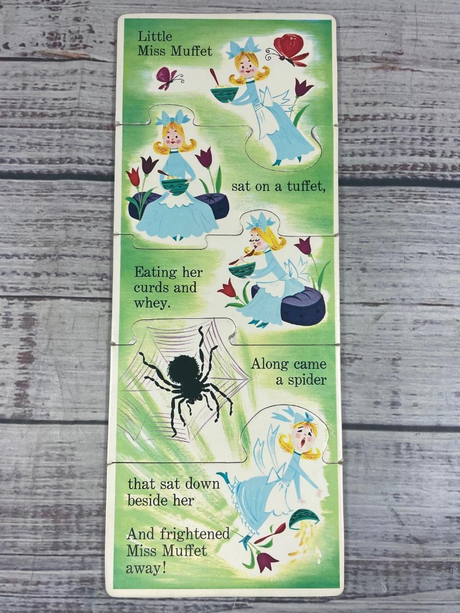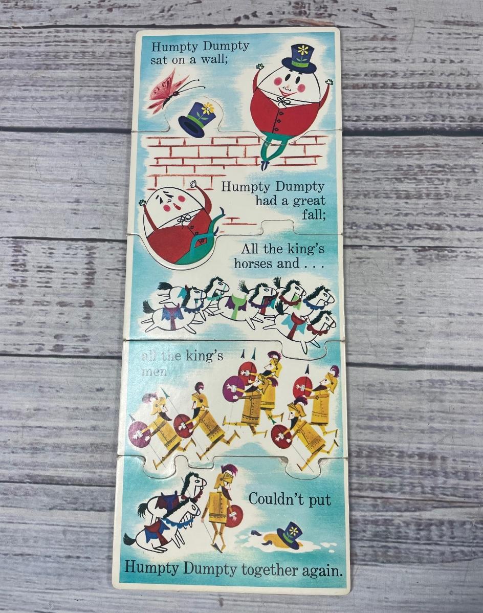 All puzzle pieces are included inside the box. Some of the pieces are roughed up but they are in good condition for the most part. These four puzzles come with five big pieces each. These puzzles include: Little Miss Muffet, Mistress Mary, Little Boy Blue, and Humpty Dumpty.