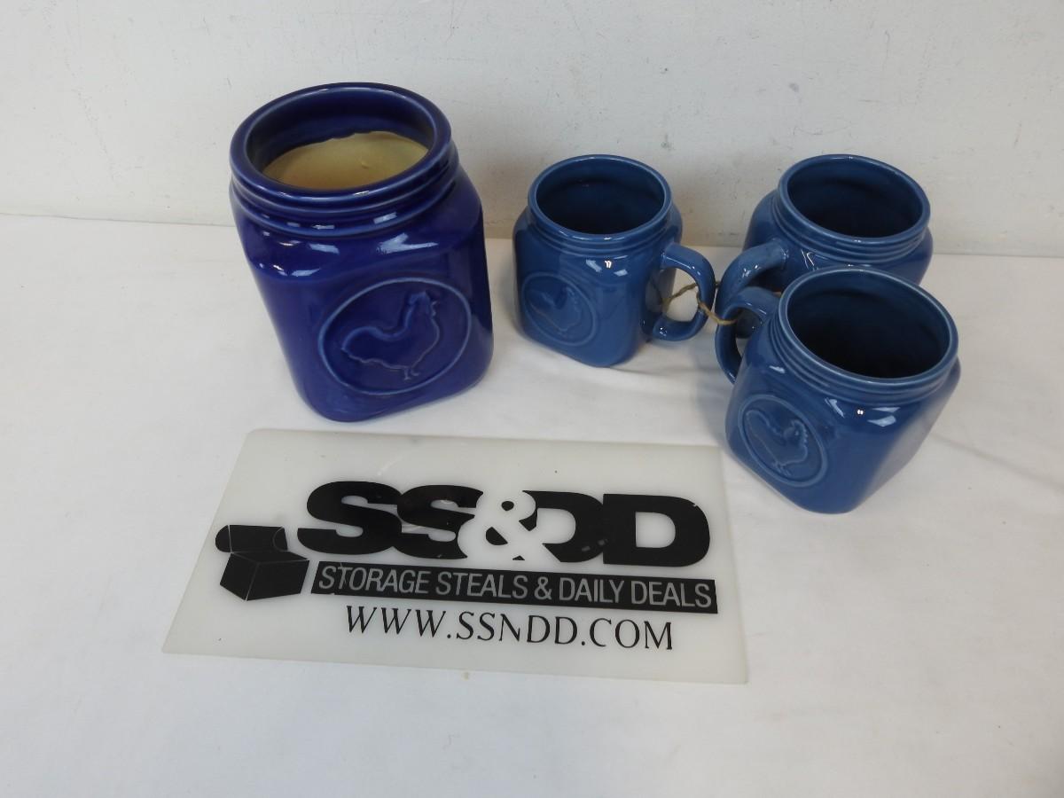 4 Blue Ceramic Mug Mason Jars, Rooster