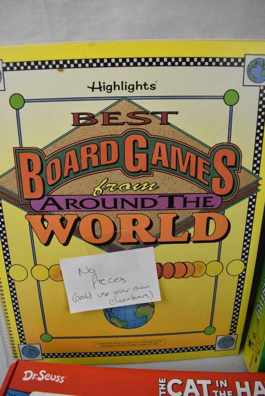 4 Board Games: Highlights (missing pieces, could use checkers) Word Crossing, Cat in the Hat I can Do That (missing 1 joint piece and some cards) and Mighty Mind
