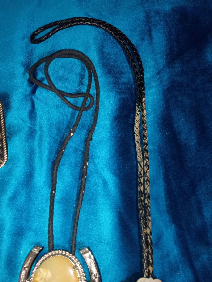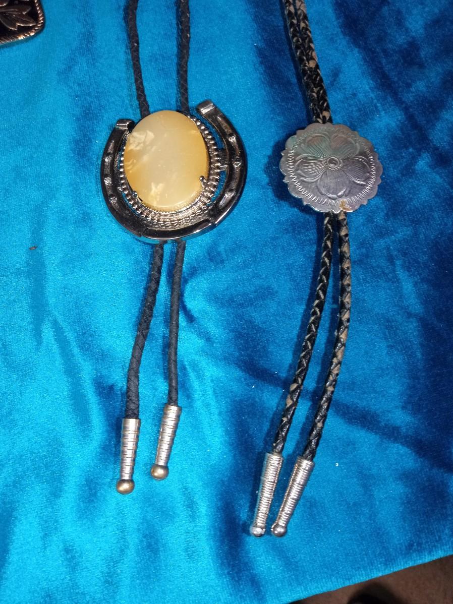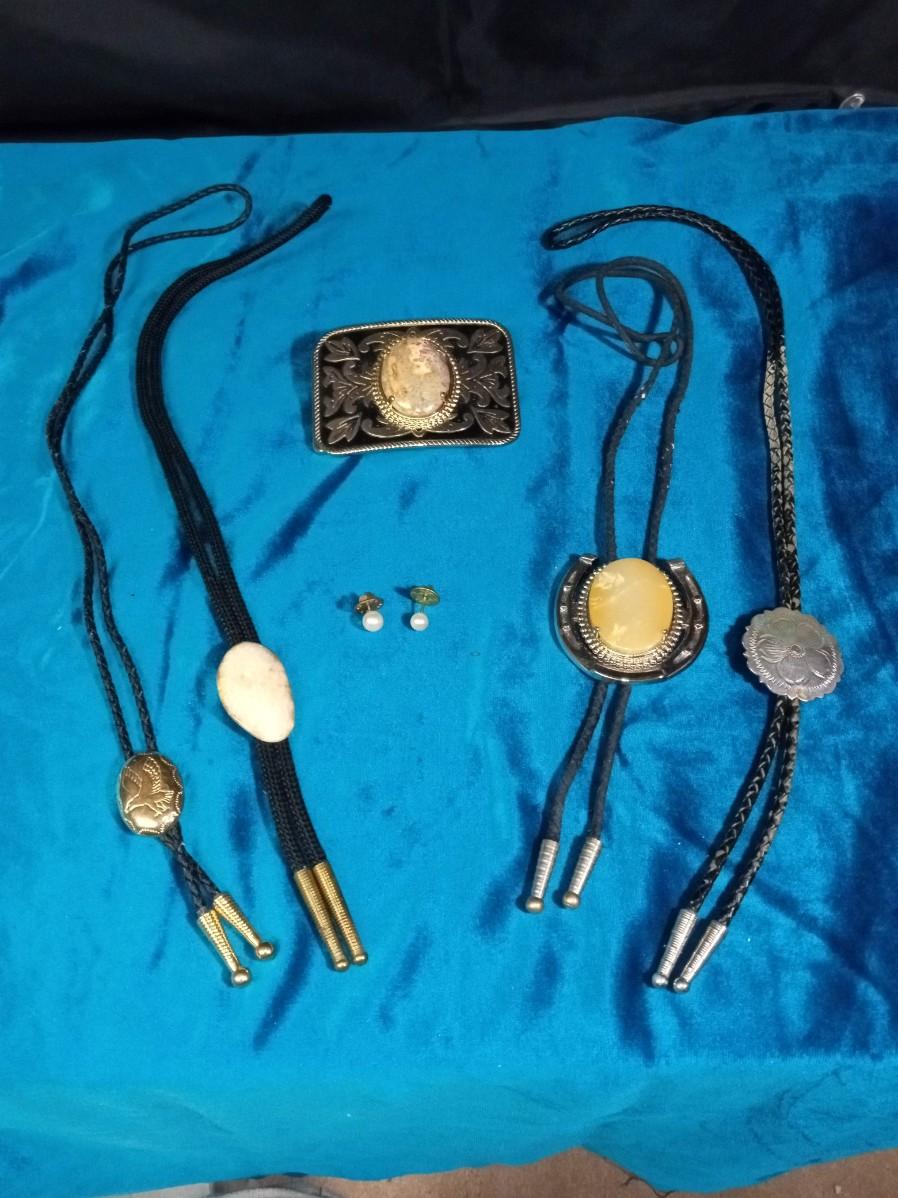 4 BOLO TIES, BELT BUCKLE AND TIE TACKS