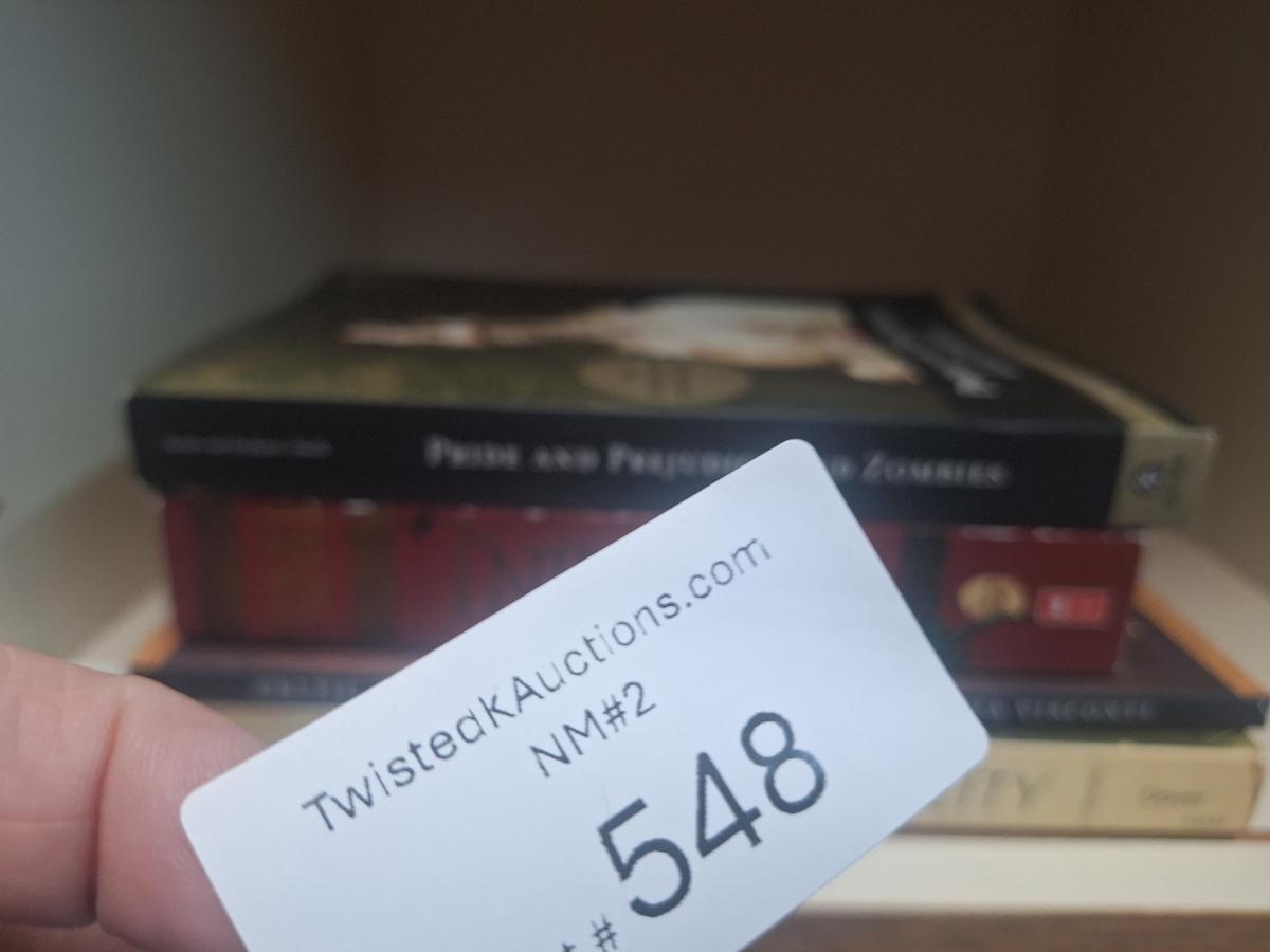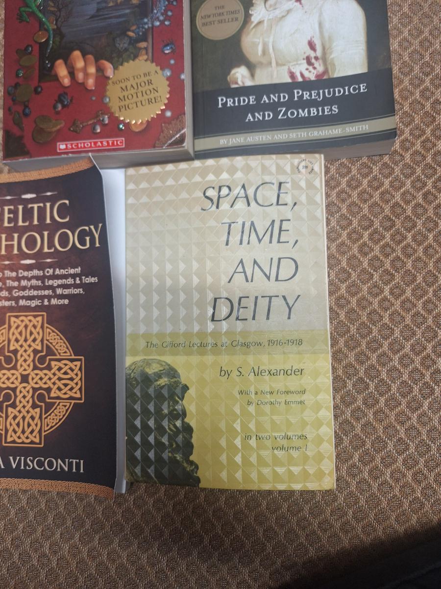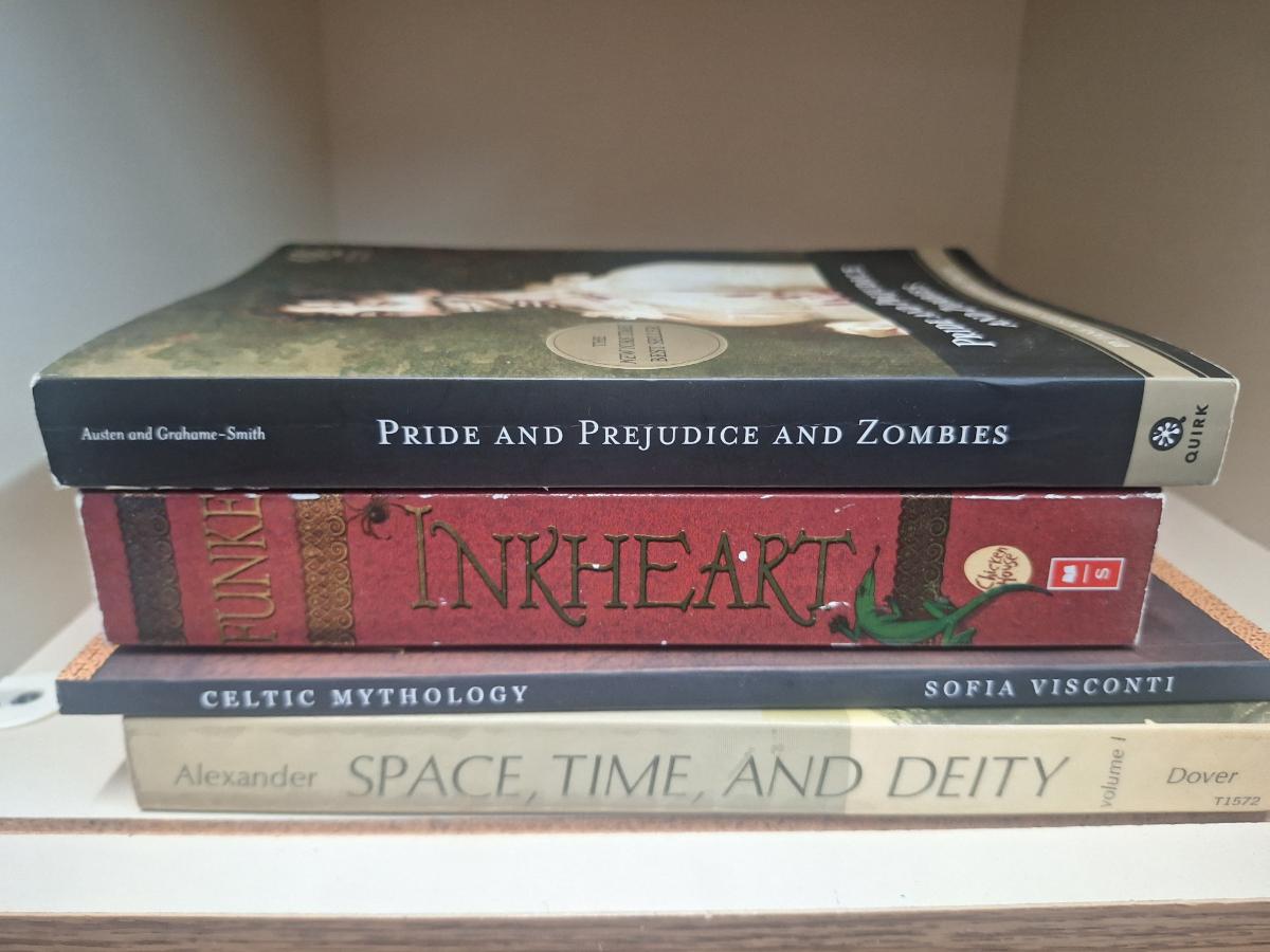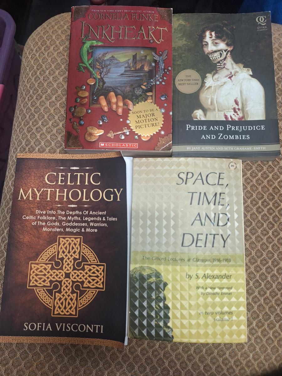 4 books: 1. Pride and Prejudice and Zombies 2. Ink heart 3. Celtic Mythology 4. Space, Time, and Deity, volume I