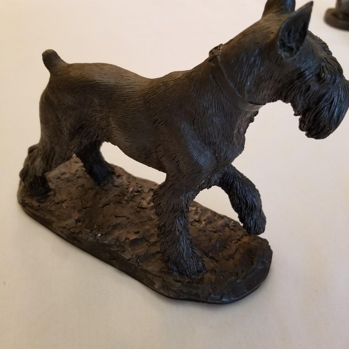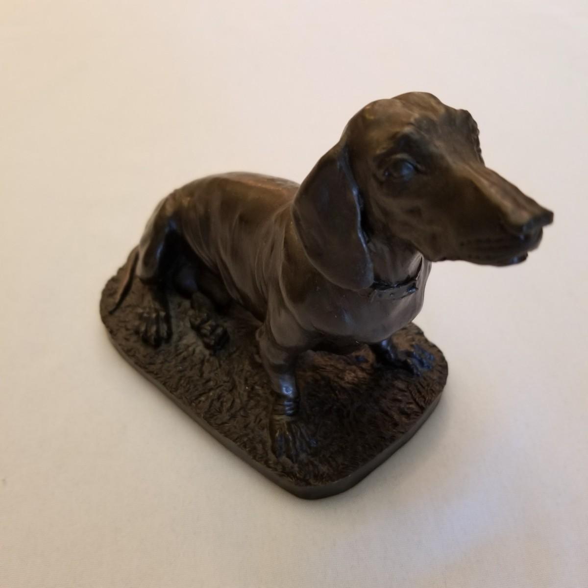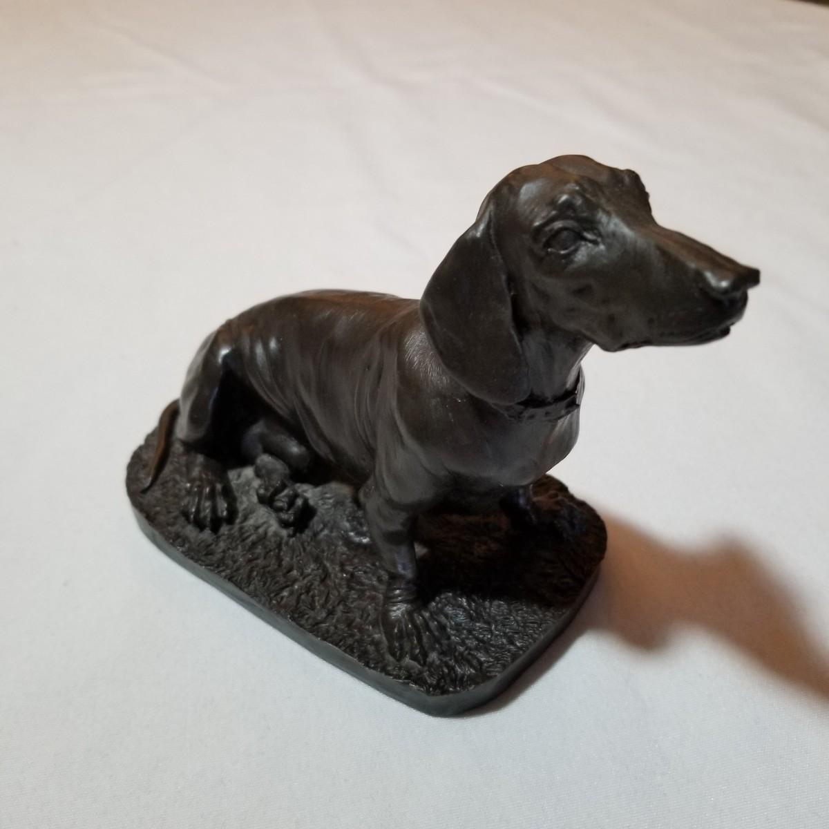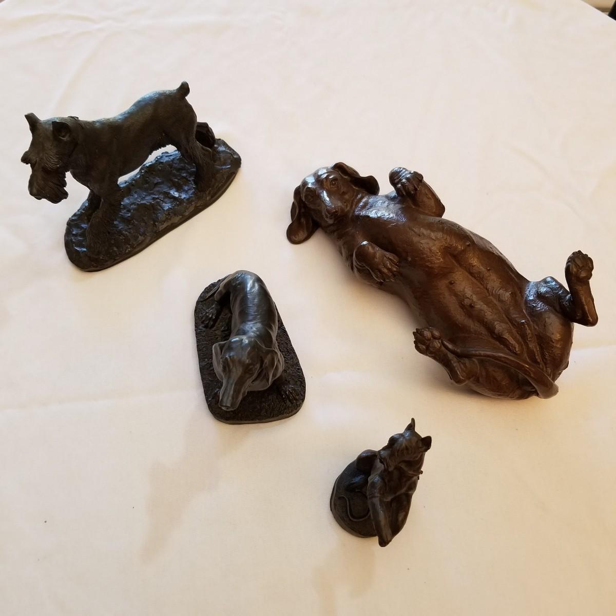 Four adorable dogs in various poses. Two Dachshunds and two Schnauzers, all with felt bottoms on base plates to protect furniture. Three of the four have brand name Heredities stamped on their bases (largest does not). Largest lying dog sculpture is 11". These sculptures appear to be bronze. All are in very good condition, see photos for details. Shipping available.