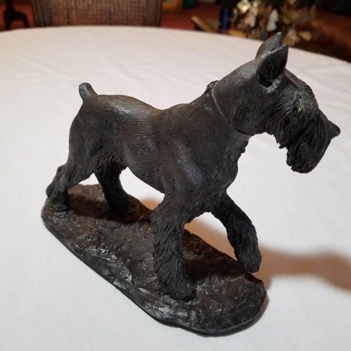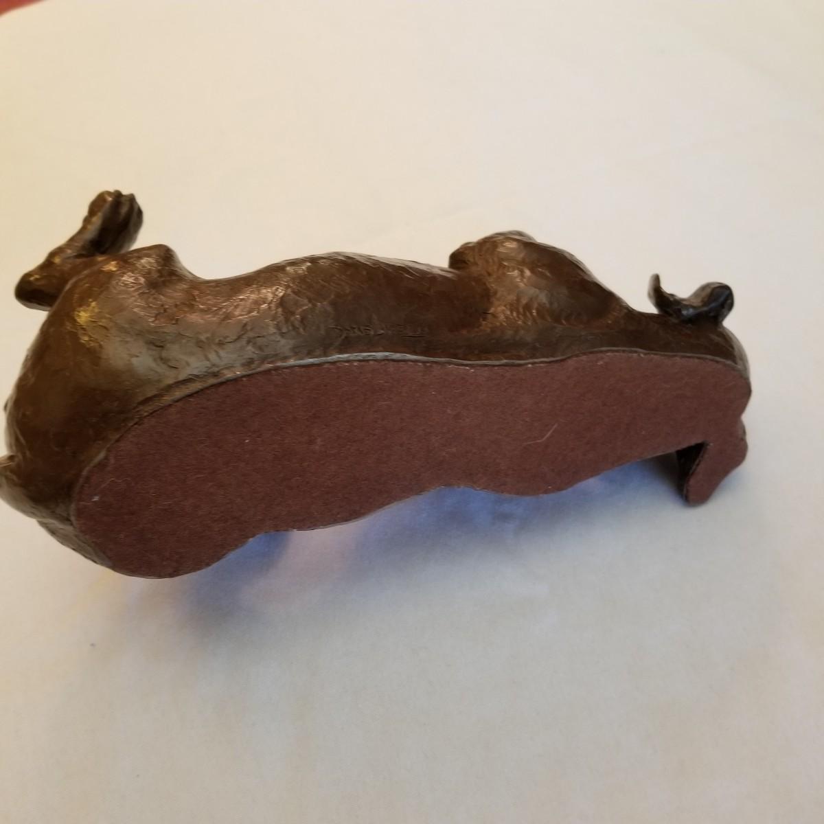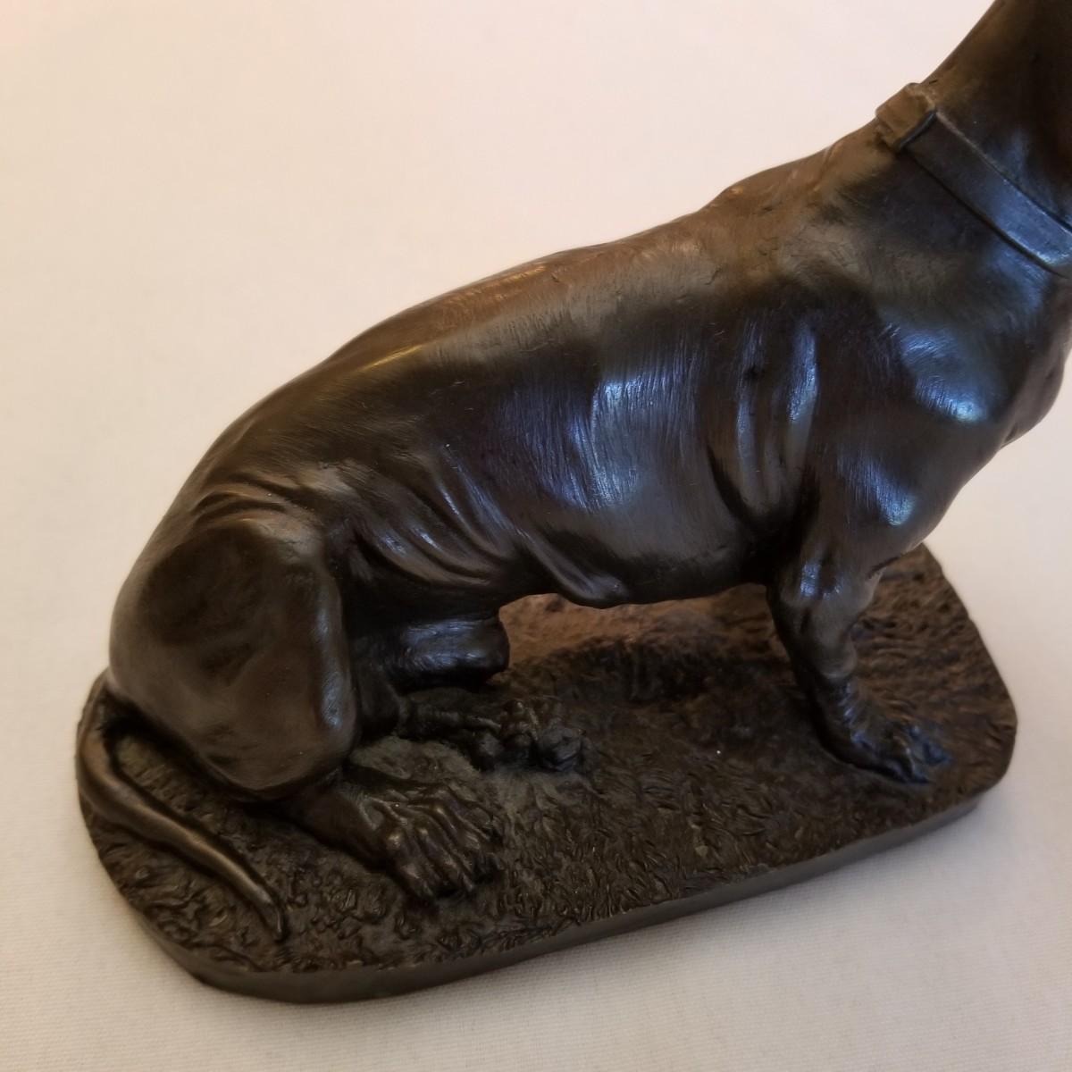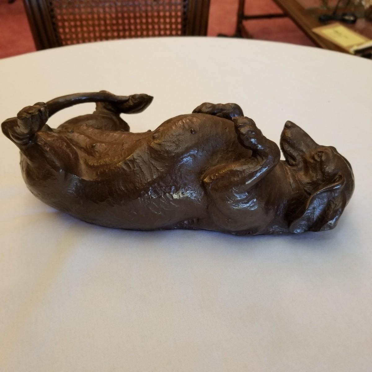 Four adorable dogs in various poses. Two Dachshunds and two Schnauzers, all with felt bottoms on base plates to protect furniture. Three of the four have brand name Heredities stamped on their bases (largest does not). Largest lying dog sculpture is 11". These sculptures appear to be bronze. All are in very good condition, see photos for details. Shipping available.