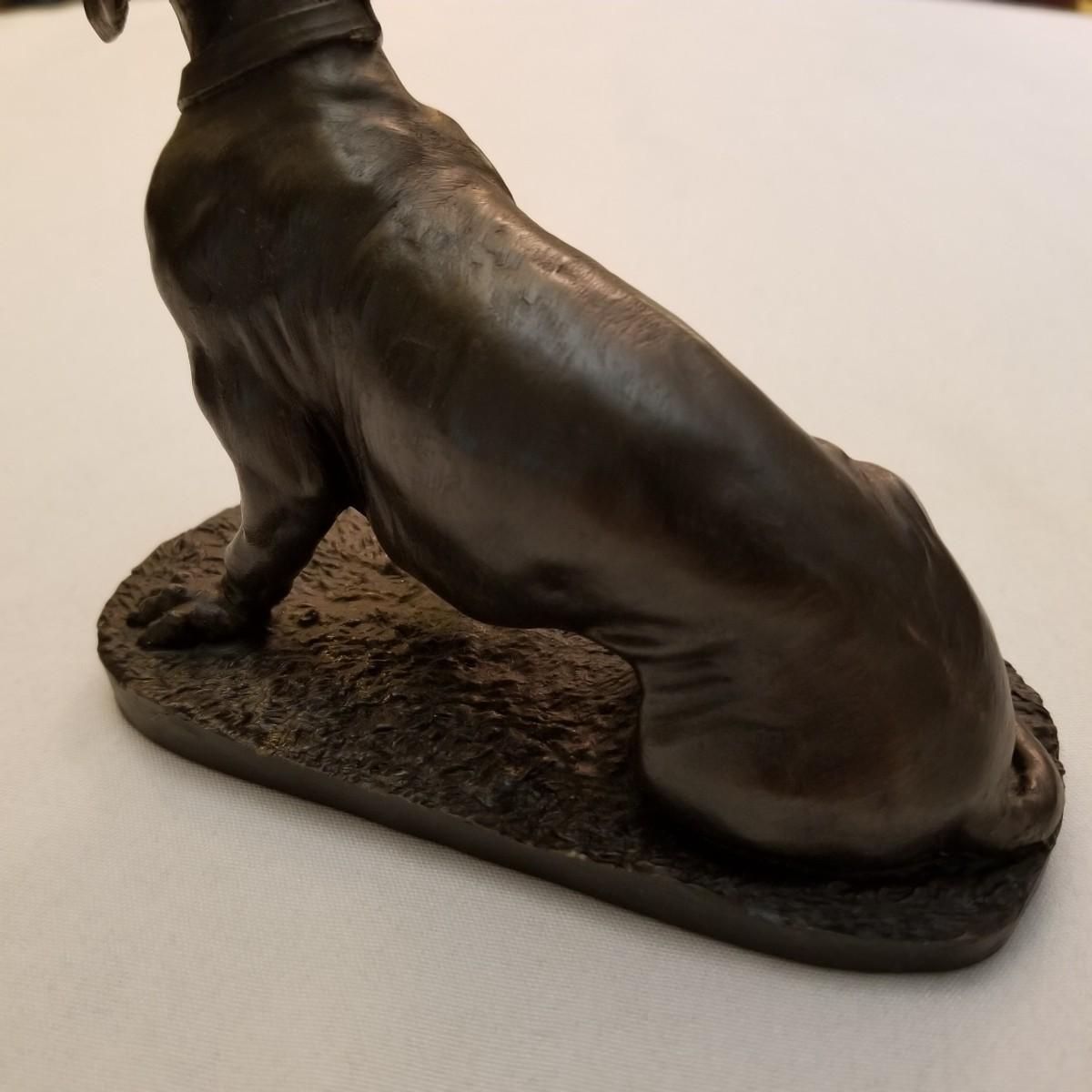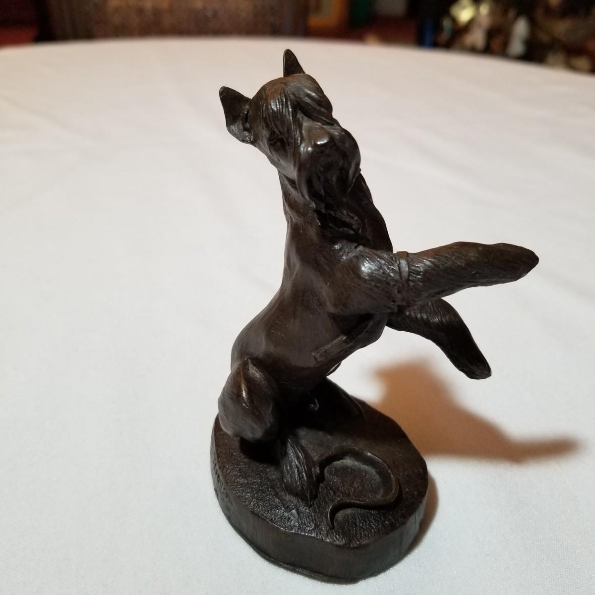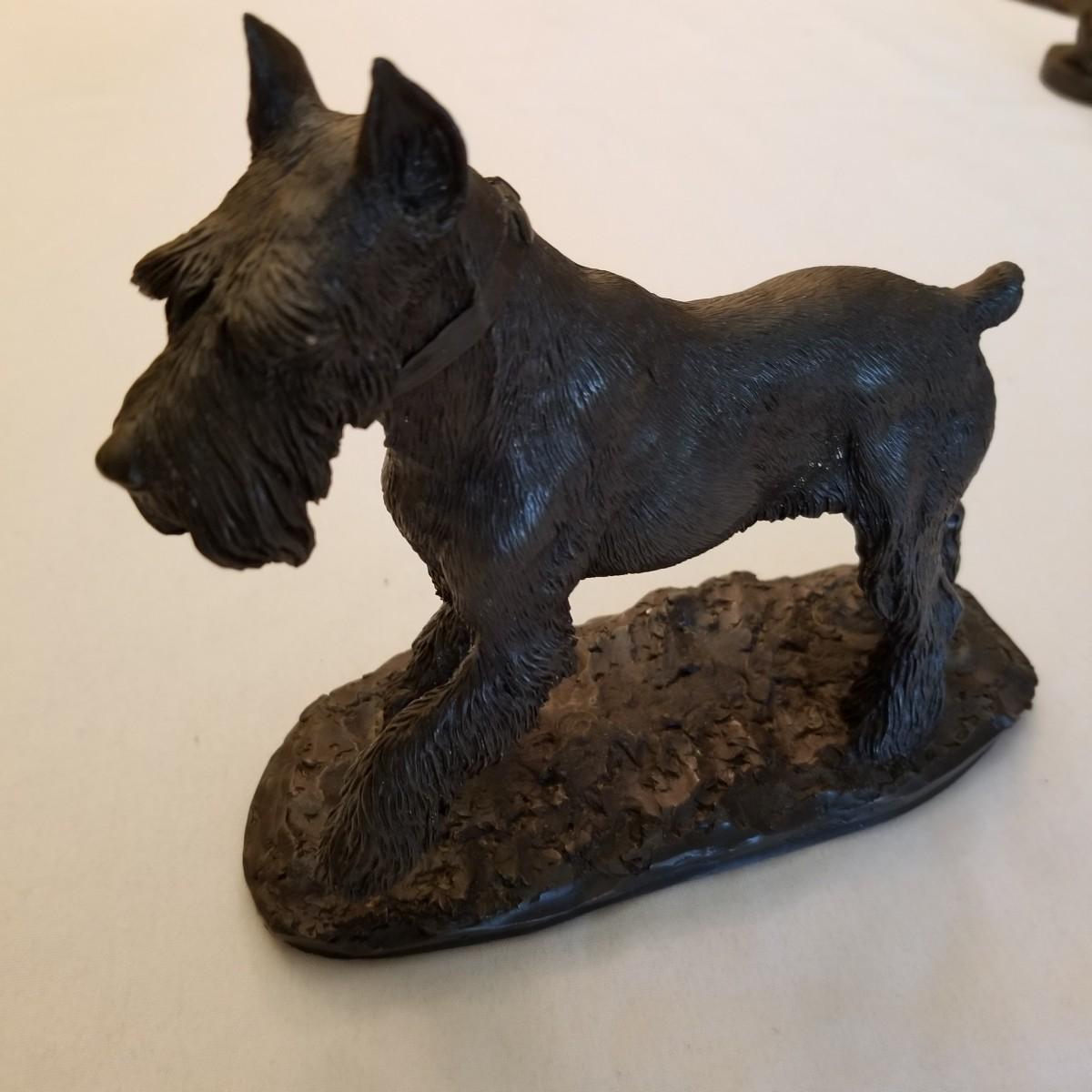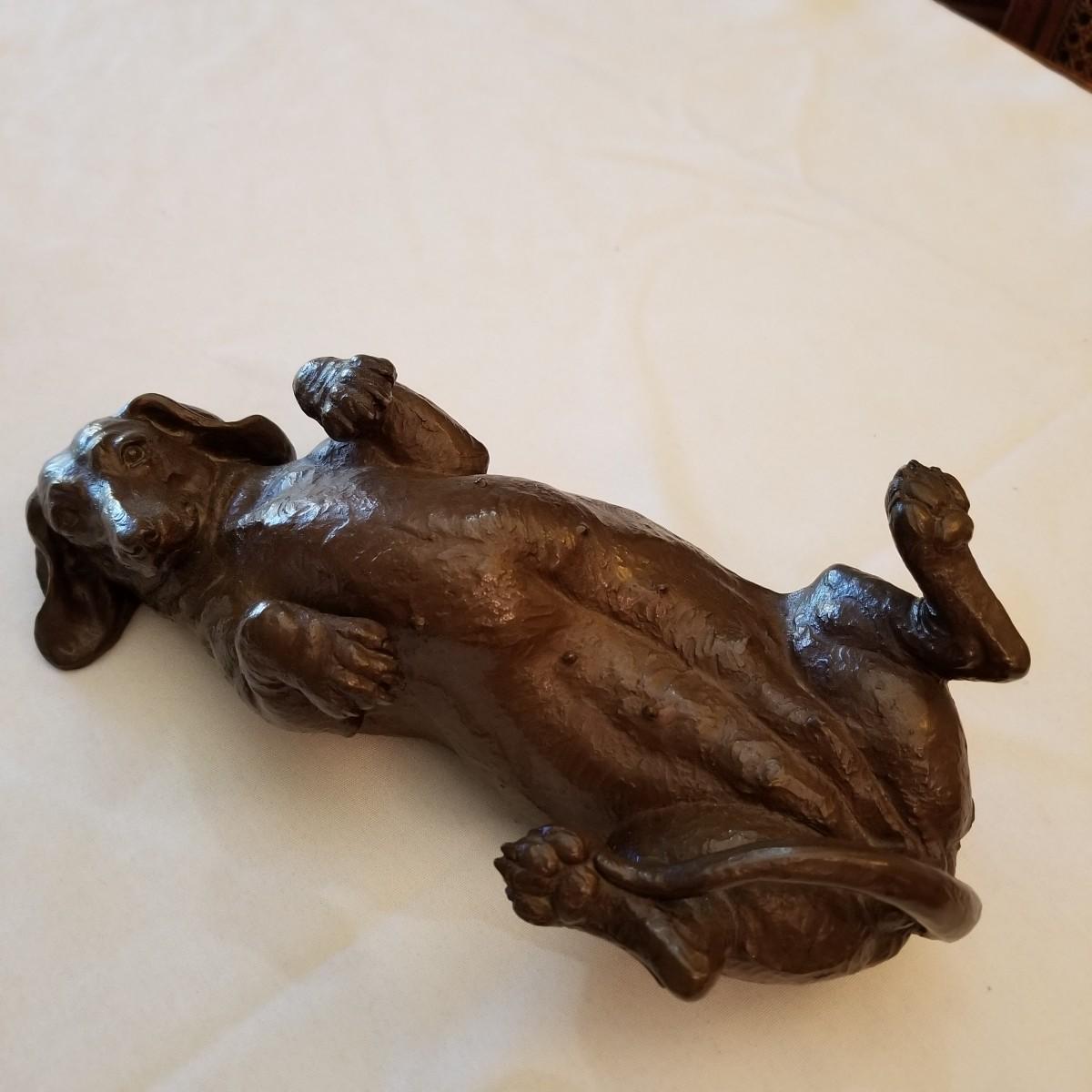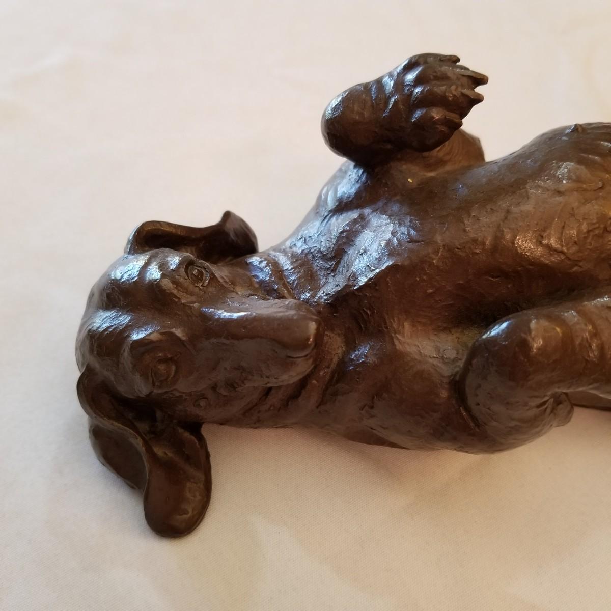 Four adorable dogs in various poses. Two Dachshunds and two Schnauzers, all with felt bottoms on base plates to protect furniture. Three of the four have brand name Heredities stamped on their bases (largest does not). Largest lying dog sculpture is 11". These sculptures appear to be bronze. All are in very good condition, see photos for details. Shipping available.