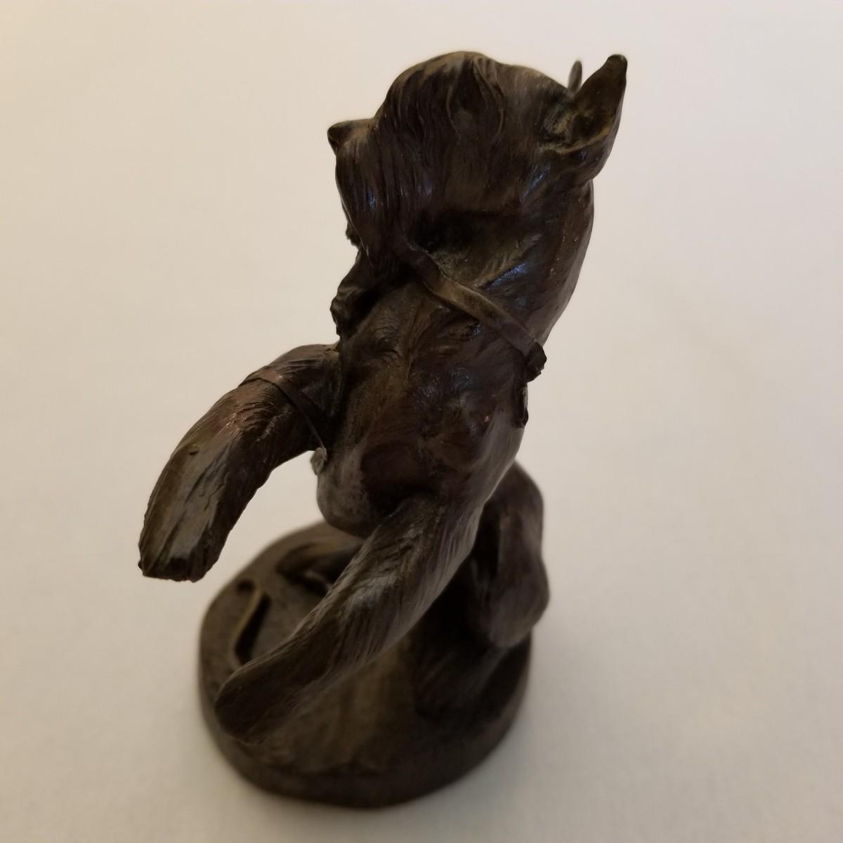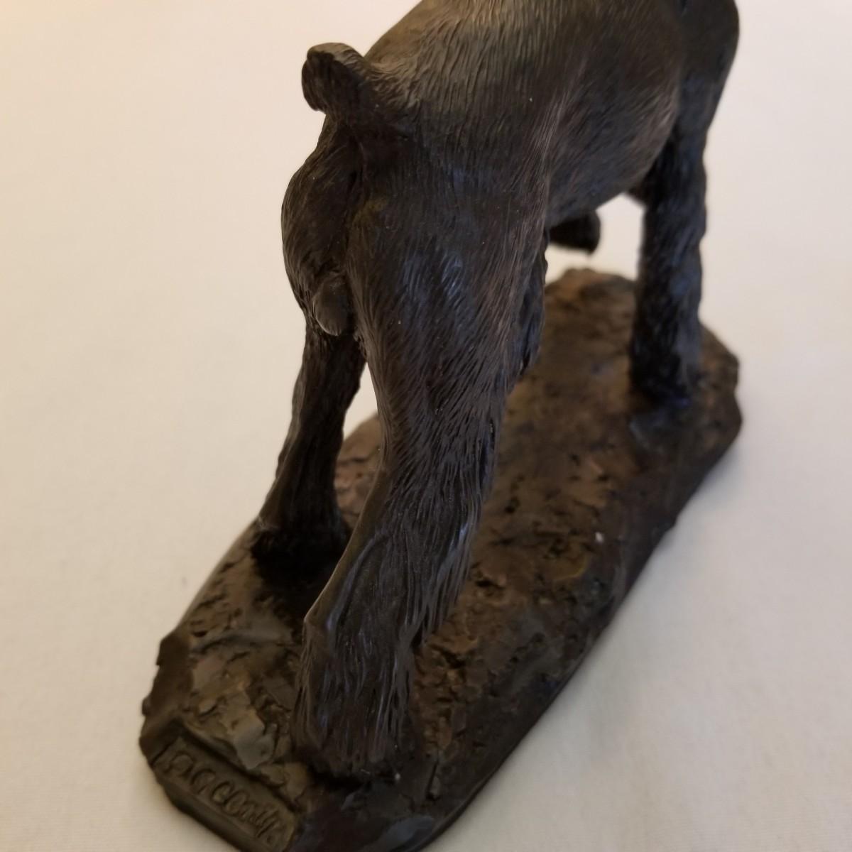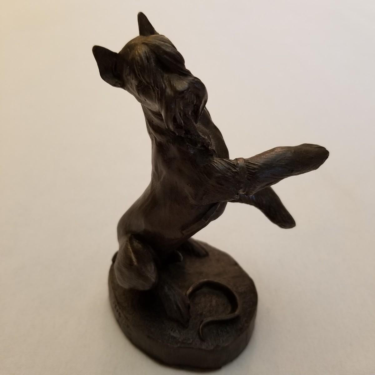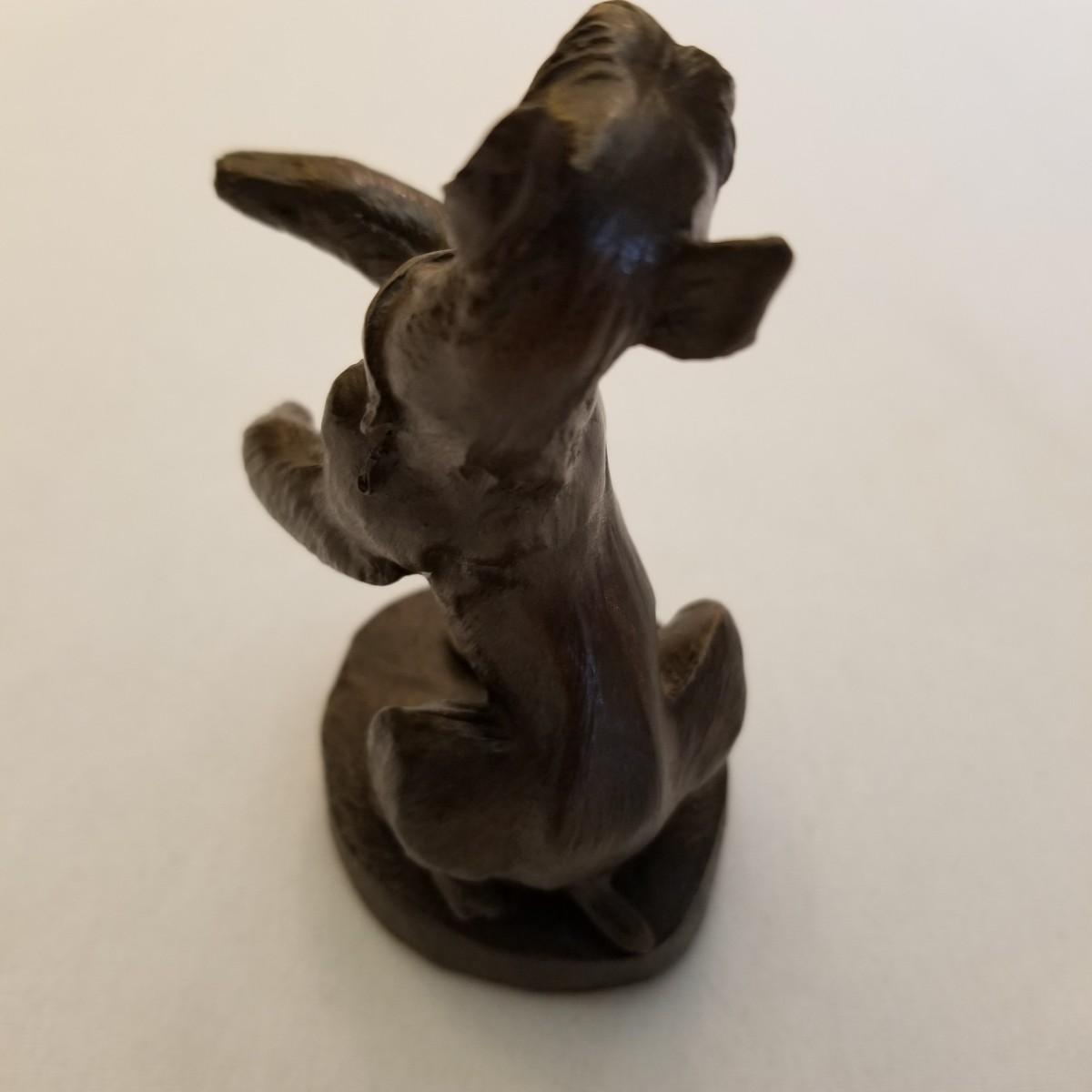 Four adorable dogs in various poses. Two Dachshunds and two Schnauzers, all with felt bottoms on base plates to protect furniture. Three of the four have brand name Heredities stamped on their bases (largest does not). Largest lying dog sculpture is 11". These sculptures appear to be bronze. All are in very good condition, see photos for details. Shipping available.