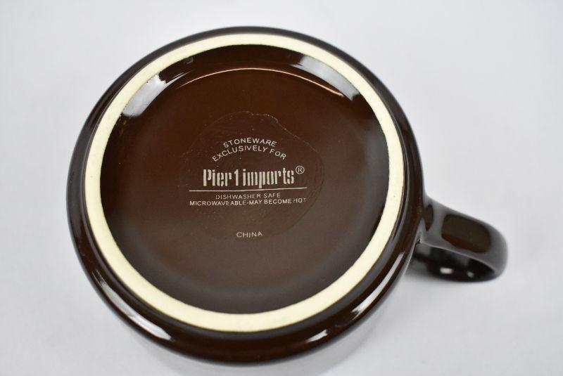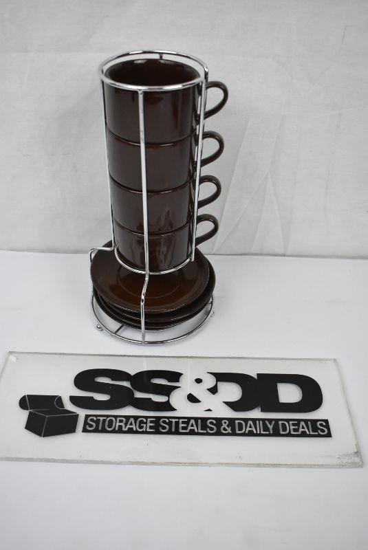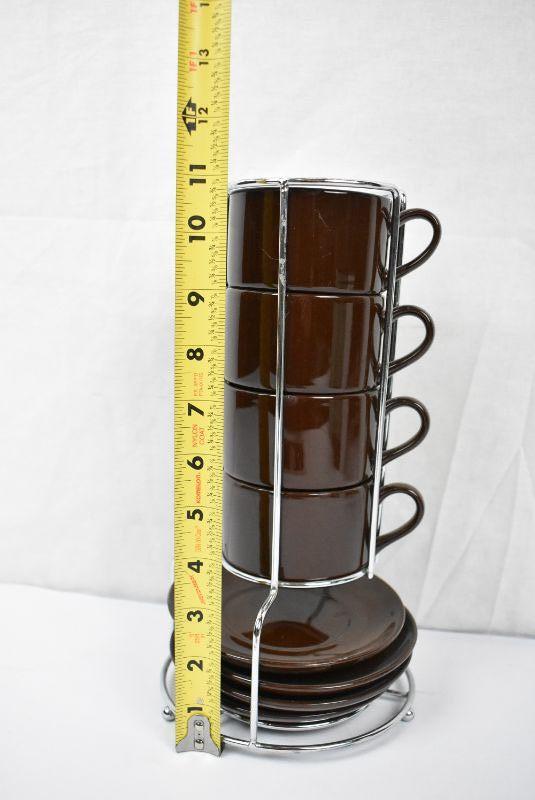 4 Brown Coffee Cups with 4 Saucers in Metal Rack, from Pier 1 Imports