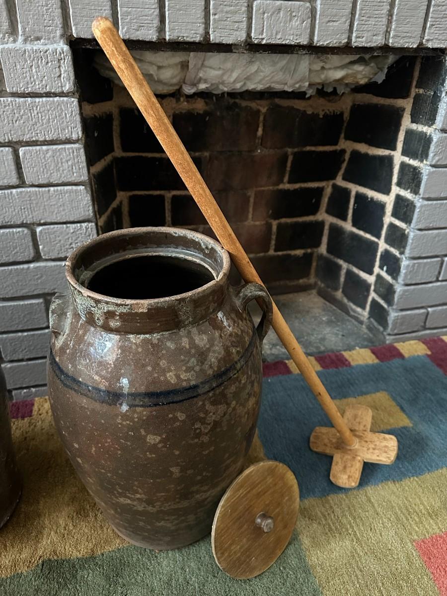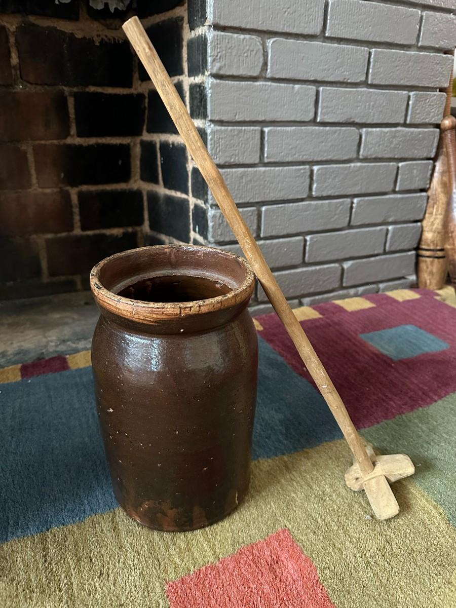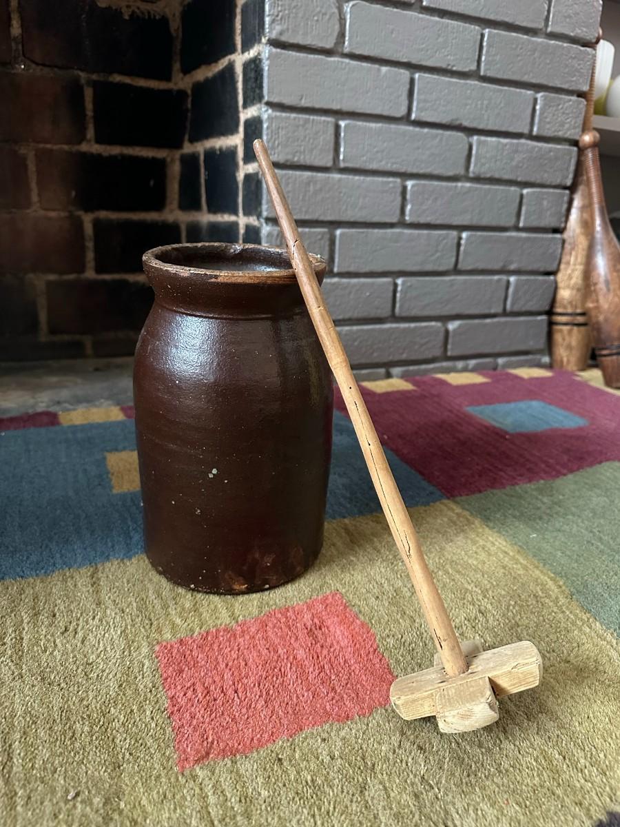 1 Large Butter Churn with separate lid measures 17"H x 10" w and has a few chips on the upper rim. 1 Large Butter Churn with lid measures 16.5"h x 9.5"w and had chip on rim. 1 Small Butter Churn w/o lid measures 10.5"h x 6"w. 1 Small Butter Churn measures 9.5"h x 5"w with chips on rim