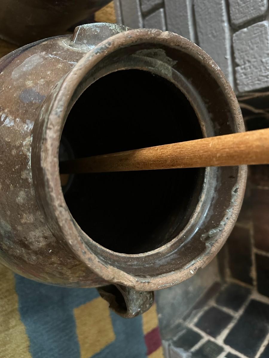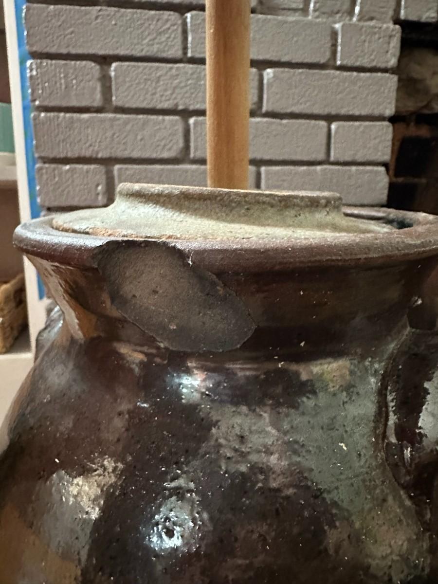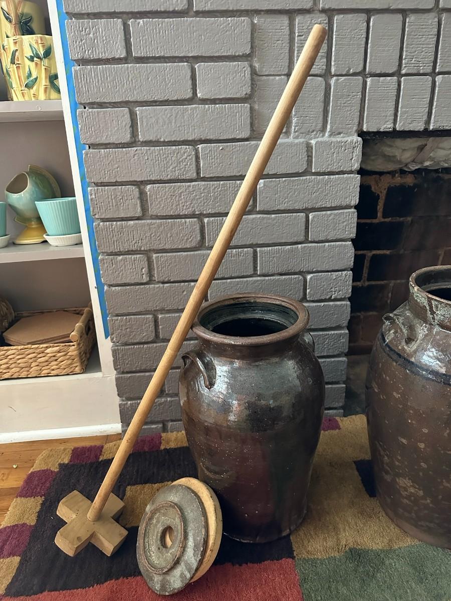1 Large Butter Churn with separate lid measures 17"H x 10" w and has a few chips on the upper rim. 1 Large Butter Churn with lid measures 16.5"h x 9.5"w and had chip on rim. 1 Small Butter Churn w/o lid measures 10.5"h x 6"w. 1 Small Butter Churn measures 9.5"h x 5"w with chips on rim
