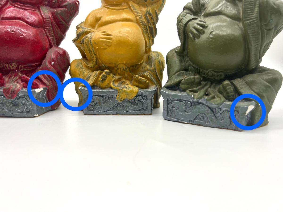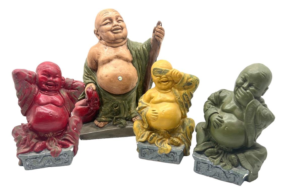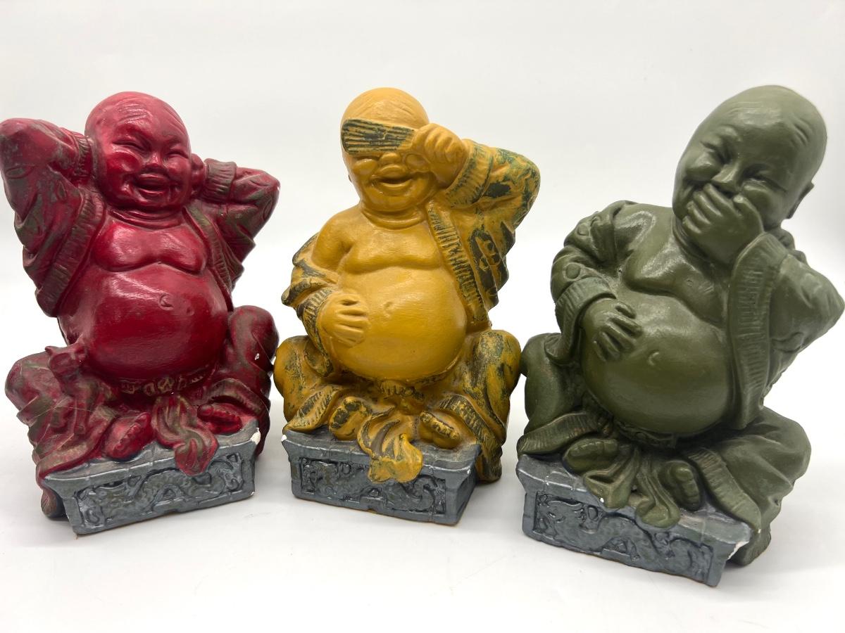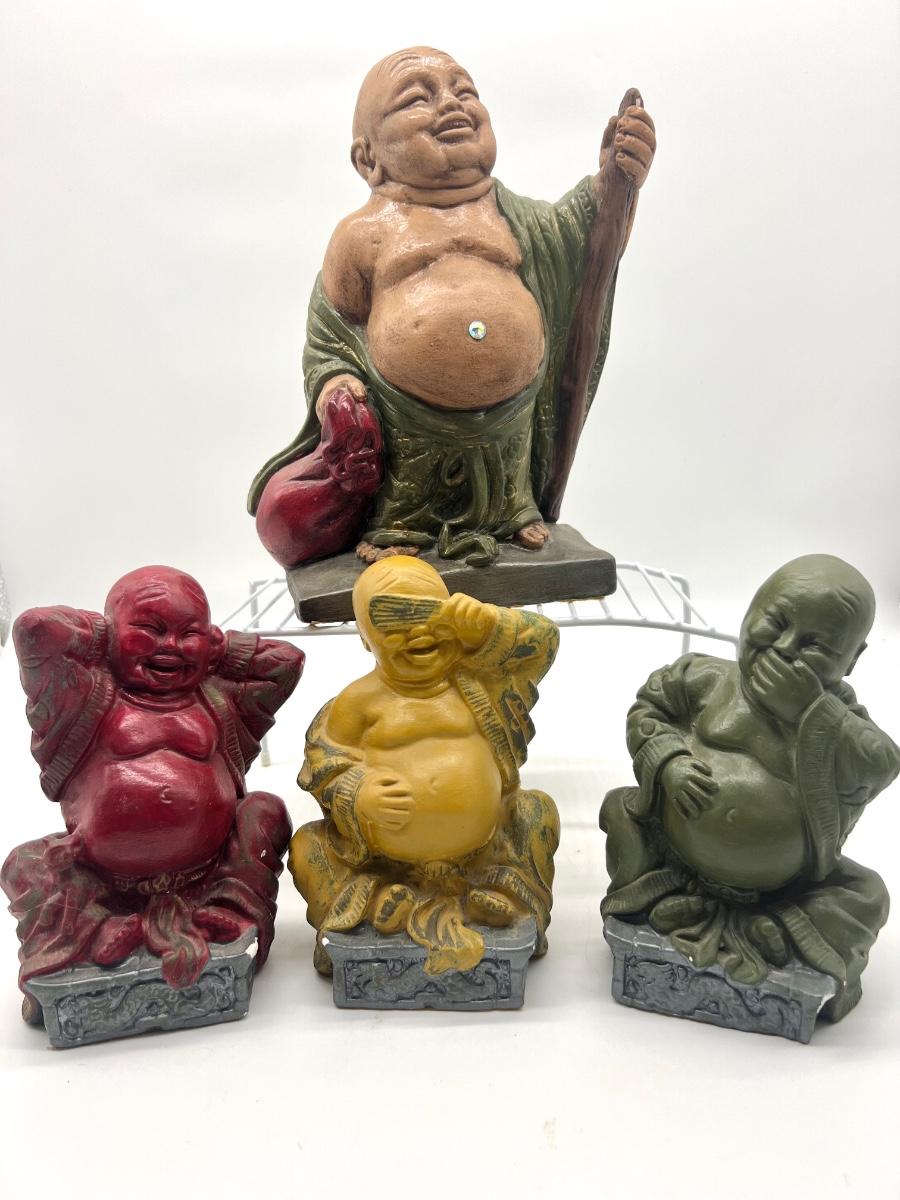 4 ceramic Buddha statues. Hear no evil, speak no evil, see no evil statues measure 7 inches tall and approximately 4 inches wide. Buddha with the bag measures 10 inches tall and approximately 8 inches wide. See pictures as some have minor chips or paint missing. Pictures show exact condition.