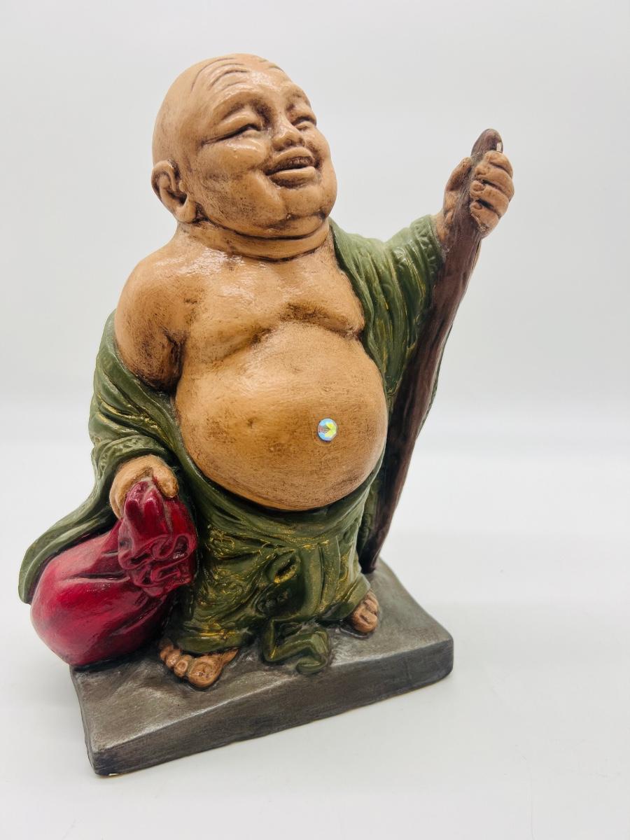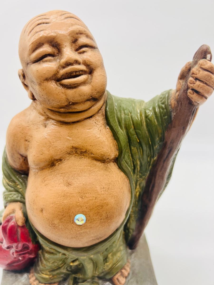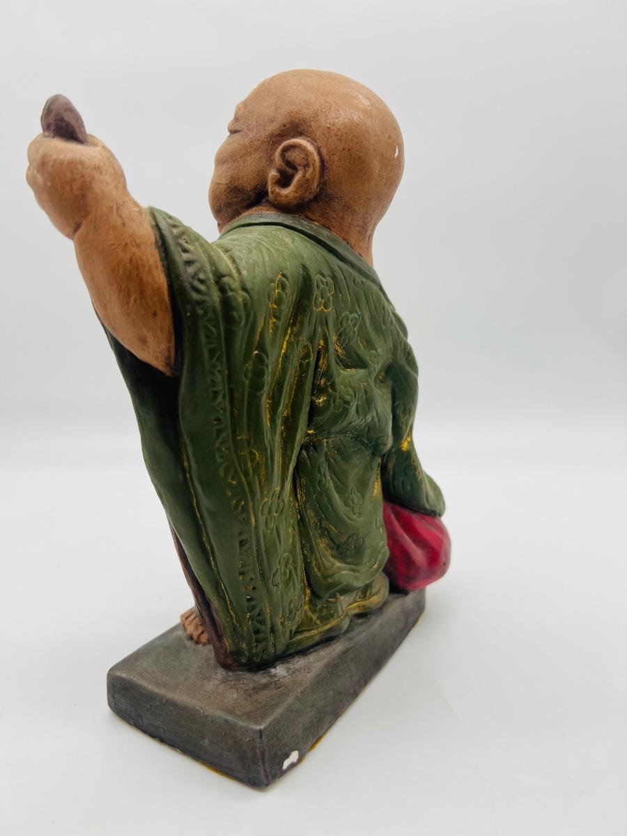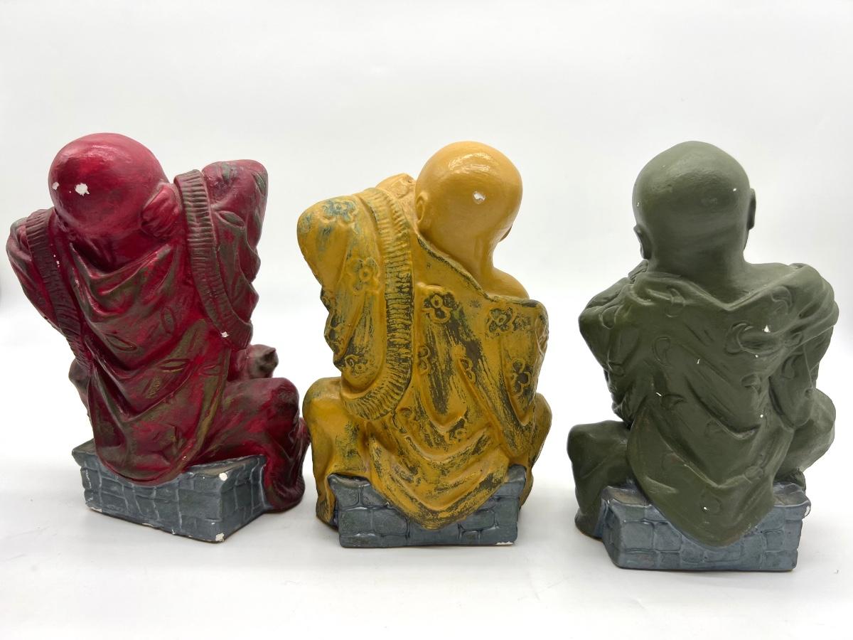 4 ceramic Buddha statues. Hear no evil, speak no evil, see no evil statues measure 7 inches tall and approximately 4 inches wide. Buddha with the bag measures 10 inches tall and approximately 8 inches wide. See pictures as some have minor chips or paint missing. Pictures show exact condition.
