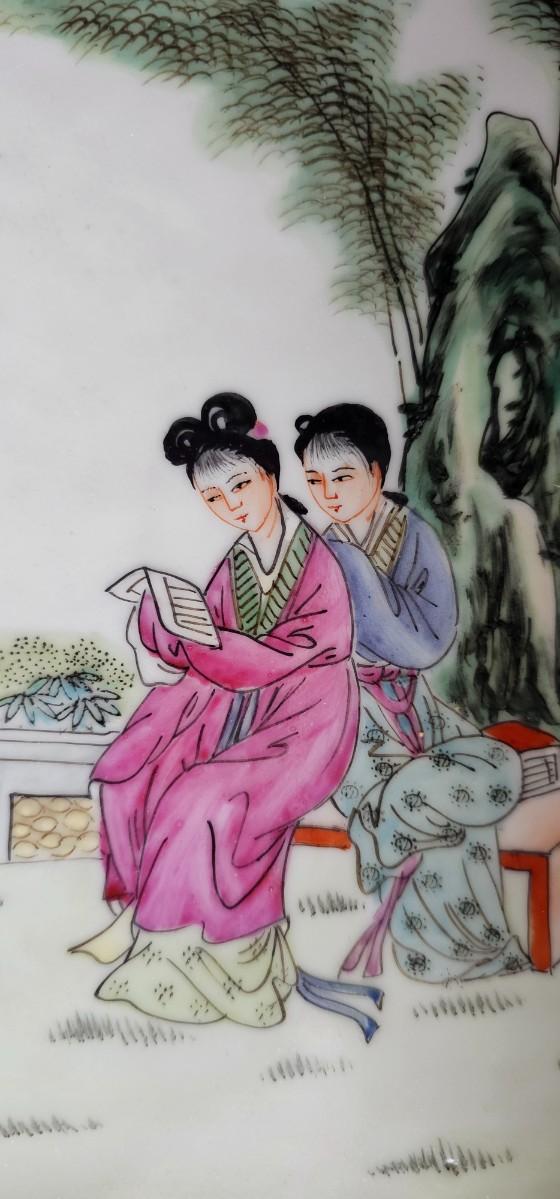 Each one depicts a scene with two women outside in beautiful setting talking, playing a game, sewing or other activities