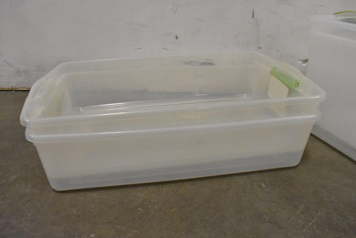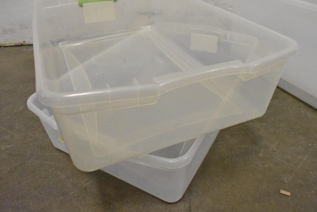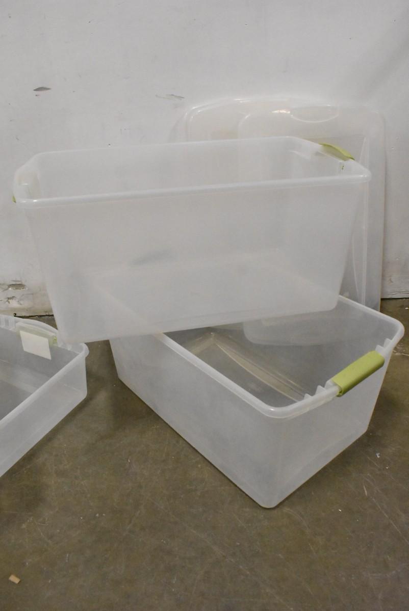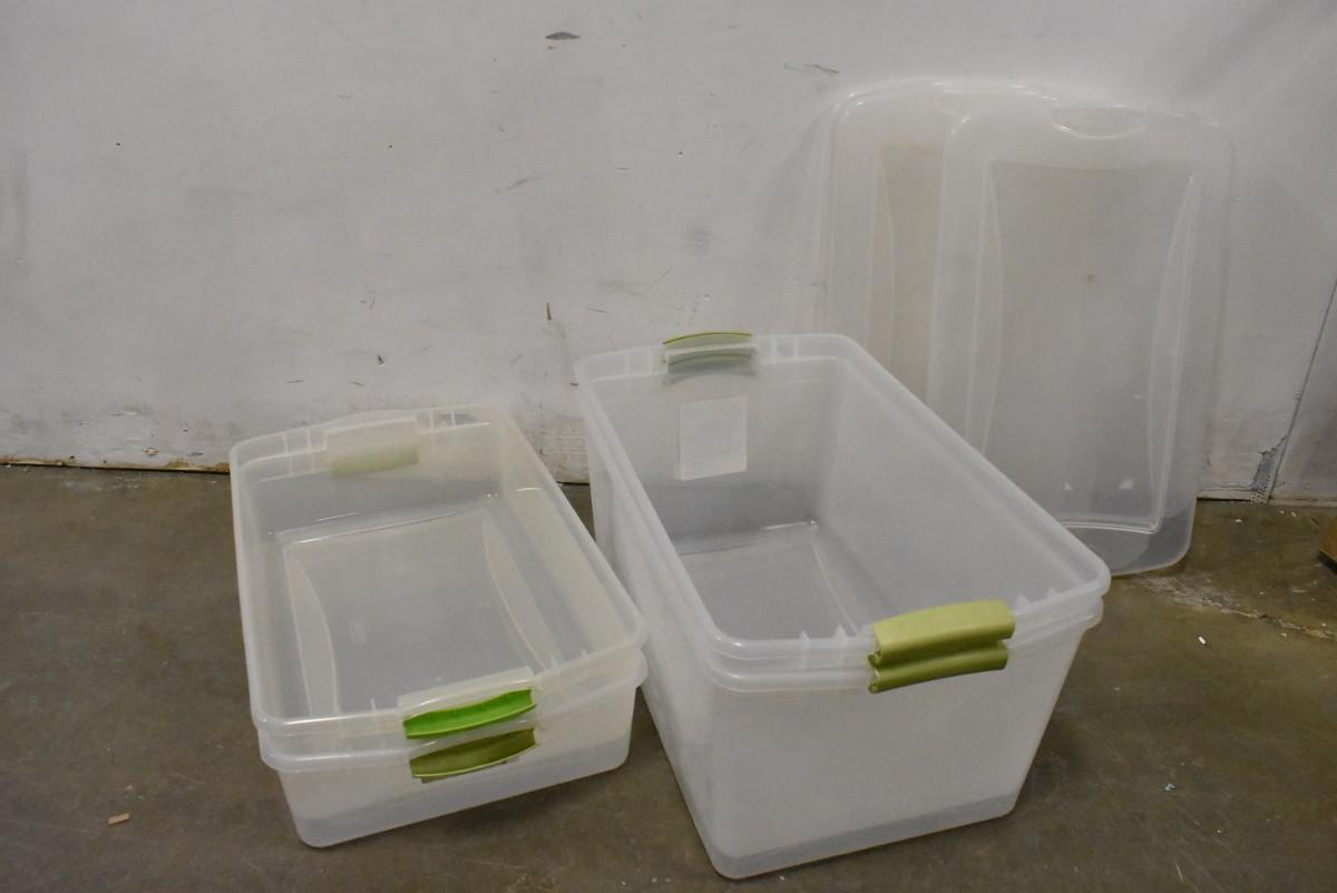 4 Clear Plastic Bins With Lids, 1 Handle Missing