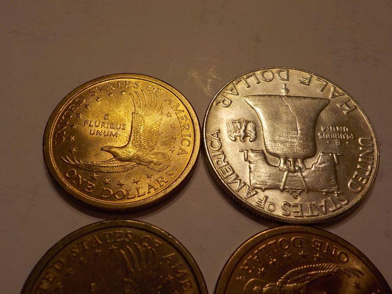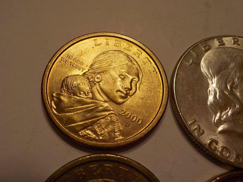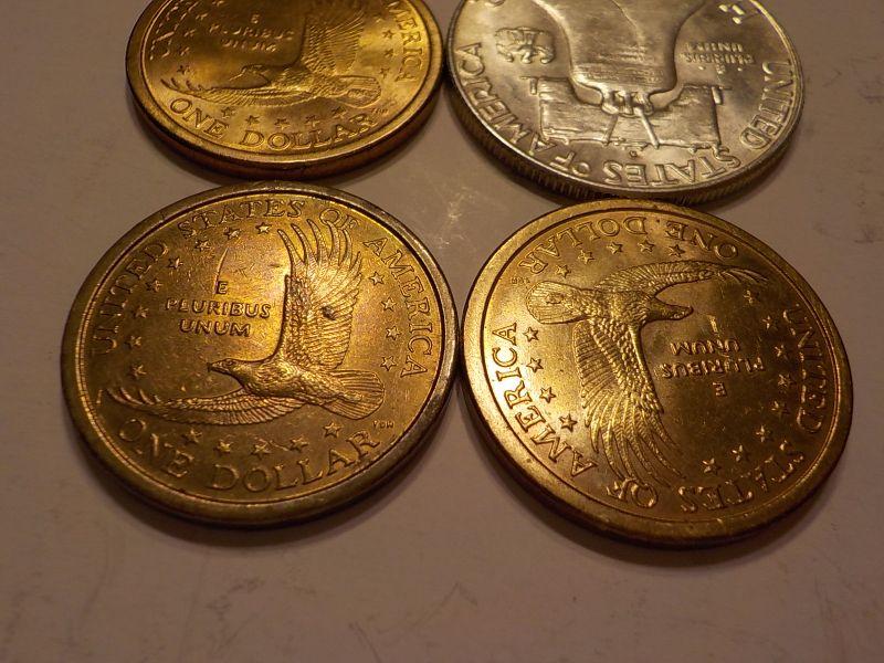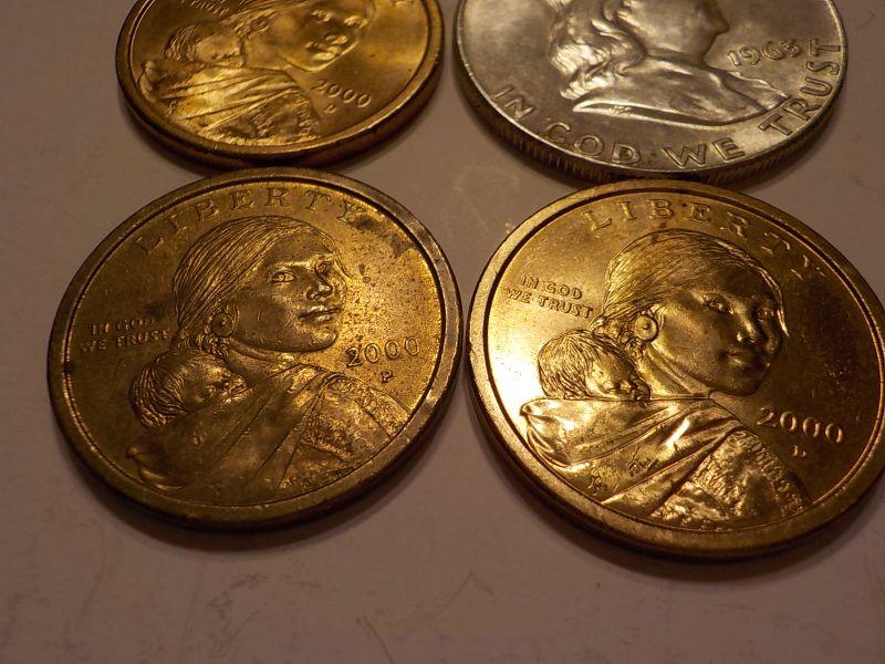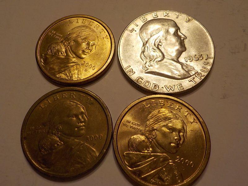 4 coins/ 1- 1963 Benjamin Half dollar, 3 one dollar sacajewa 2000p
