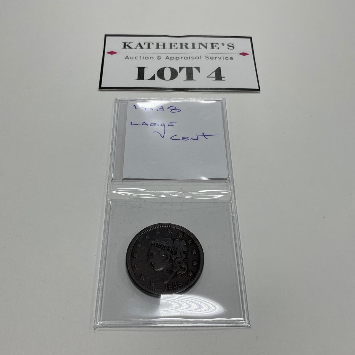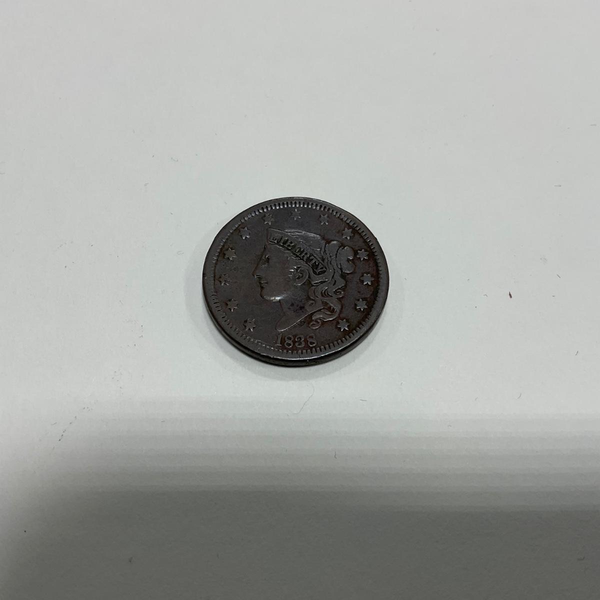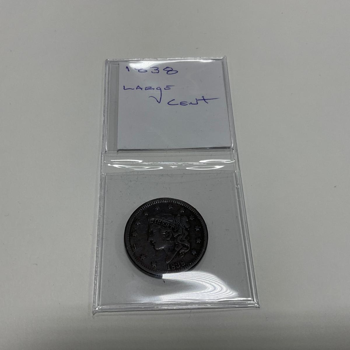 One 1838 Large Cent coin. Please see photos for details and condition. ::: Shipping is available on this lot. If you require shipping you must let us know at the close of the auction. We will coordinate with you after the item has been won. Shipping fees will include insurance up to or exceeding the value of all items being mailed. If you have any questions regarding this lot please contact the auctioneer either via this website, by direct email or by phone. PICK UP TIMES and other important information can be found in the TERMS and DESCRIPTION of the auction. Please take a look for pertinent information. Thanks!