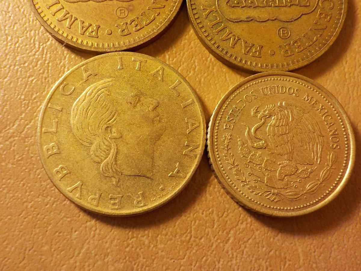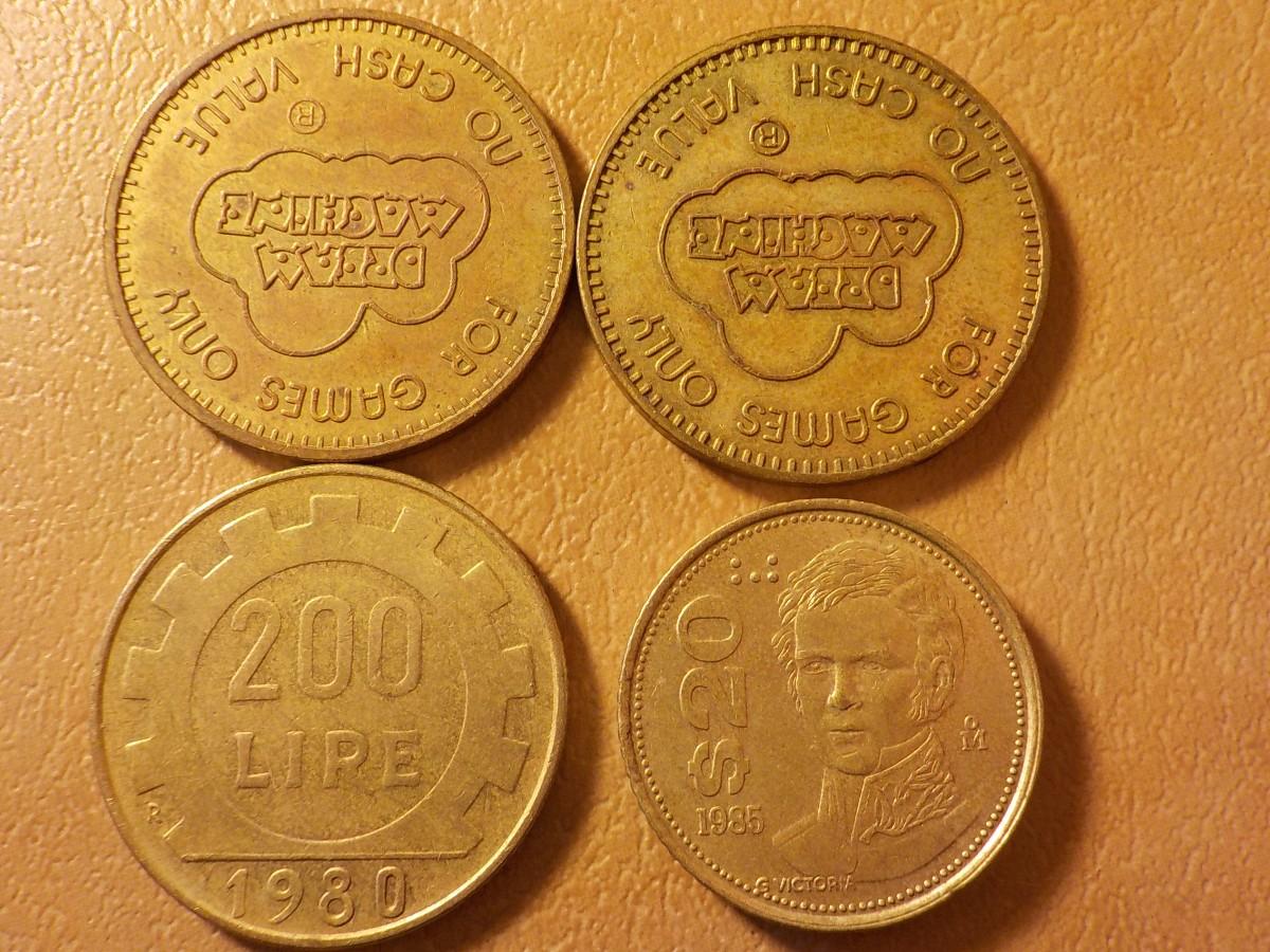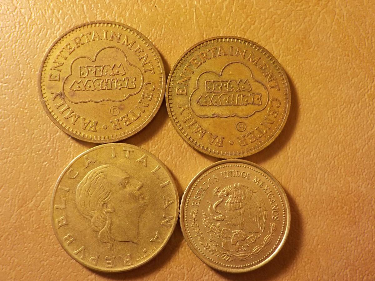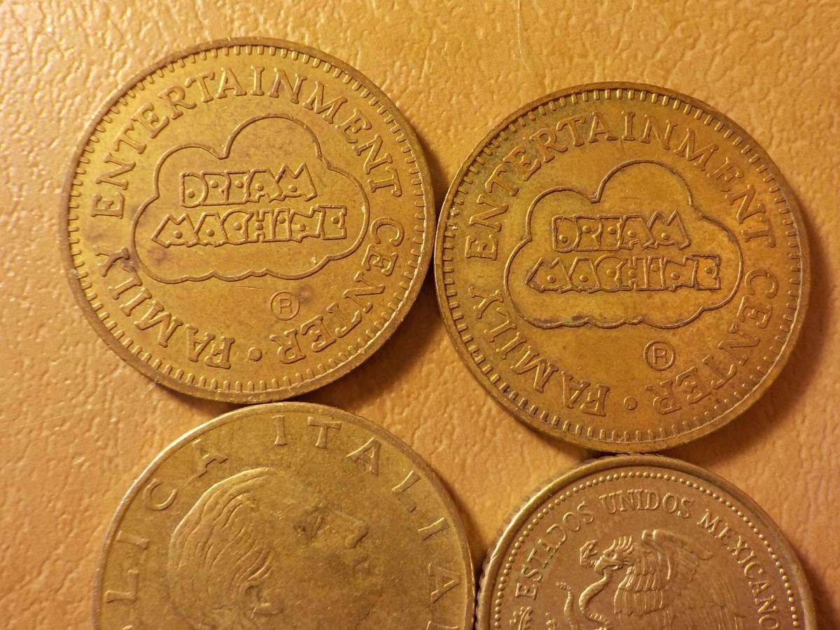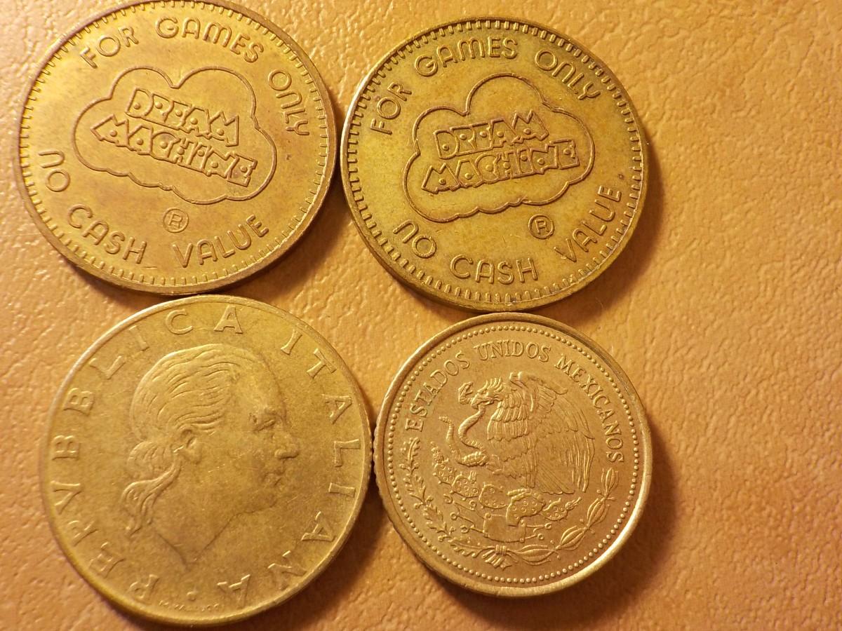 4 coins, 2 Dream Coins and peso and Denmark coin.