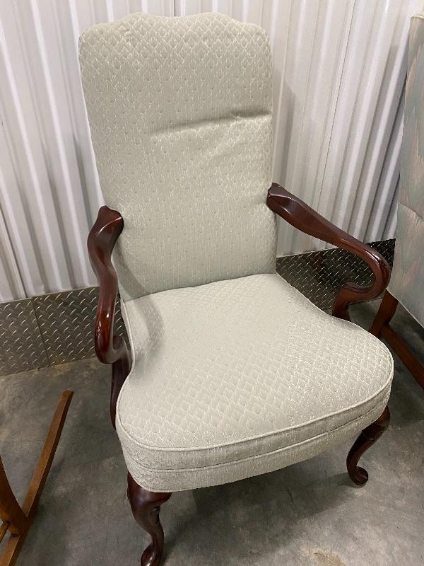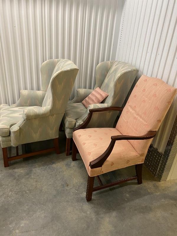 Cute peach and light green colored chairs with wooden arms will lighten up your room. 25"w x 27"d x 42"h (peach), 27”w x 27” d x 42”h (green). Bump on fabric back part of chair is from furniture leaning on it in the storage unit. This will likely fall out over time but can not guarantee.