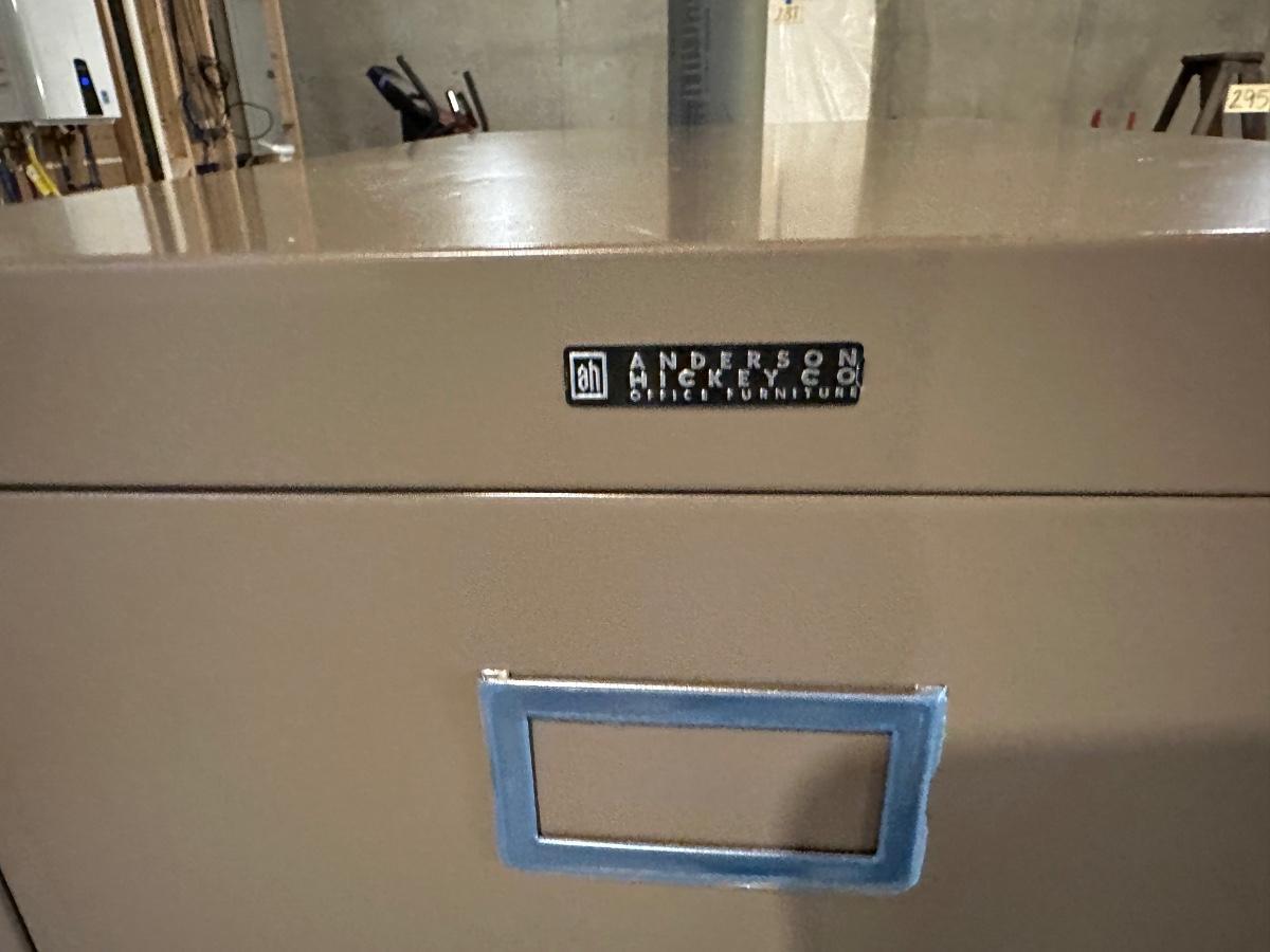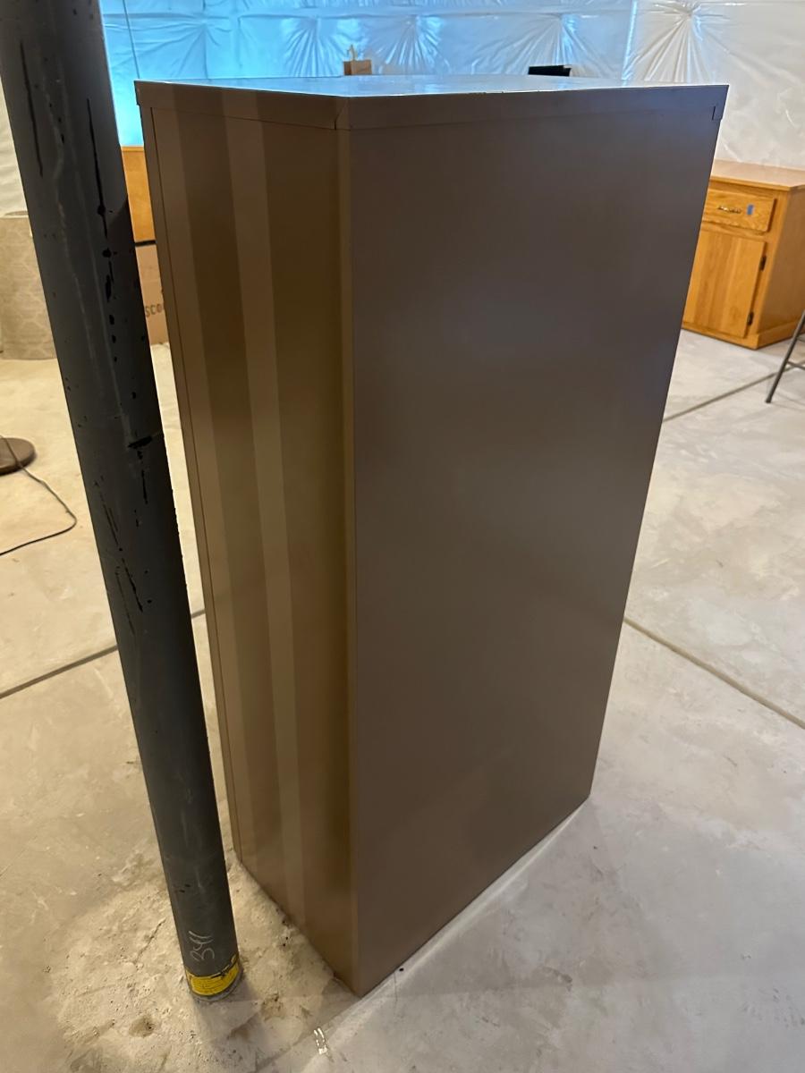 Tan filing cabinet measures 52-1/4”H x 15”W x 25-1/4”D