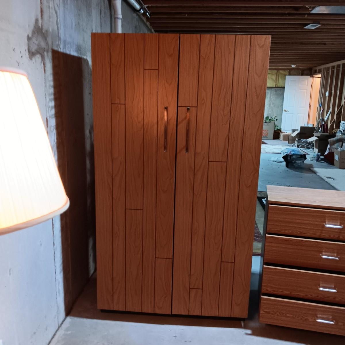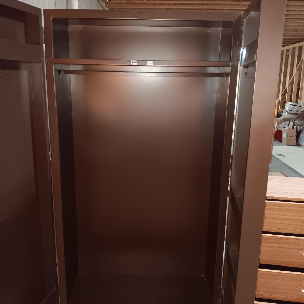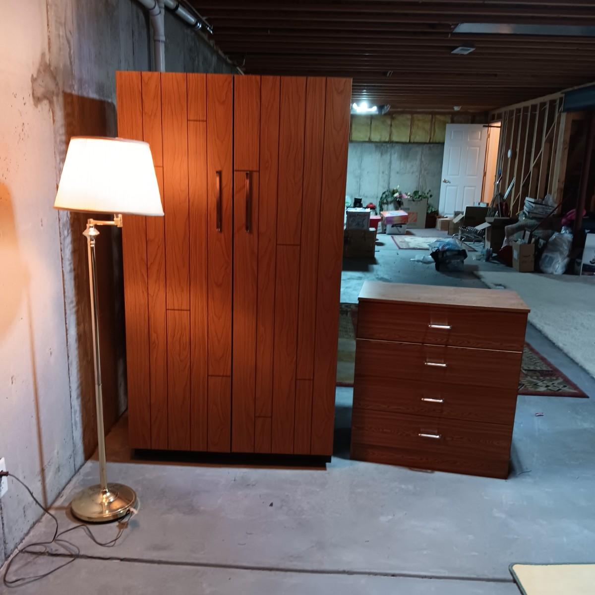 4 DRAWER CHEST, METAL WARDROBE CLOSET AND A FLOOR LAMP
