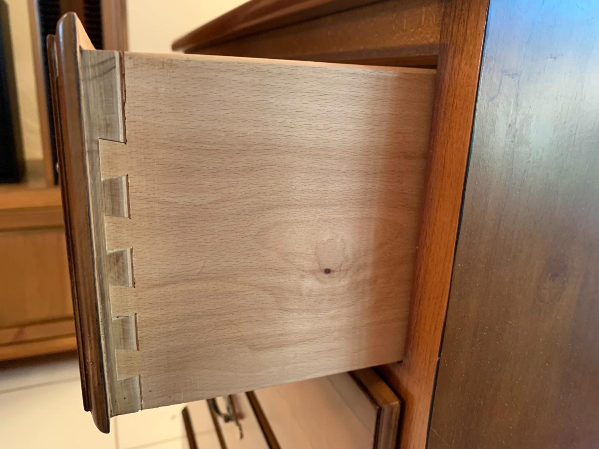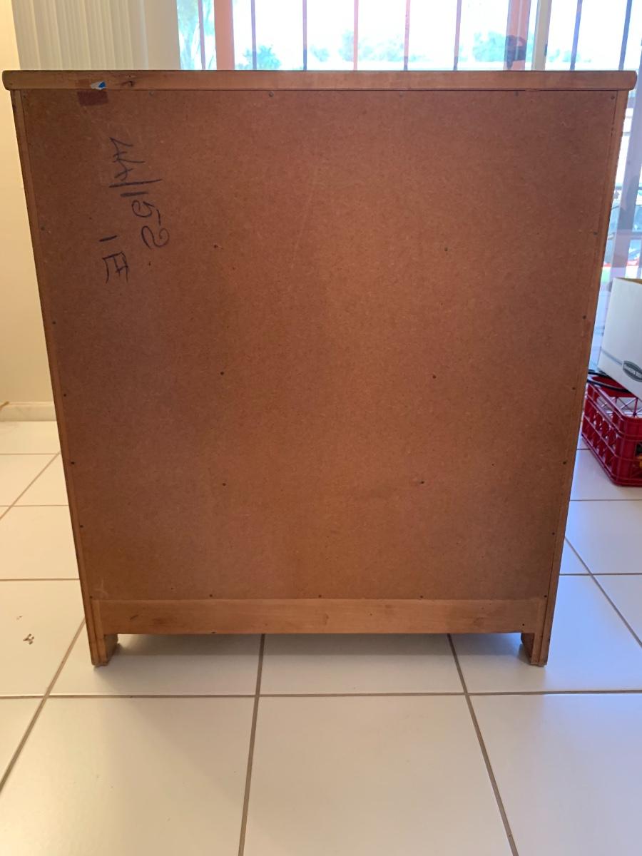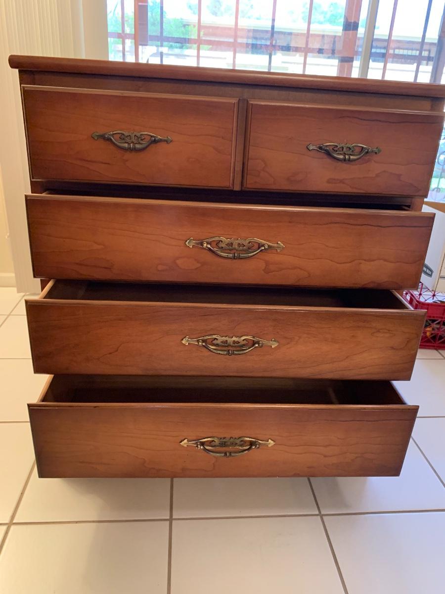 Vintage wood dresser with 4 dovetailed drawers and brass pulls. Of the 2 dressers available (see separate listing) this one has a slightly darker stain and one small blemish to edge of the top.