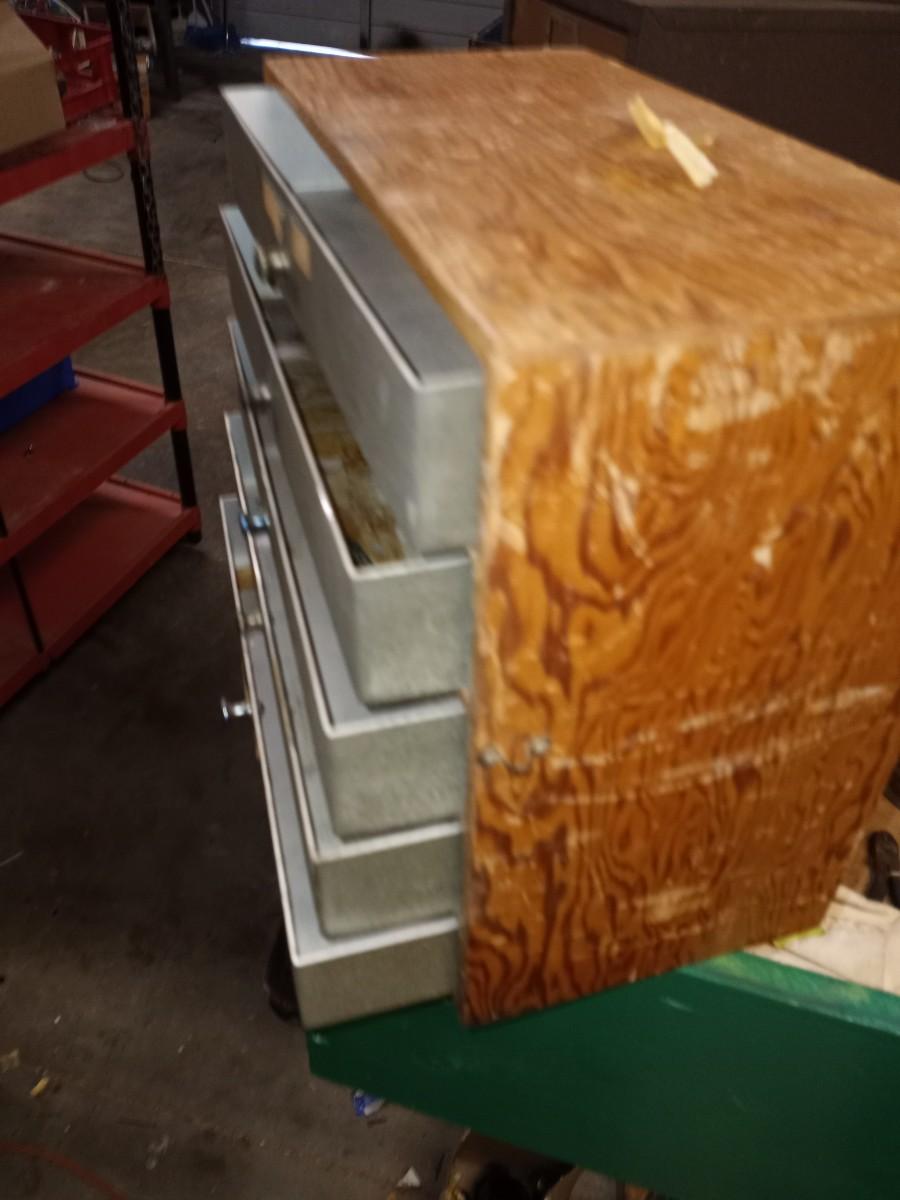 Drawers are metal and case is custom wood. Very nice and it came with our purchase of the vintage kennedy storage drawer sets.