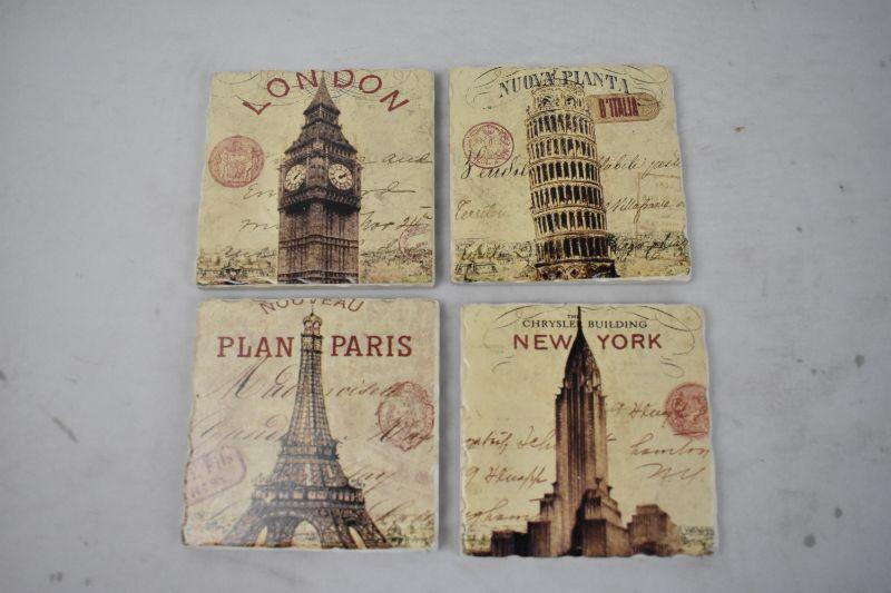 4 Drink Coasters: Ceramic with Cork: London, Italy, Paris, & New York