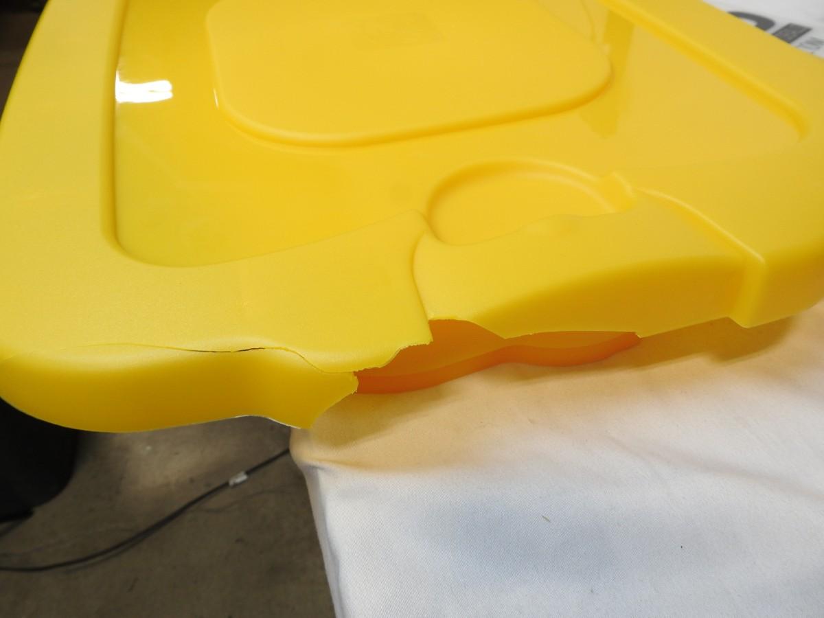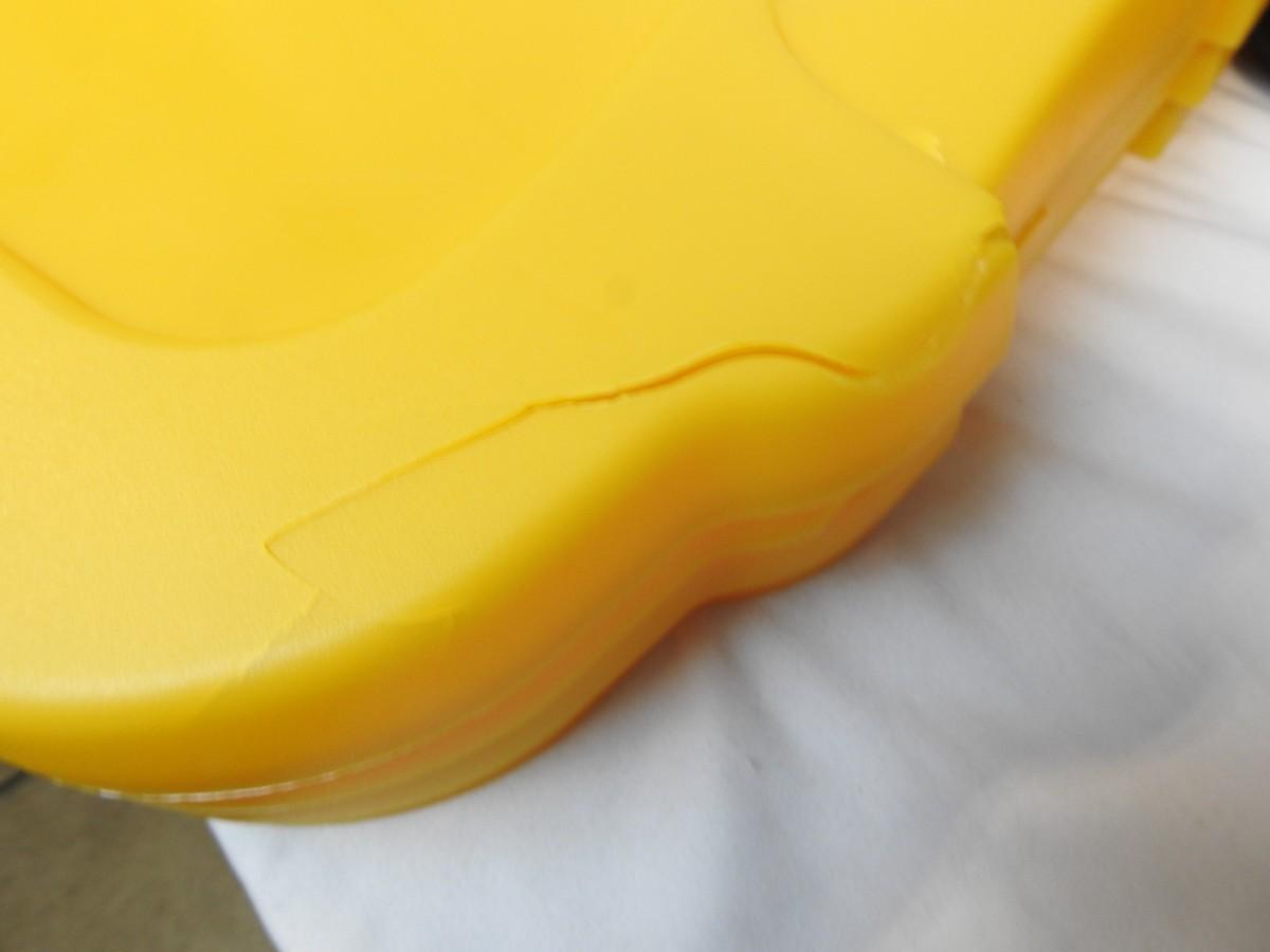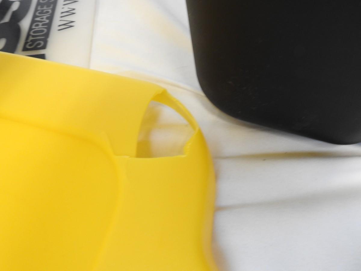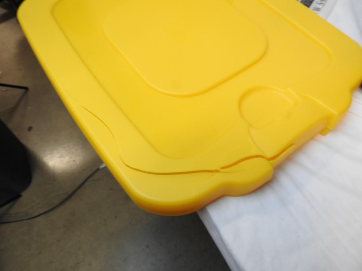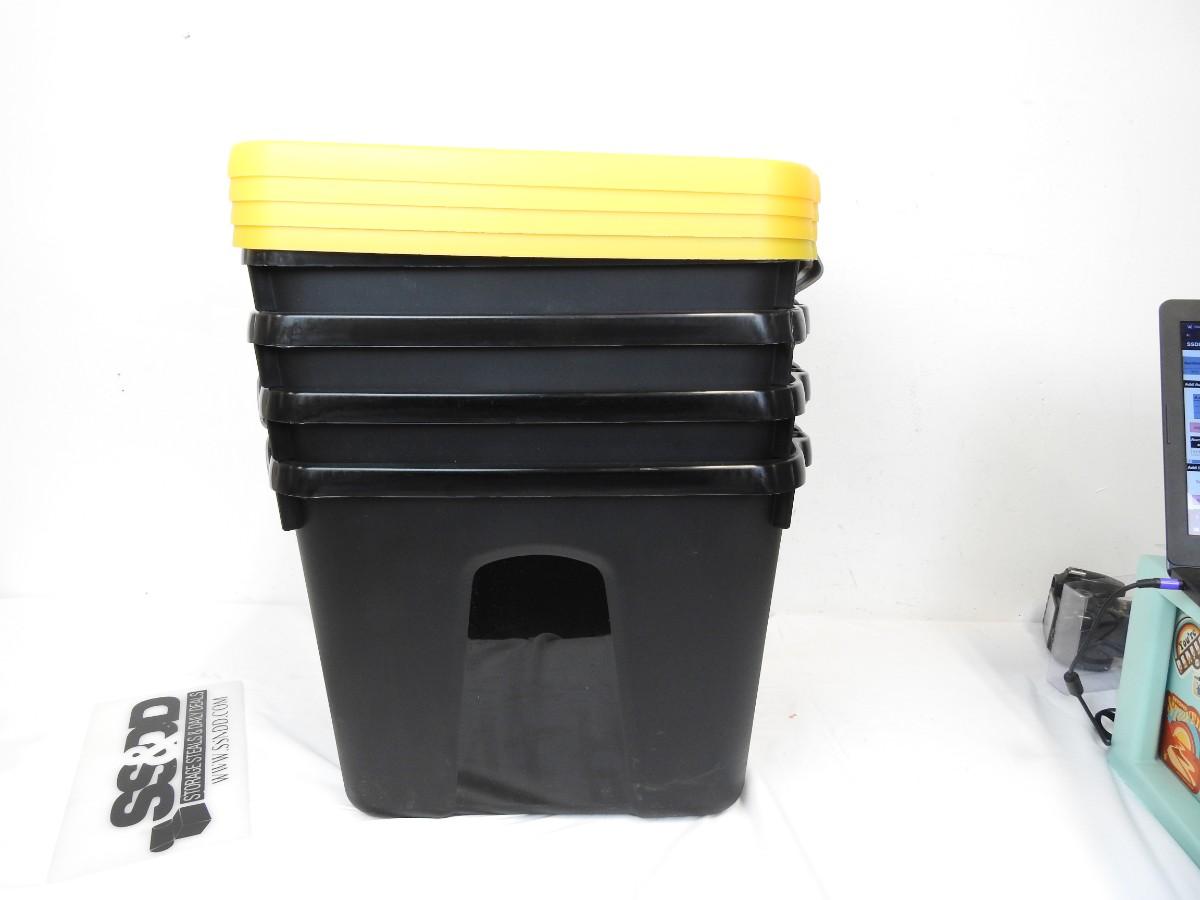 4 Durabilt 10 Gallon Tubs. Black with Yellow Lids (Lids damaged, see pics)