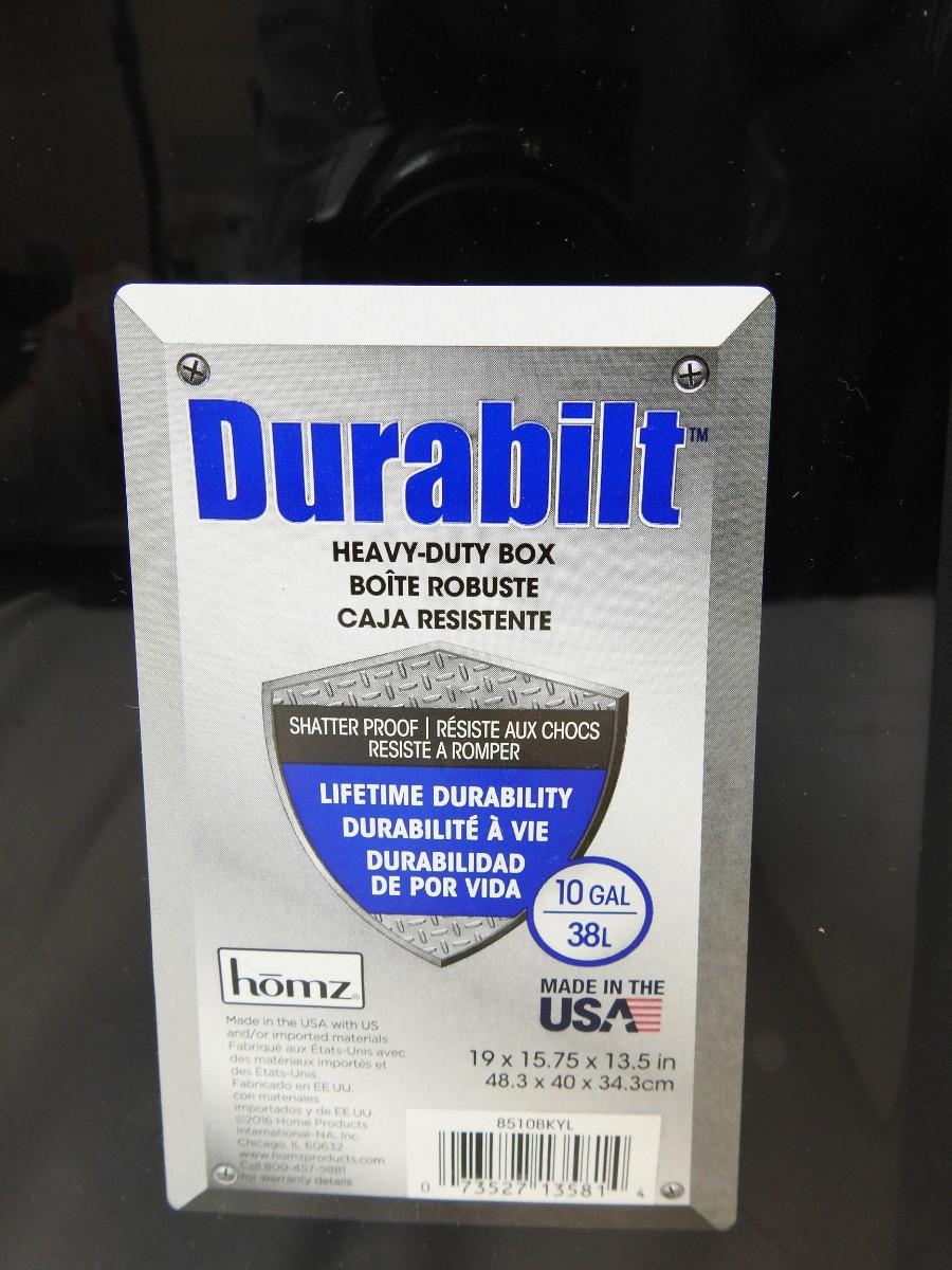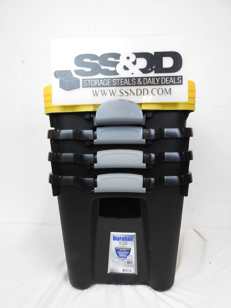 4 Durabilt 10 Gallon Tubs.  Black with Yellow Lids (Lids damaged, see pics)