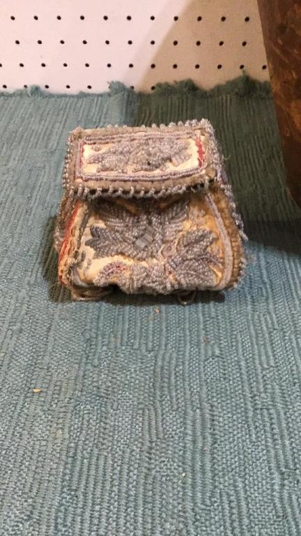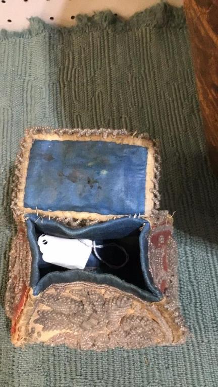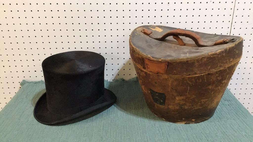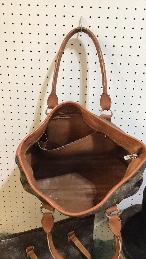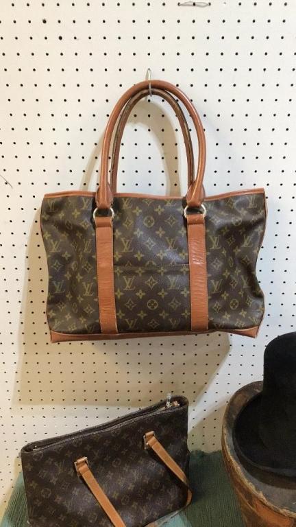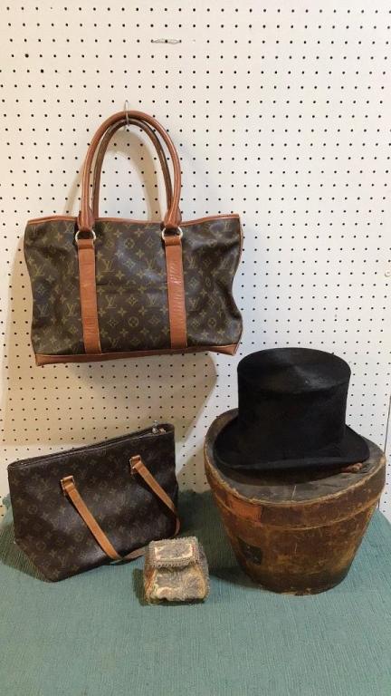 2 Reproduction Louis Vuitton bags, wear to interiors and exteriors from age and use, leather loss on straps..small beaded bag, flower and butterfly motif..hat box with beaver hat, box marked Blaylock & Blynn, hat