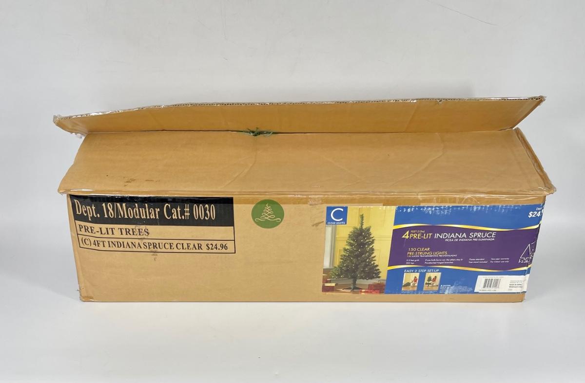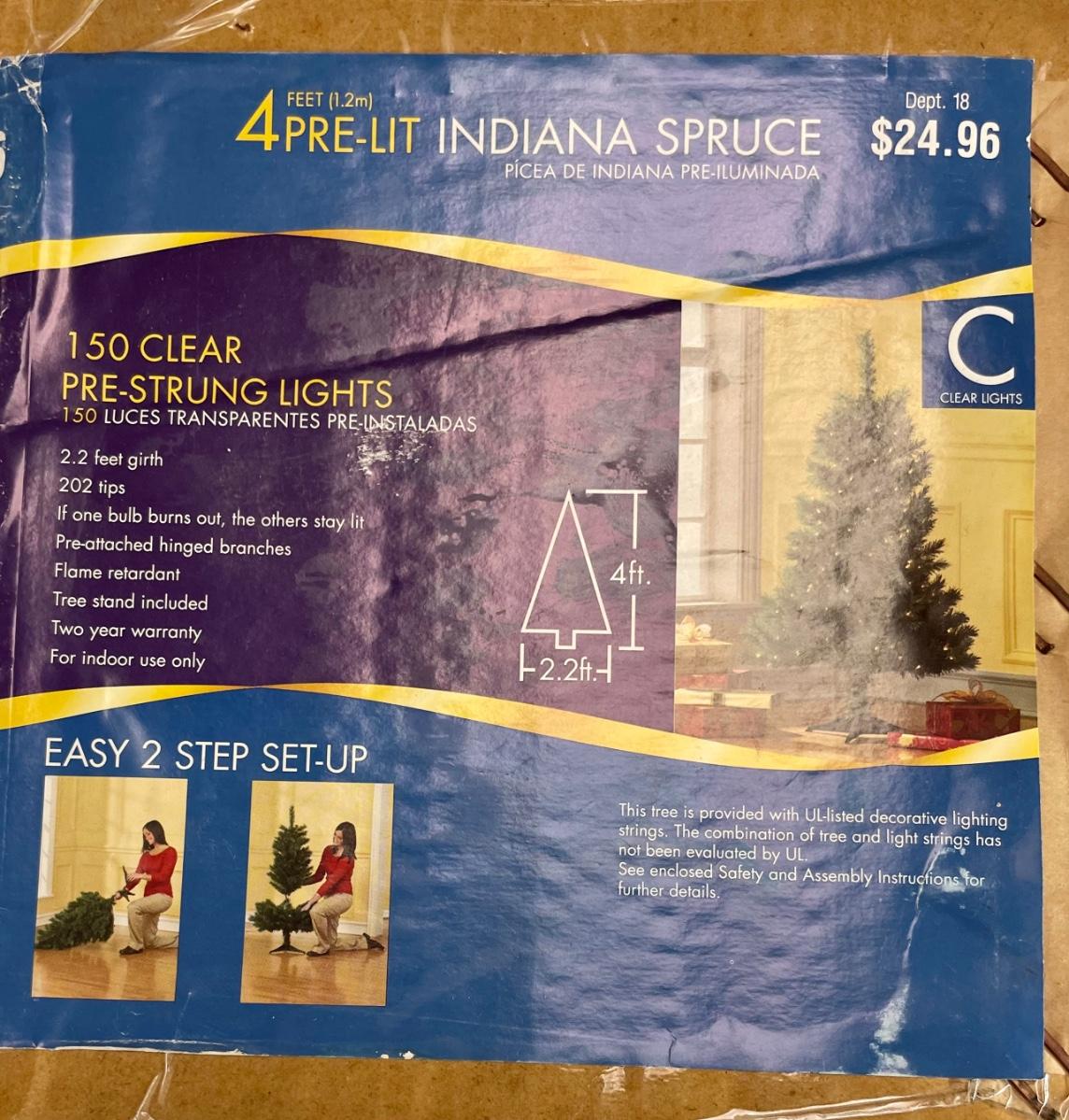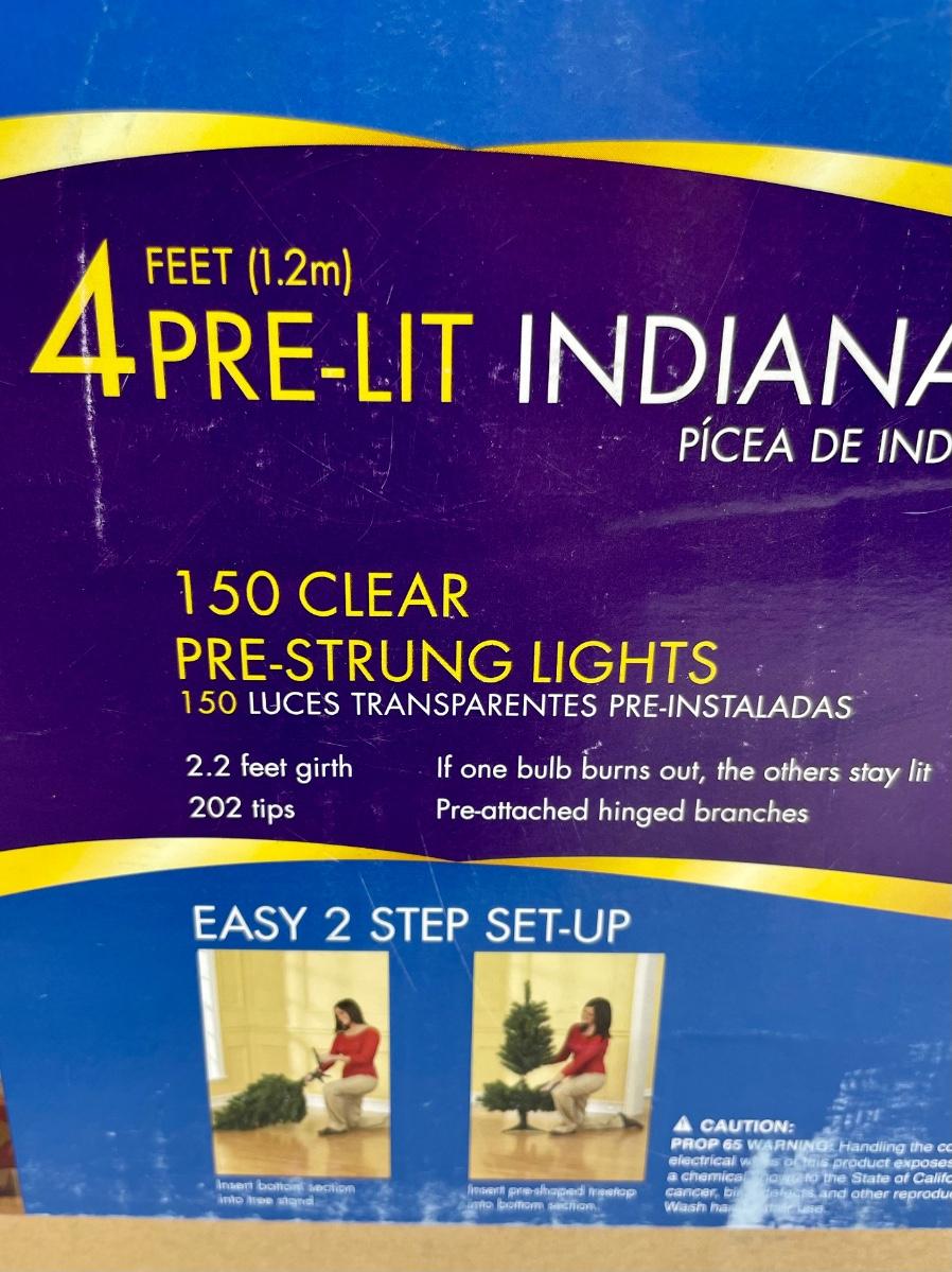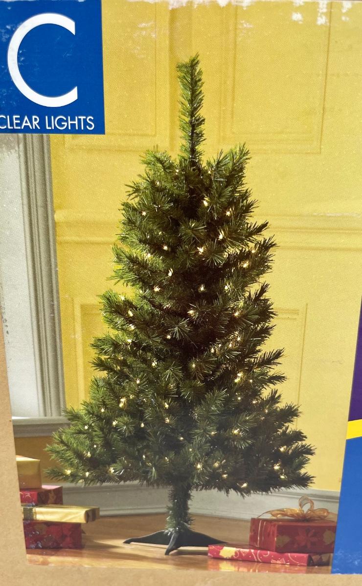 Artificial Christmas tree 4 feet tall, pre-lit with 150 clear lights. Stand included. Originally sold through Walmart.