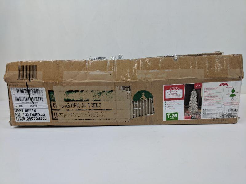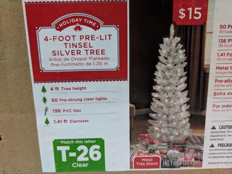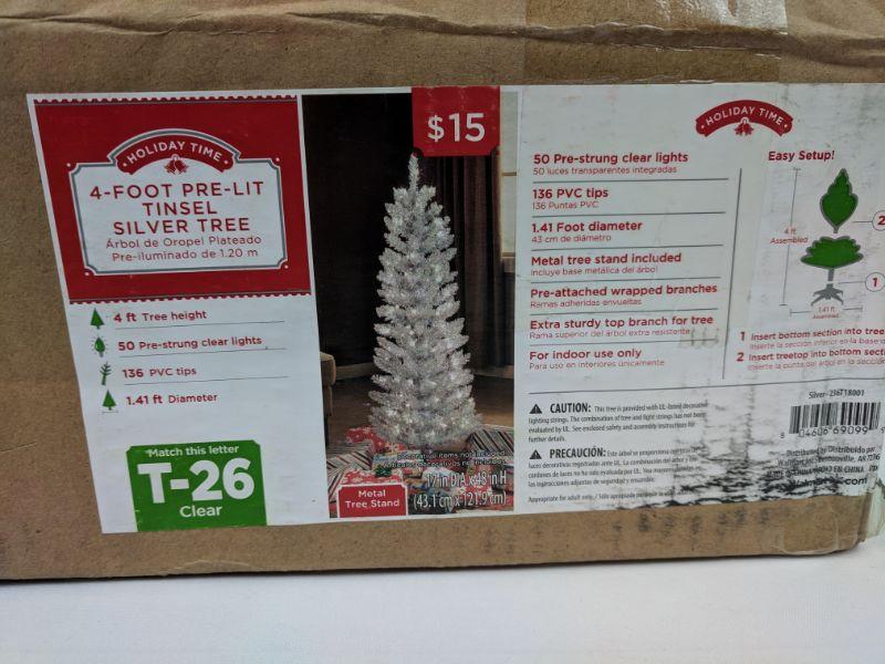 4 Foot Pre-Lit Tinsel Silver Tree, T-26 Clear, Metal Tree Stand - New