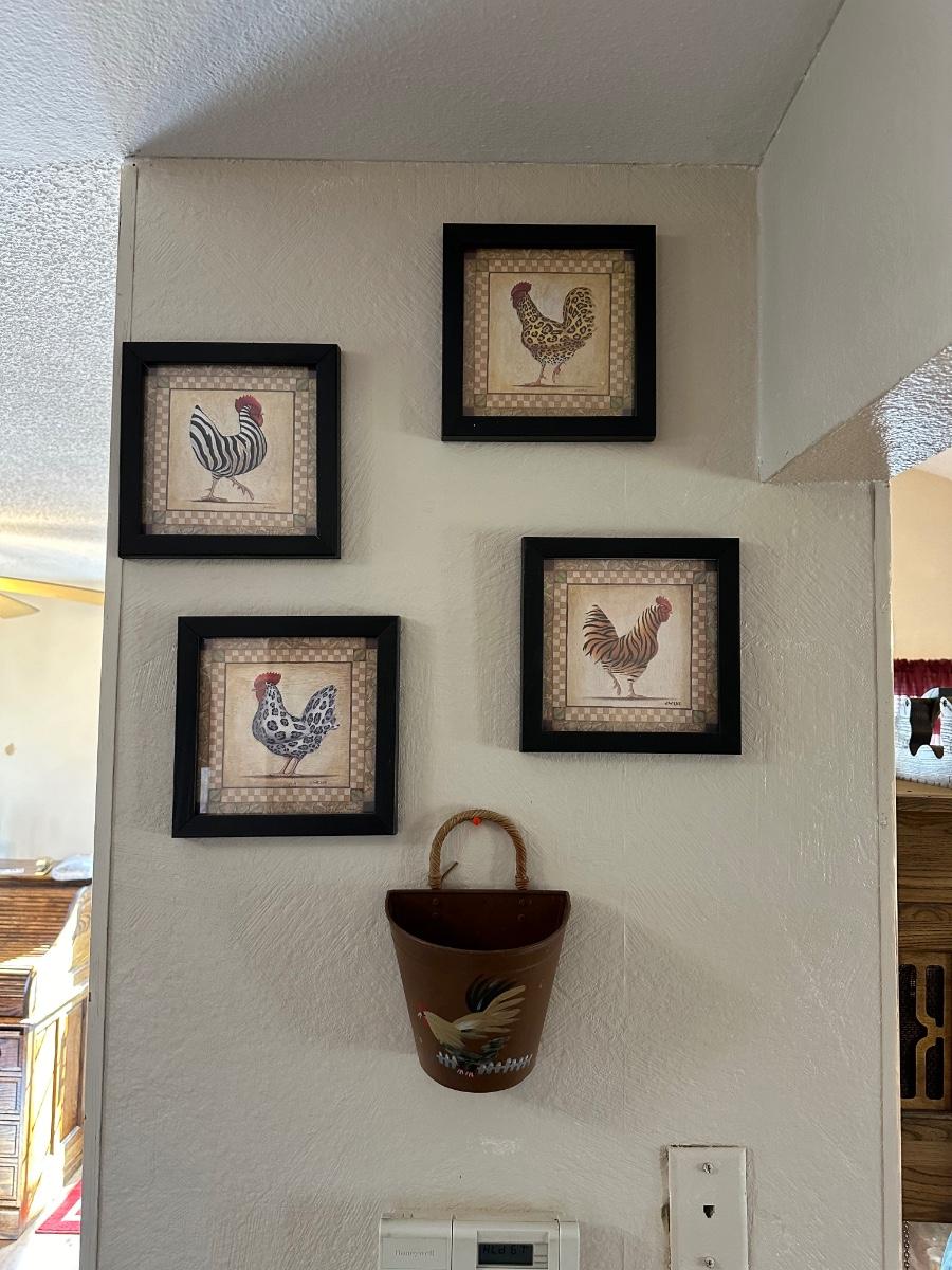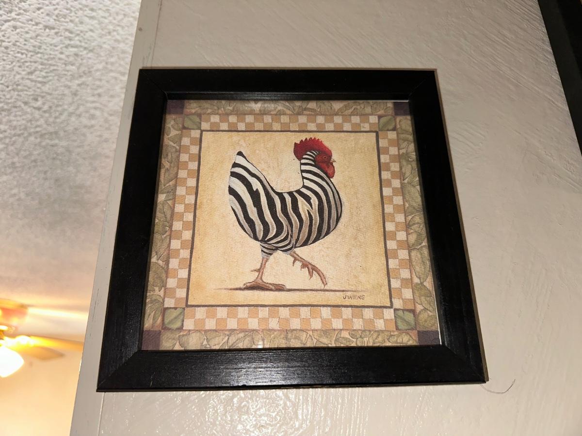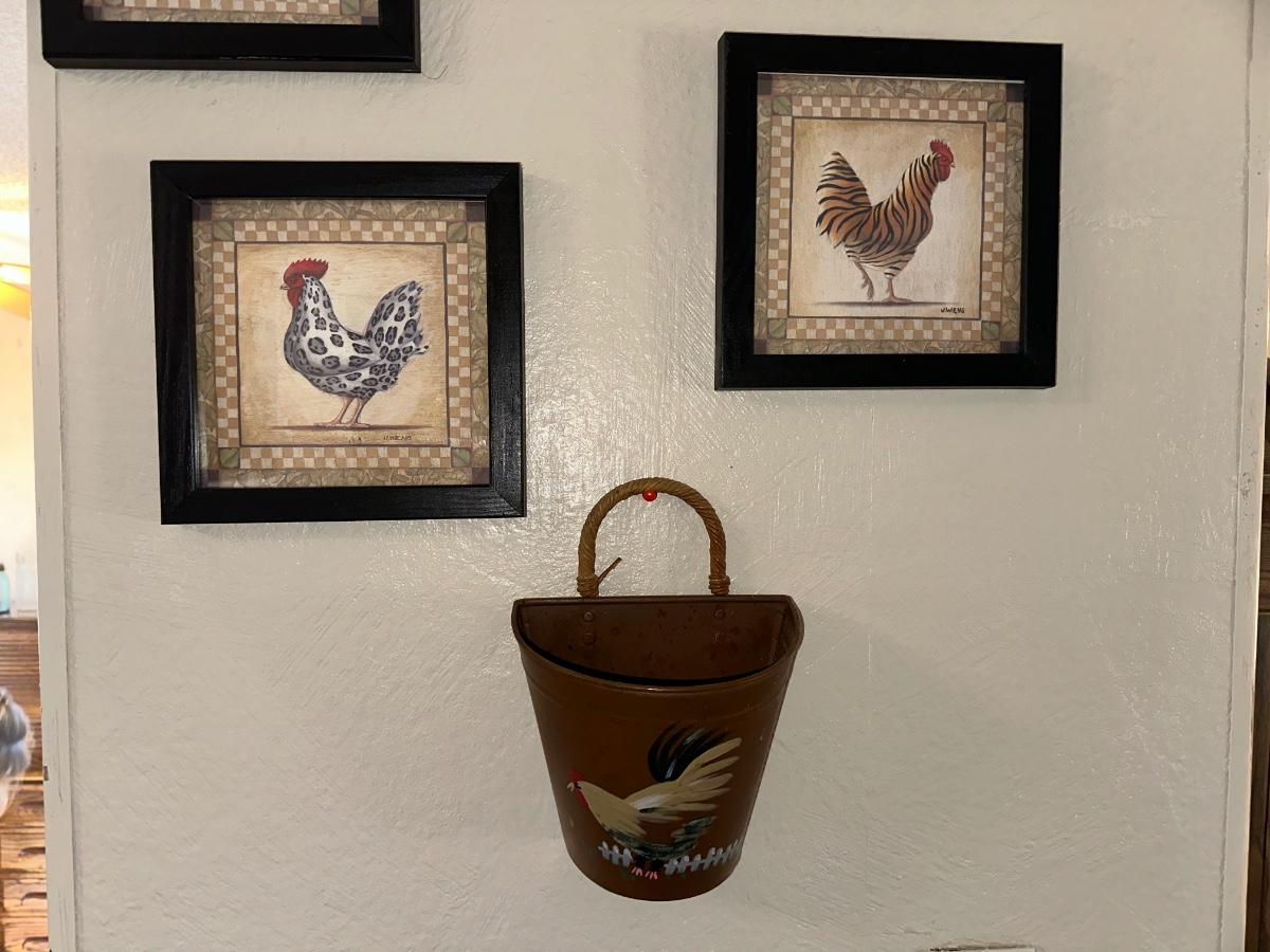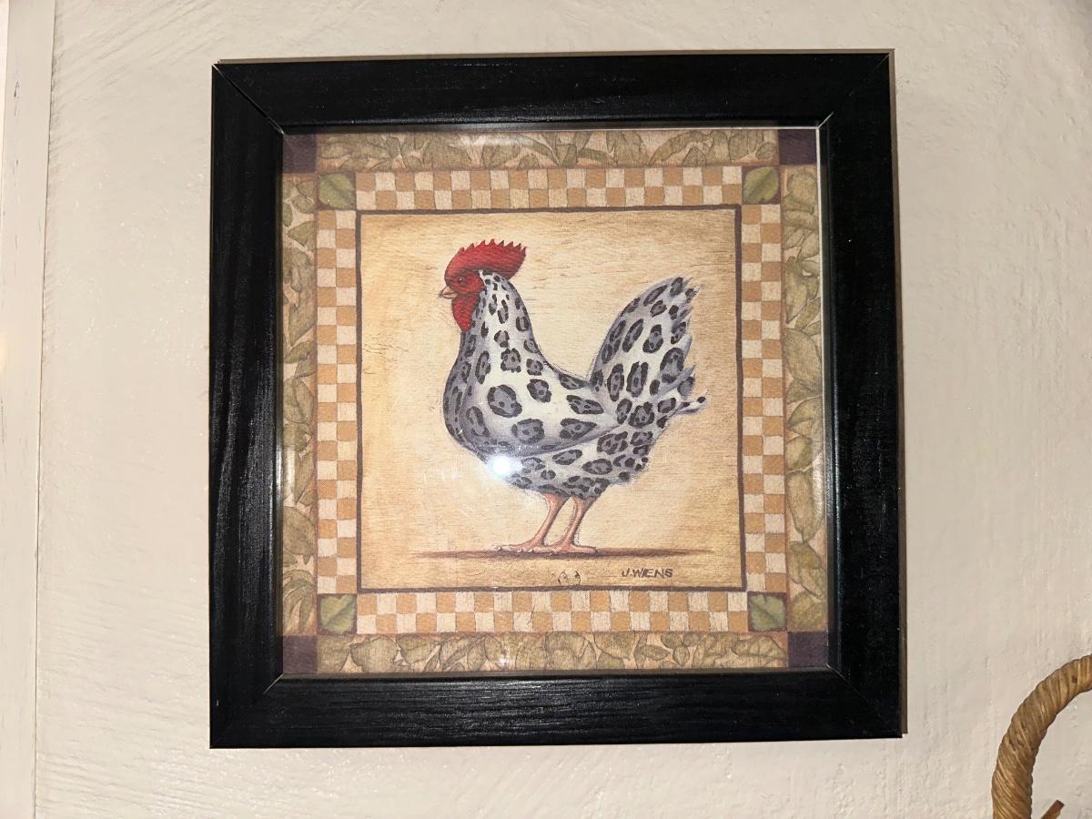 4 FRAMED ROOSTER PICTURES AND A BASKET