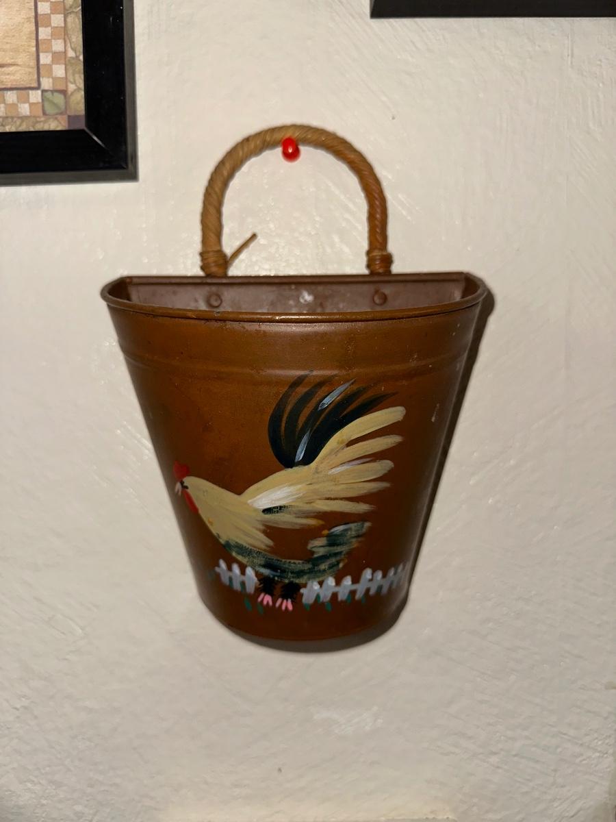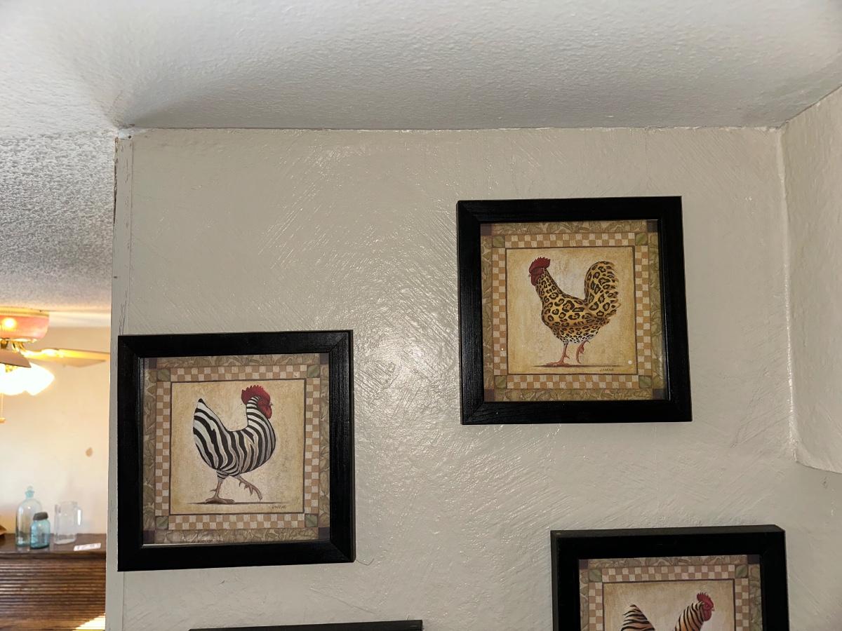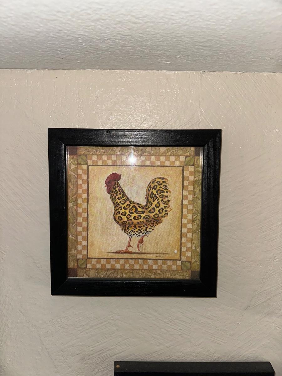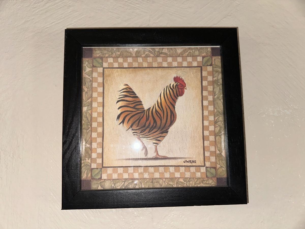 4 FRAMED ROOSTER PICTURES AND A BASKET