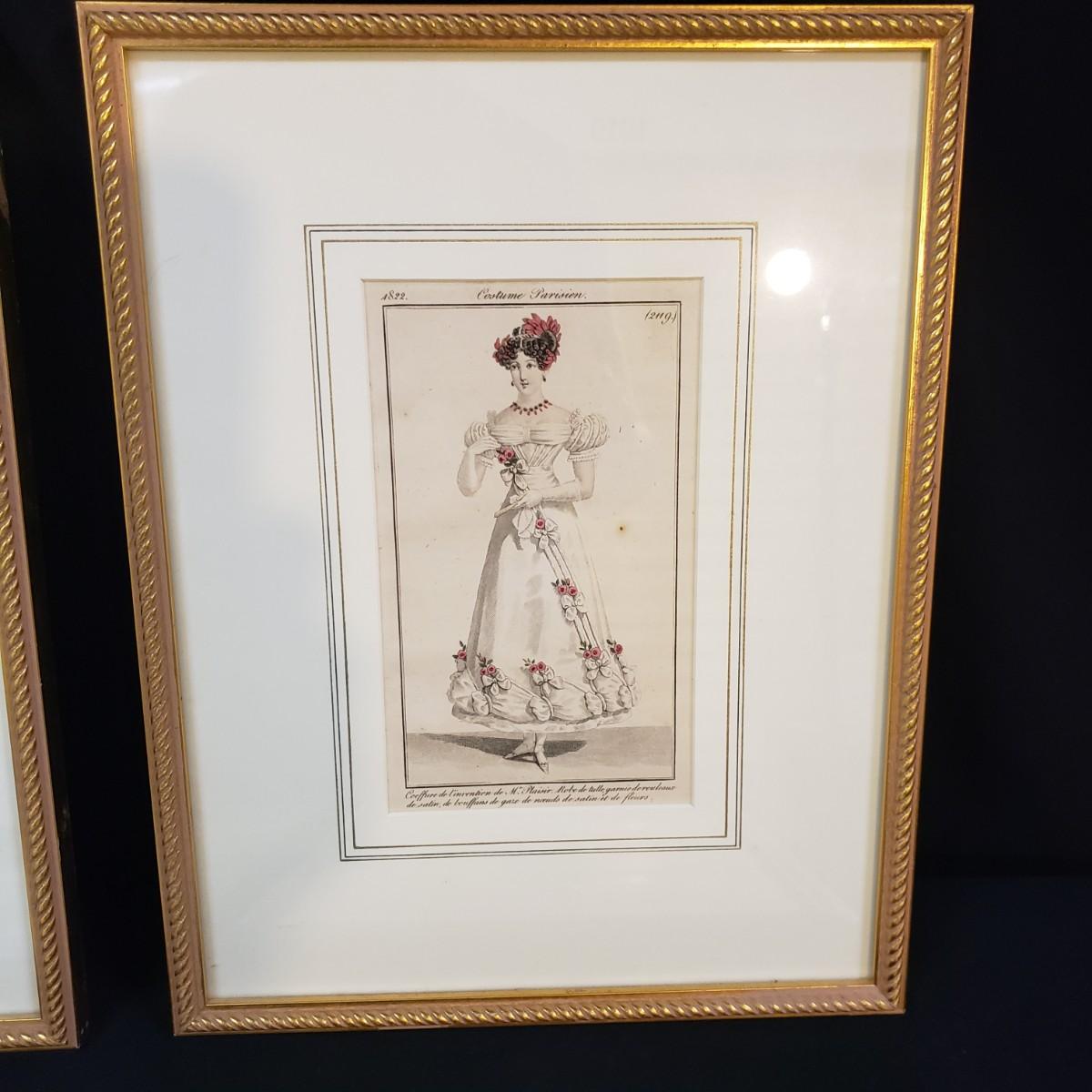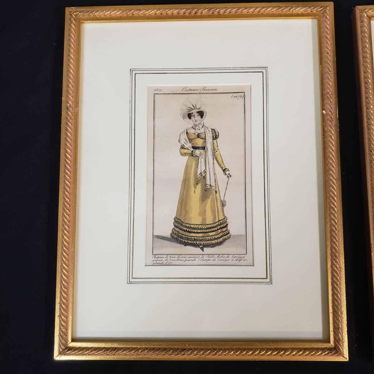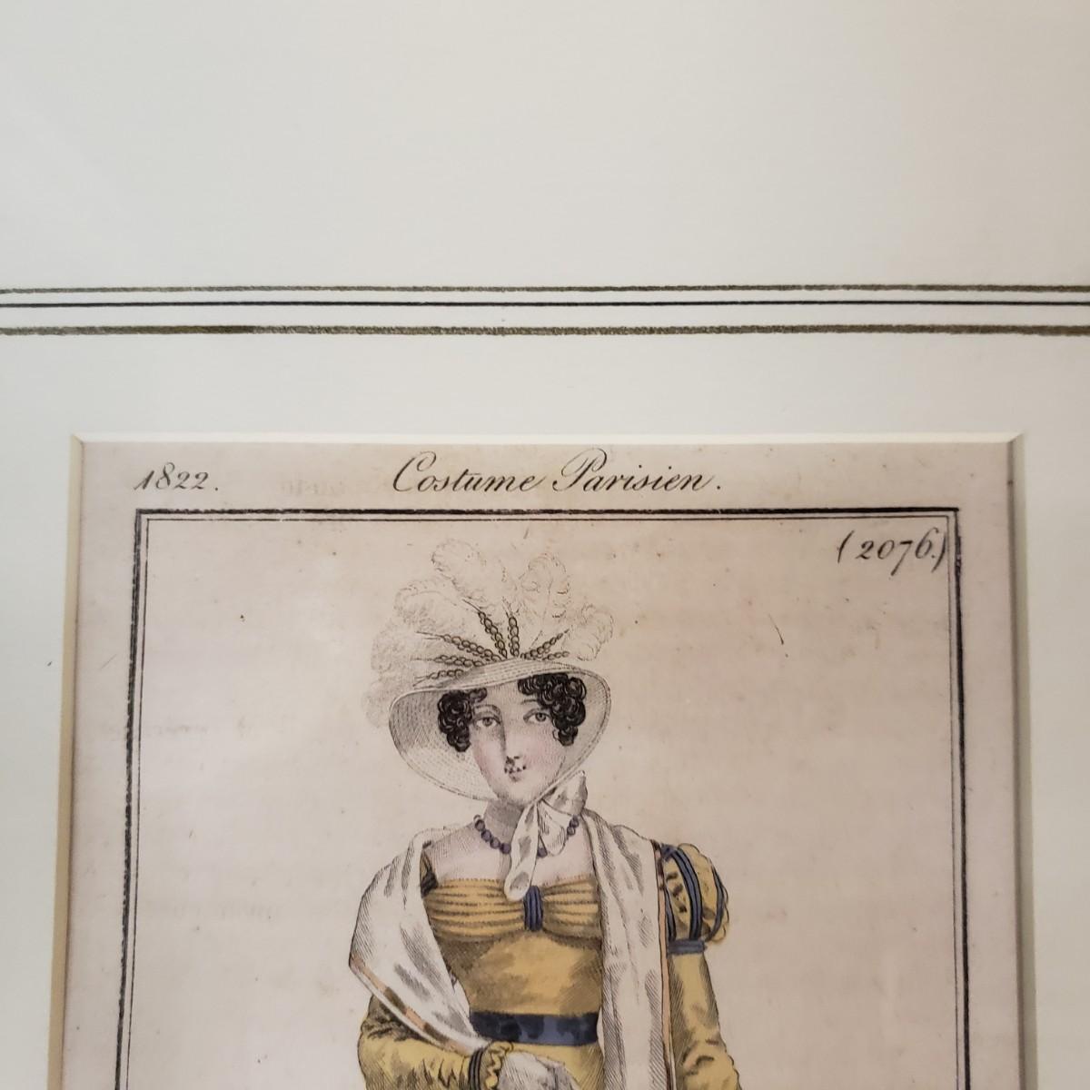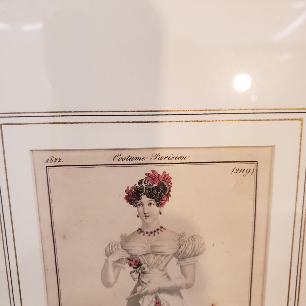 These matching frames with matting contain hand colored pictures of Costumes of Parisians measuring approximately 10.5"x13". They have 1822 and 1823 written on the front. The pictures appear to be in good condition with no chips. The pictures are old and have some discoloring on the paper as seen in the pictures.