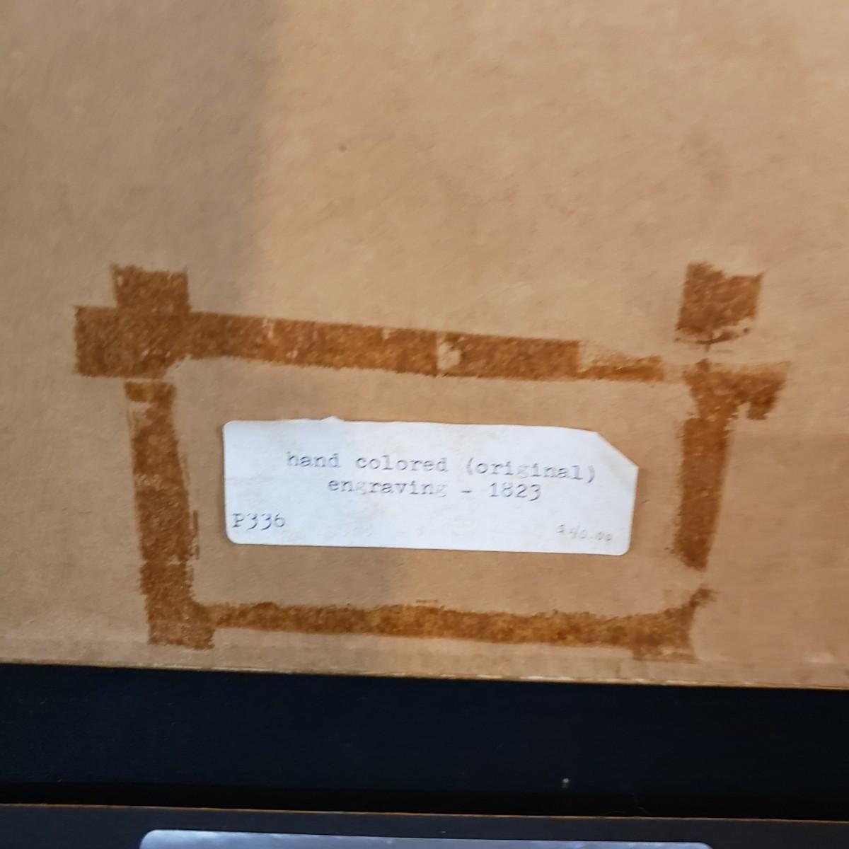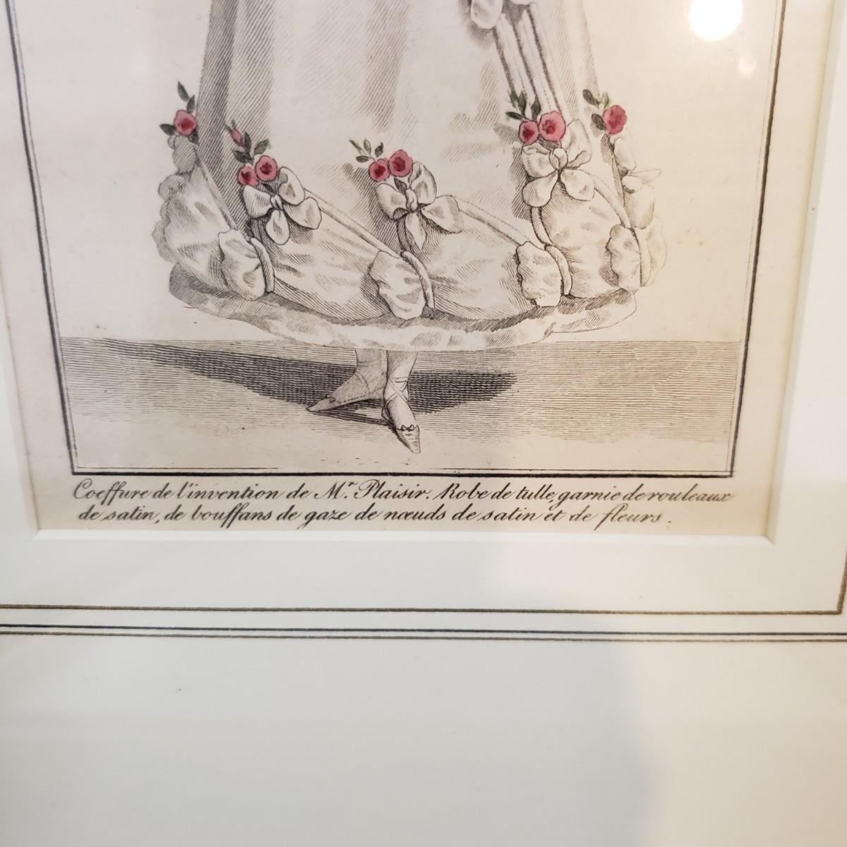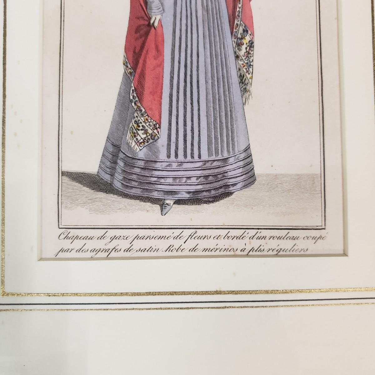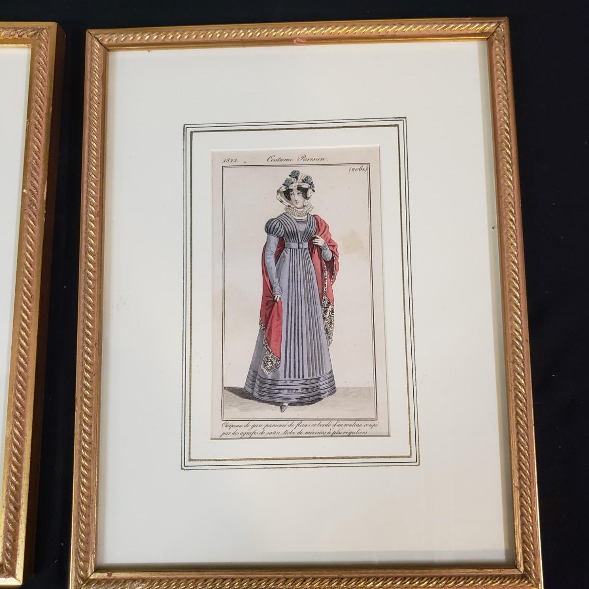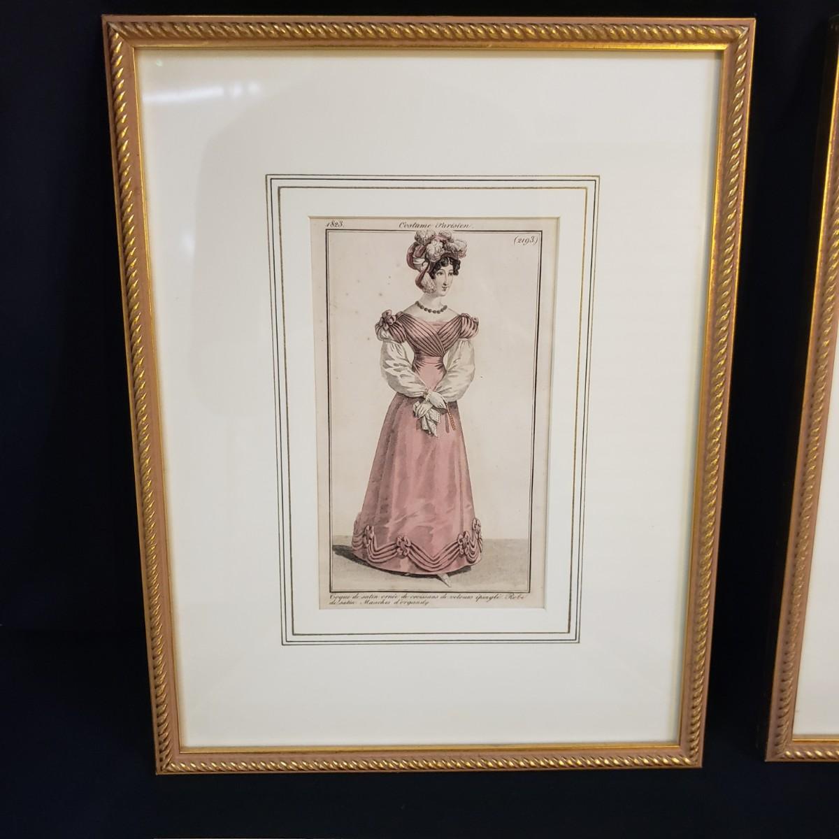 These matching frames with matting contain hand colored pictures of Costumes of Parisians measuring approximately 10.5"x13". They have 1822 and 1823 written on the front. The pictures appear to be in good condition with no chips. The pictures are old and have some discoloring on the paper as seen in the pictures.