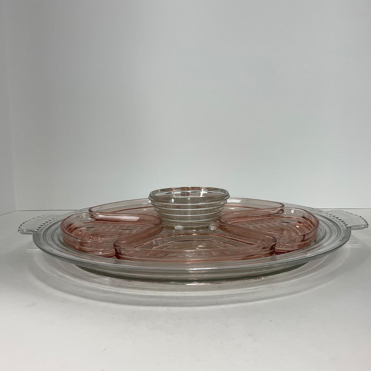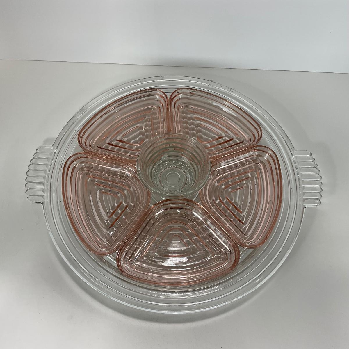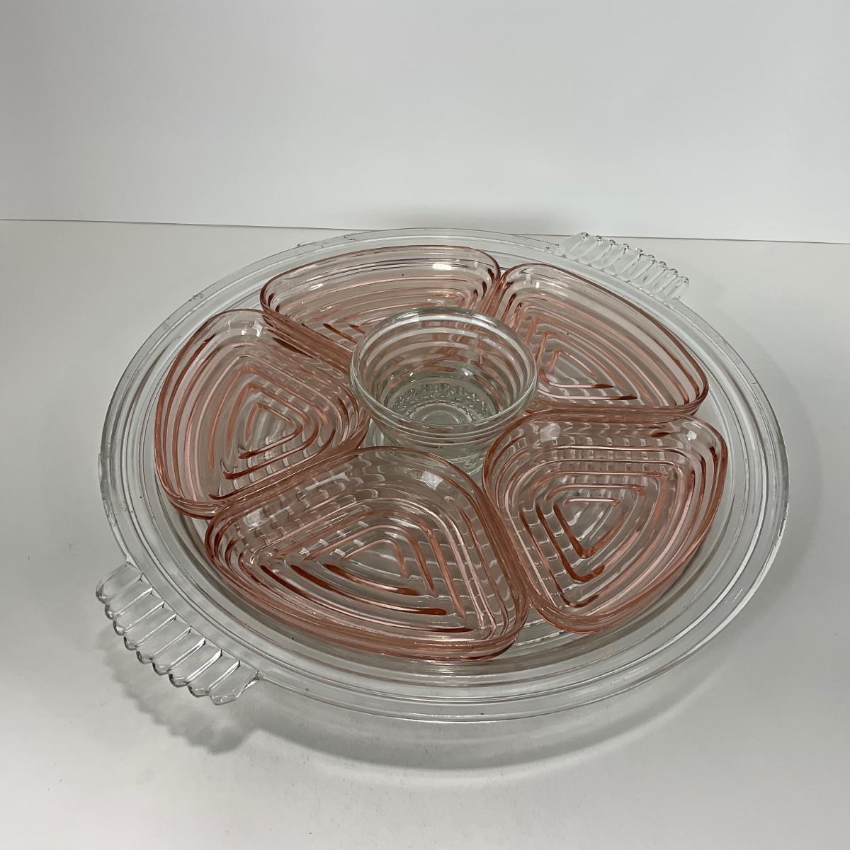 7pc Manhattan Anchor Hocking Glass co. clear glass Relish Insert Set, with five pink glass inserts and one clear glass center bowl. Please see photos for details and condition. ::: Shipping is available on this lot. If you require shipping you must let us know at the close of the auction. We will coordinate with you after the item has been won. Shipping fees will include insurance up to or exceeding the value of all items being mailed. If you have any questions regarding this lot please contact the auctioneer either via this website, by direct email or by phone. PICK UP TIMES and other important information can be found in the TERMS and DESCRIPTION of the auction. Please take a look for pertinent information. Thanks!