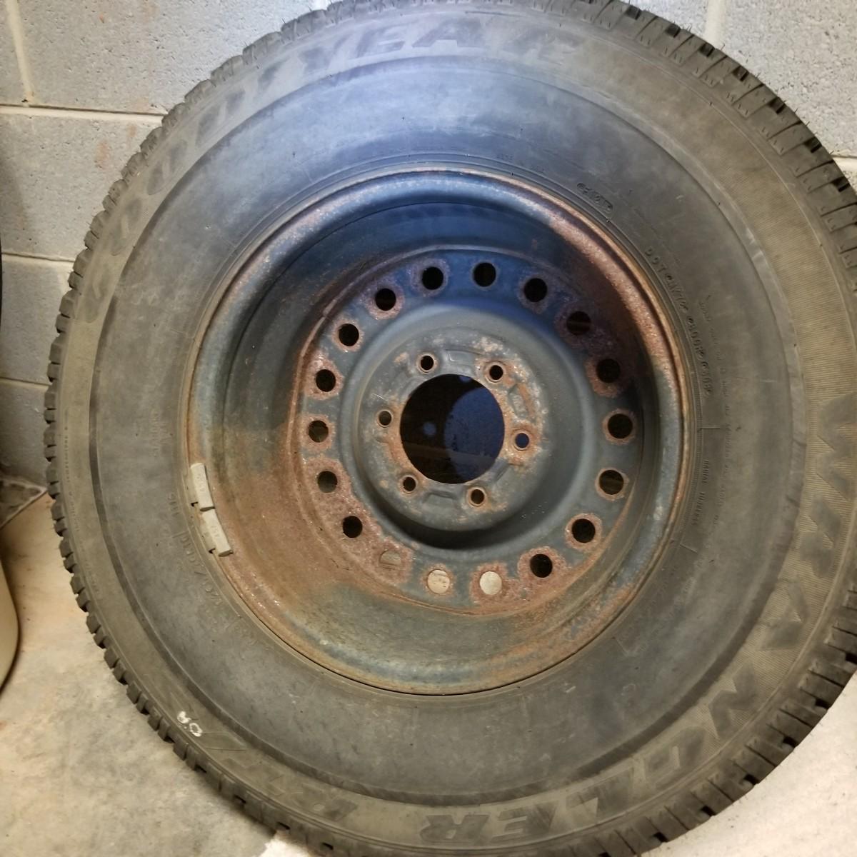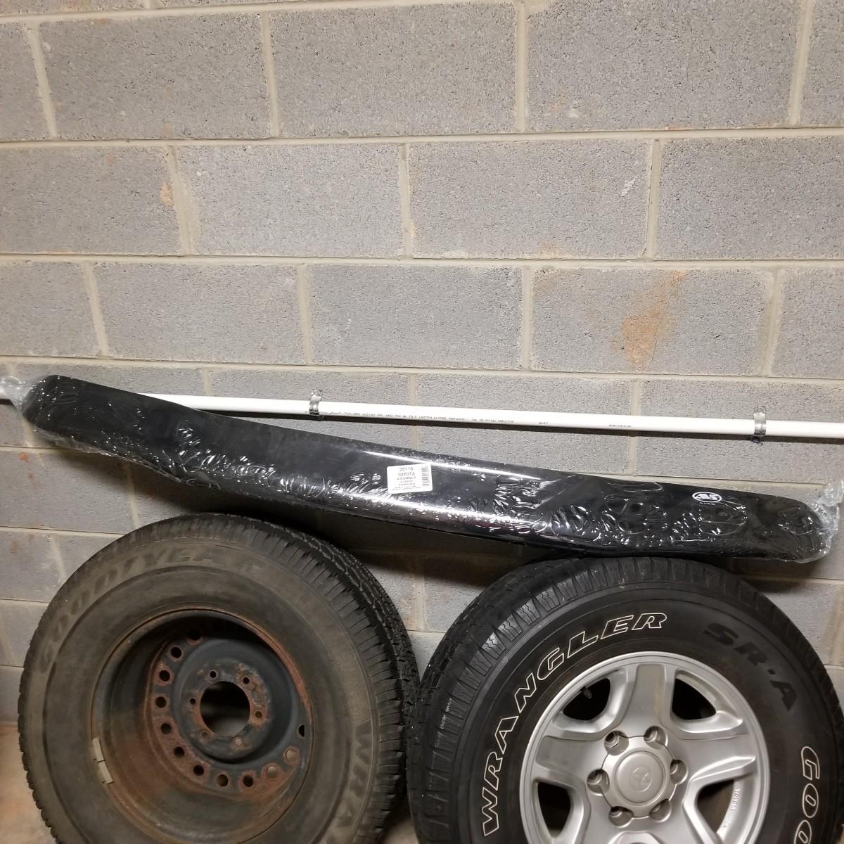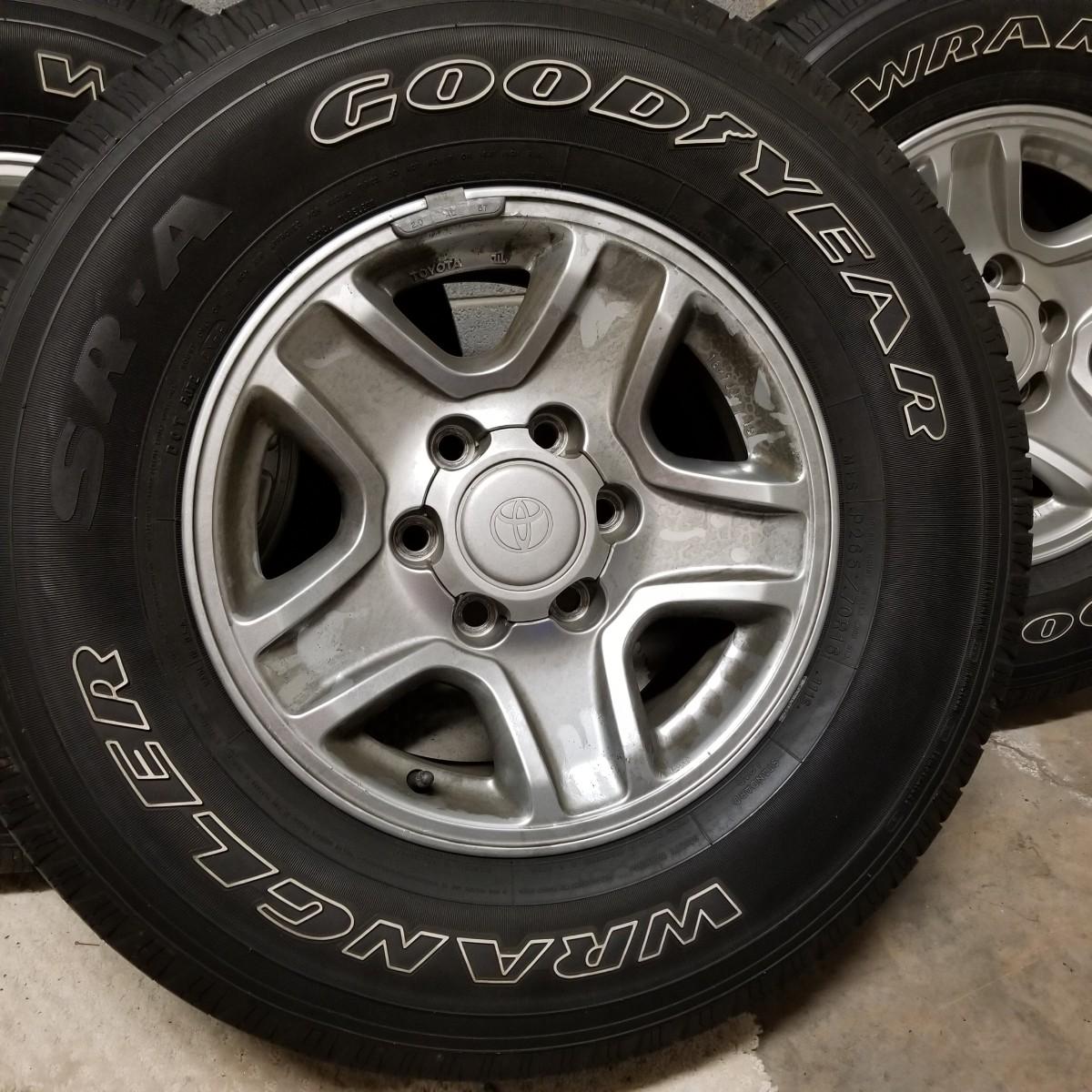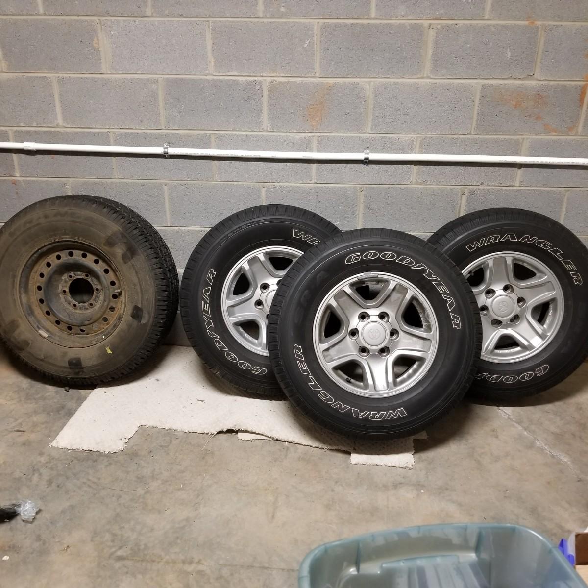 Four used tires and rims. All 265-70R-16 size. Three are Goodyear Wrangler SR-A, mounted on Toyota 6 bolt spoked rims. The fourth tire is a Goodyear Wrangler RT/S mounted on a 6 bolt rim, probably used as a spare. All tires show wear, more on the three SR-A set. See photos for details. Also included is a Toyota 4-Runner wrap shield for conventional hood, new in package. Label says it fits 1996-02 4-door. Local pickup only.