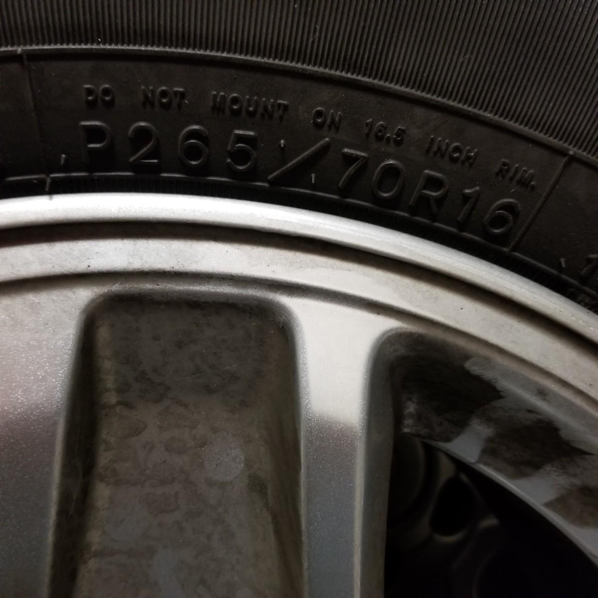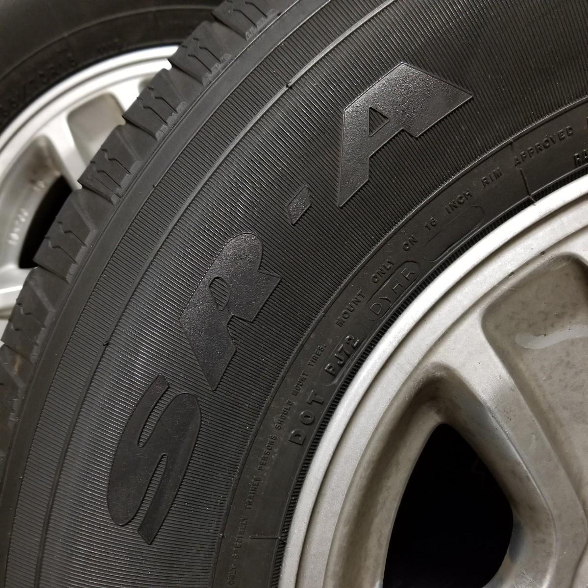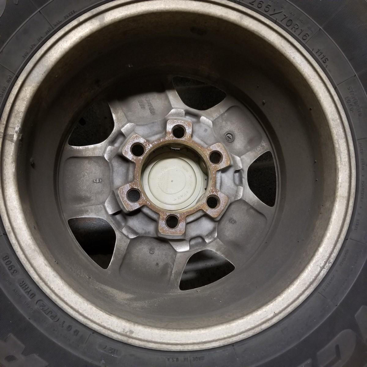 Four used tires and rims. All 265-70R-16 size. Three are Goodyear Wrangler SR-A, mounted on Toyota 6 bolt spoked rims. The fourth tire is a Goodyear Wrangler RT/S mounted on a 6 bolt rim, probably used as a spare. All tires show wear, more on the three SR-A set. See photos for details. Also included is a Toyota 4-Runner wrap shield for conventional hood, new in package. Label says it fits 1996-02 4-door. Local pickup only.