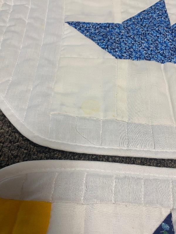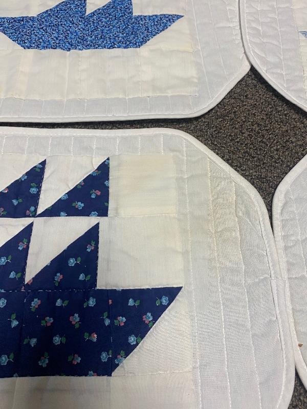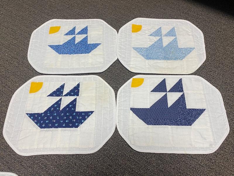 4 Sailboat placemats. These are homemade. The boat and sun design has been added to white placemats. There are some spots and discoloration.