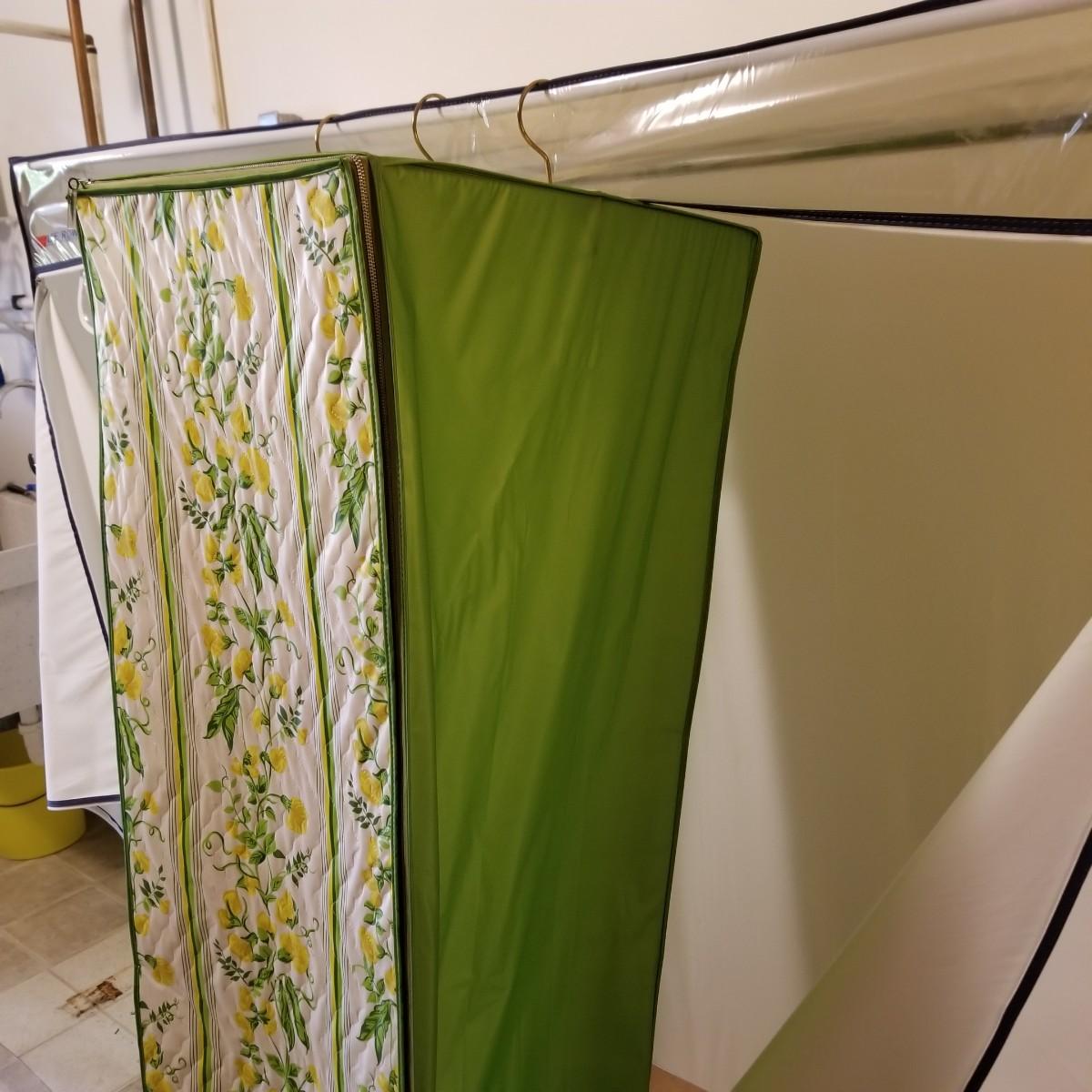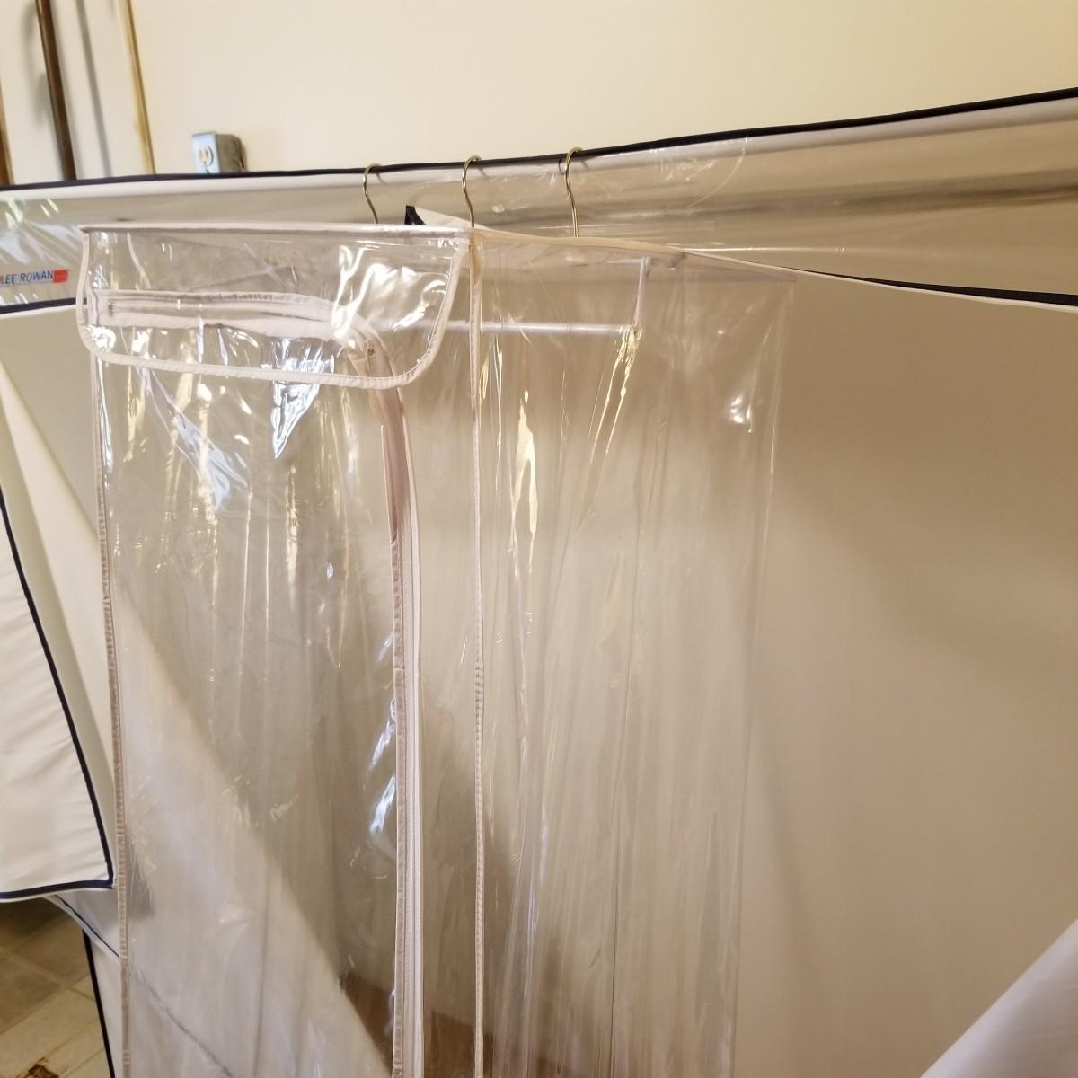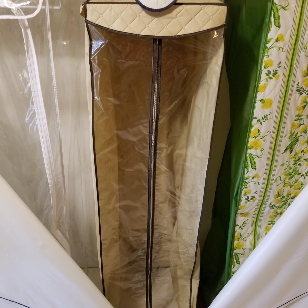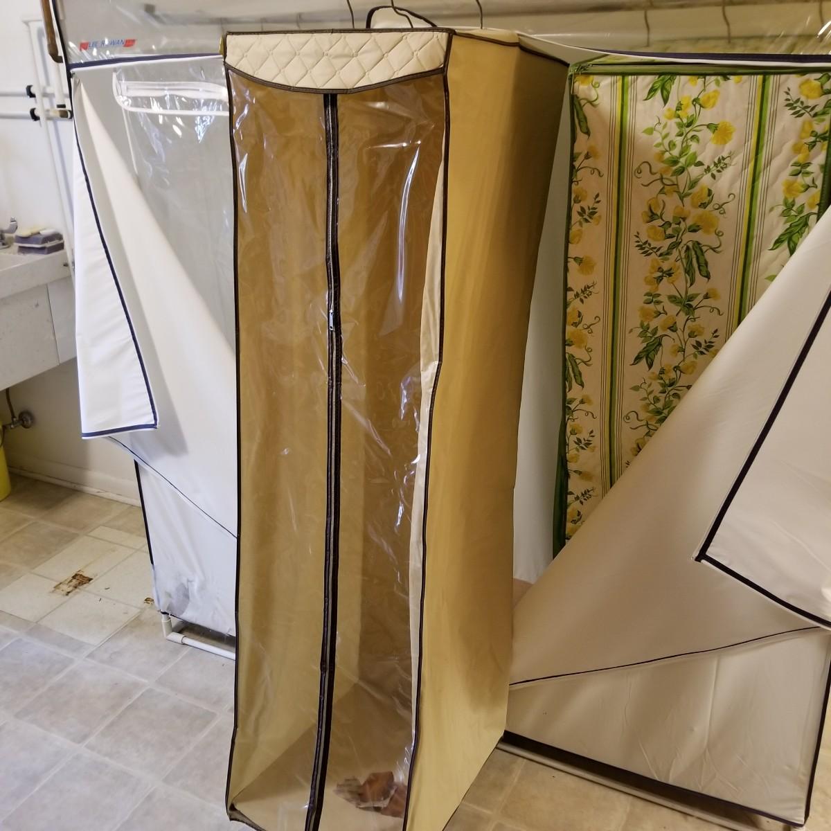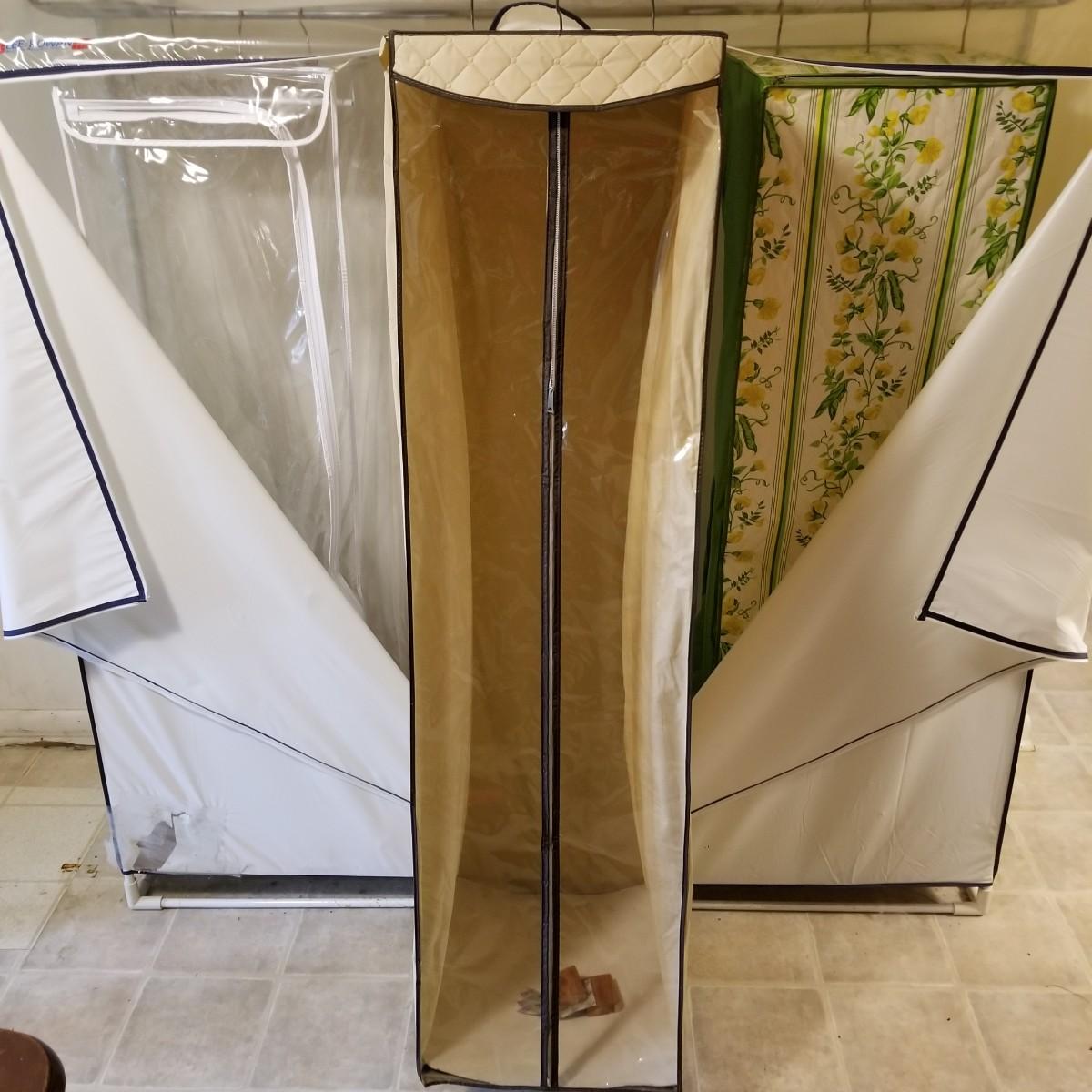 One standalone and three hanging style garment bags. Large piece is on PVC frame and has three way zipper opening. It measures 60" x 21" x 61". The three other bags have inside hanging bars and triple hooks on top for closet or other space. Brown bag is 14" x 20" x 53", green bag is 14" x 20" x 56", clear bag is 15" x 20" x 54". Standalone bag has small tear in lower corner, has been taped. Note that three smaller bags will fit inside the larger one. See photos for details. Some small cedar block and desiccants are included.