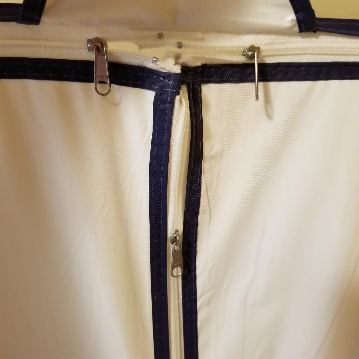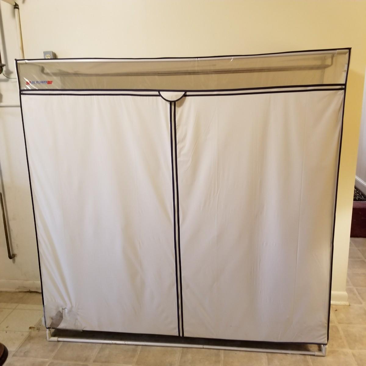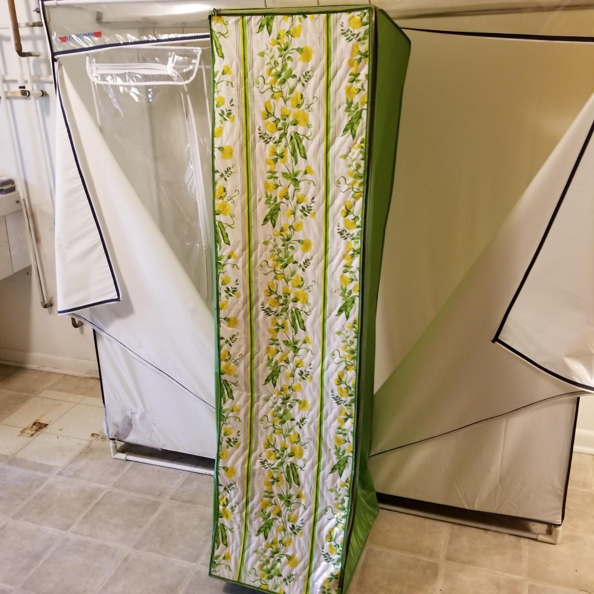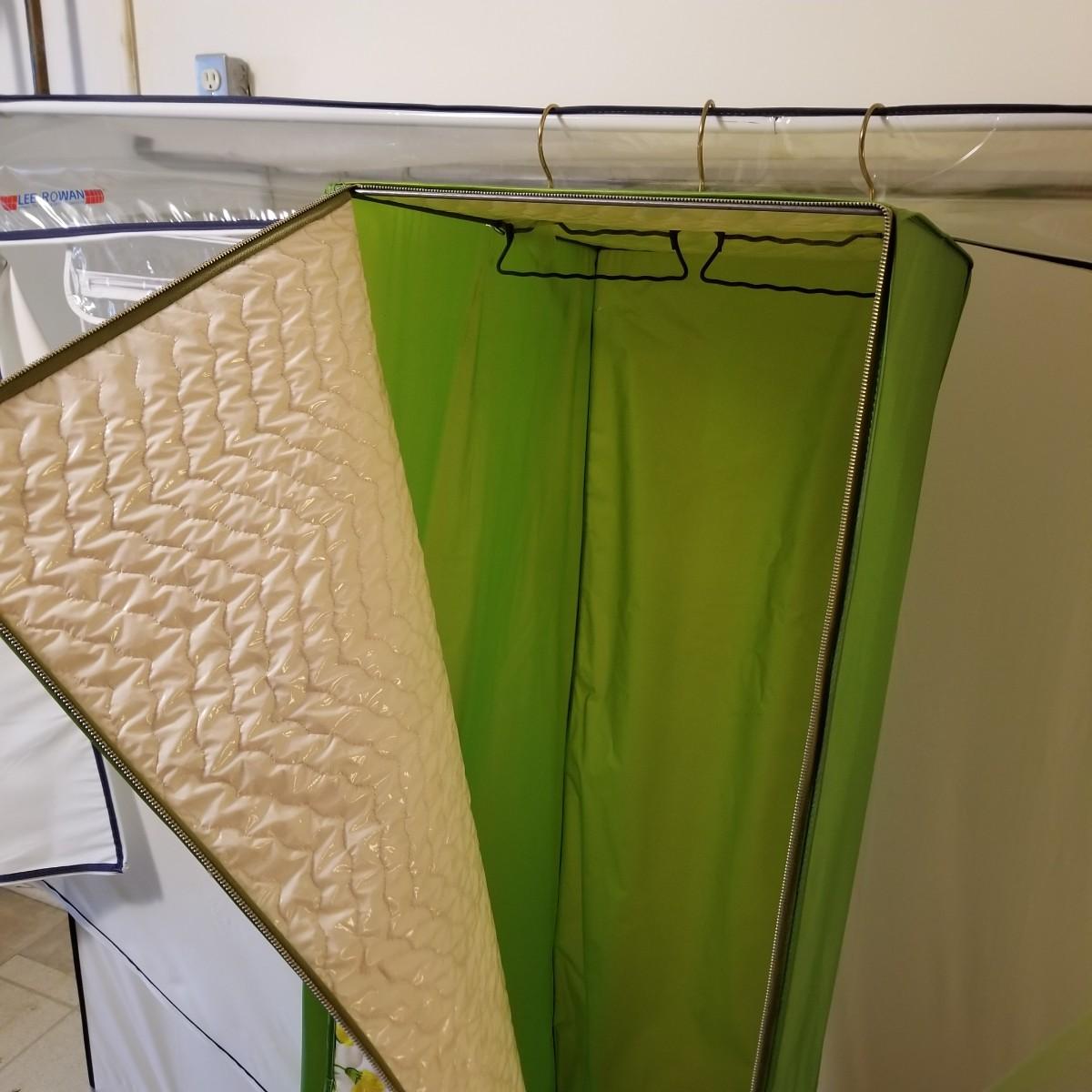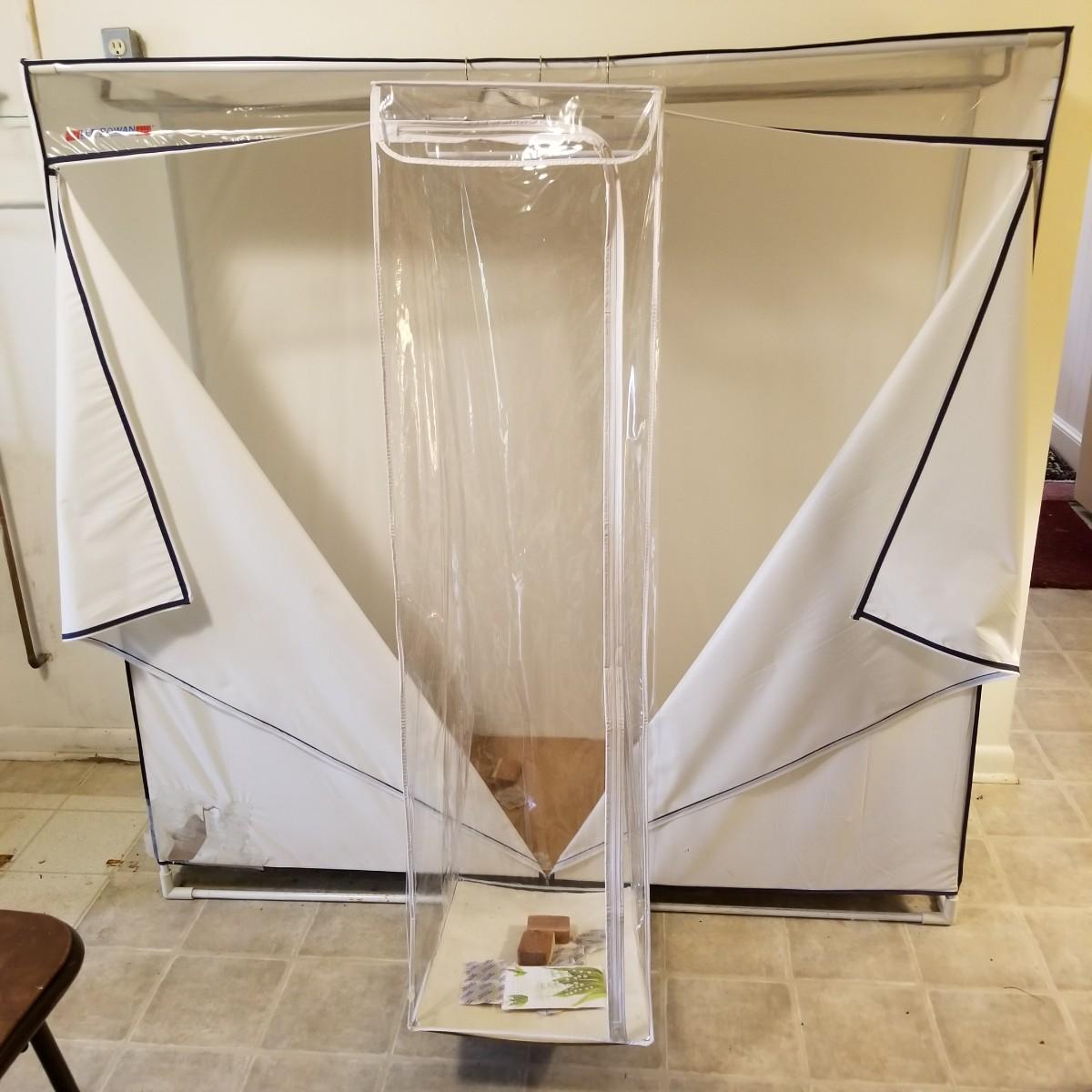 One standalone and three hanging style garment bags. Large piece is on PVC frame and has three way zipper opening. It measures 60" x 21" x 61". The three other bags have inside hanging bars and triple hooks on top for closet or other space. Brown bag is 14" x 20" x 53", green bag is 14" x 20" x 56", clear bag is 15" x 20" x 54". Standalone bag has small tear in lower corner, has been taped. Note that three smaller bags will fit inside the larger one. See photos for details. Some small cedar block and desiccants are included.